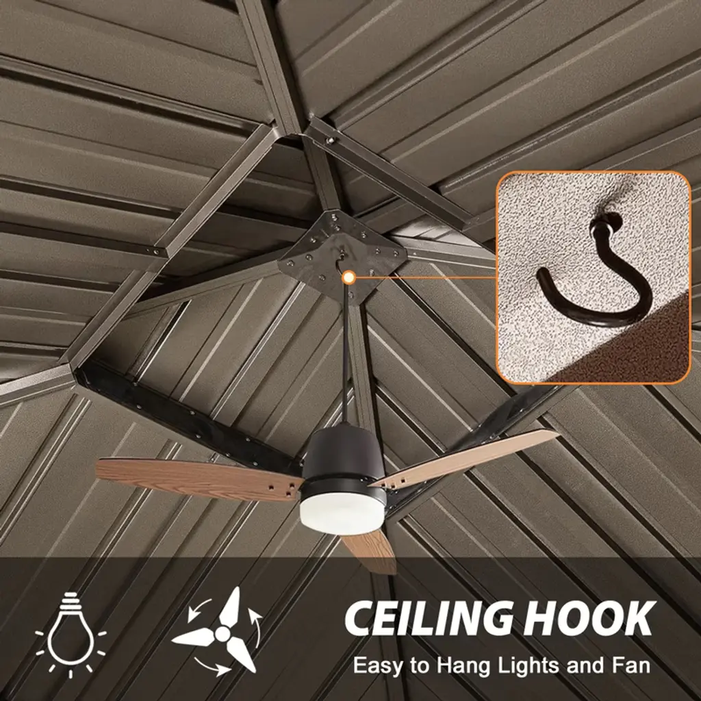 The double roof design improves airflow, keeping you cool. A "J" ceiling hook is included for hanging lights or fans. This shaded area stays breezy even on hot days, perfect for outdoor relaxation. The lightweight frame ensures easy assembly and stability. It resists corrosion, maintaining its appearance year-round. The galvanized steel roof blocks up to 90% of UV rays and supports up to 2500 pounds of snow. It remains steady in wind, ensuring reliability in all seasons. The enclosed sidewalls have a double-layer design with zippered netting and UV-blocking curtains for privacy. The double-track system lets you adjust between airflow, shade, or full closure. Enjoy a bug-free and UV-protected retreat in your backyard.