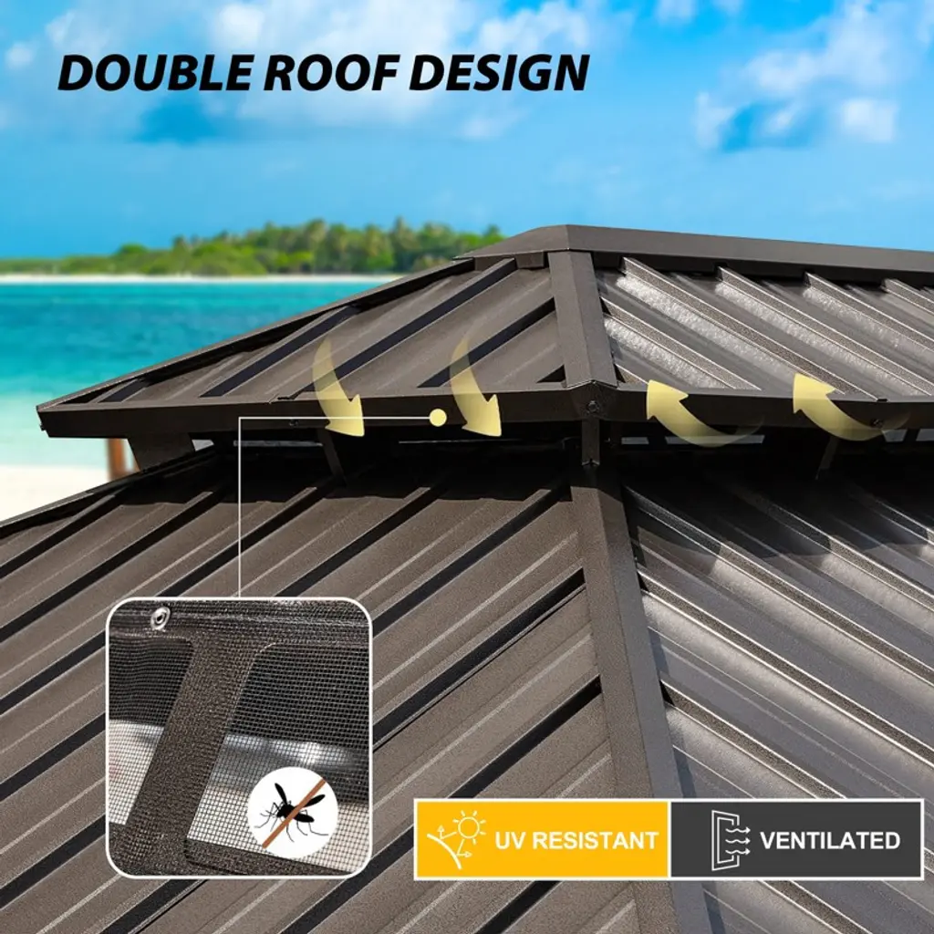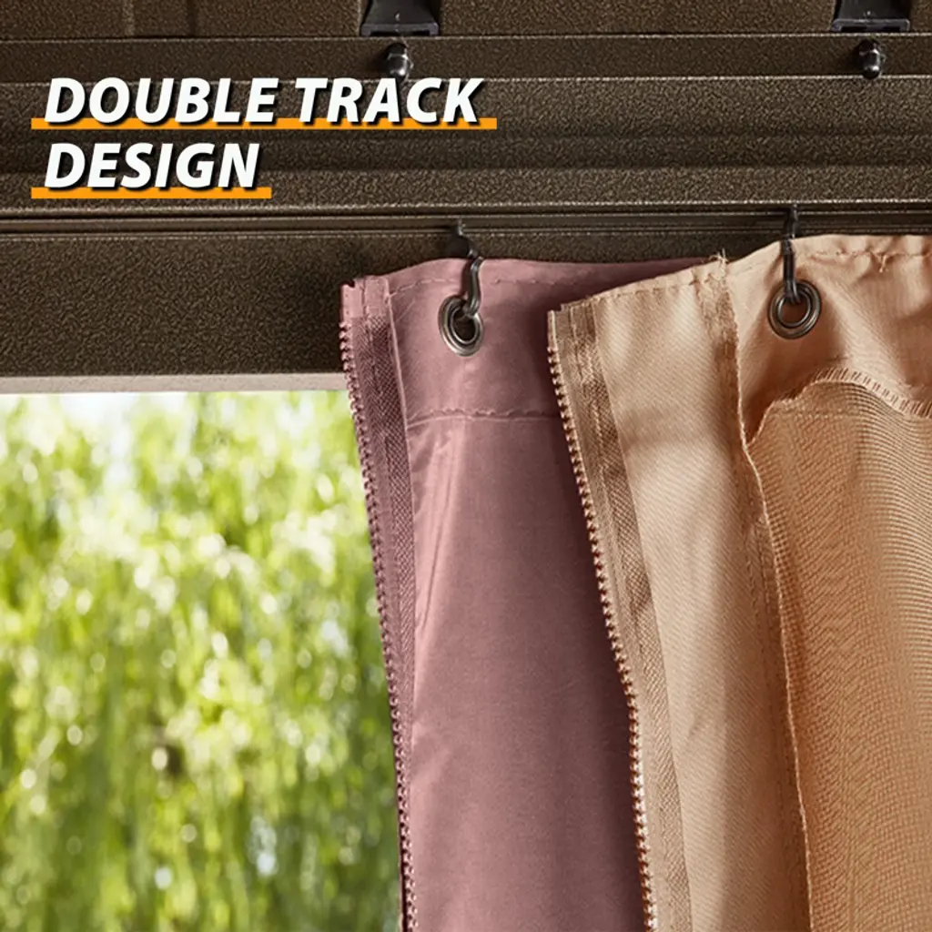 The double roof design improves airflow, keeping you cool. A "J" ceiling hook is included for hanging lights or fans. This shaded area stays breezy even on hot days, perfect for outdoor relaxation. The lightweight frame ensures easy assembly and stability. It resists corrosion, maintaining its appearance year-round. The galvanized steel roof blocks up to 90% of UV rays and supports up to 2500 pounds of snow. It remains steady in wind, ensuring reliability in all seasons. The enclosed sidewalls have a double-layer design with zippered netting and UV-blocking curtains for privacy. The double-track system lets you adjust between airflow, shade, or full closure. Enjoy a bug-free and UV-protected retreat in your backyard.