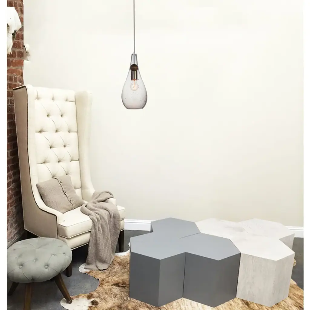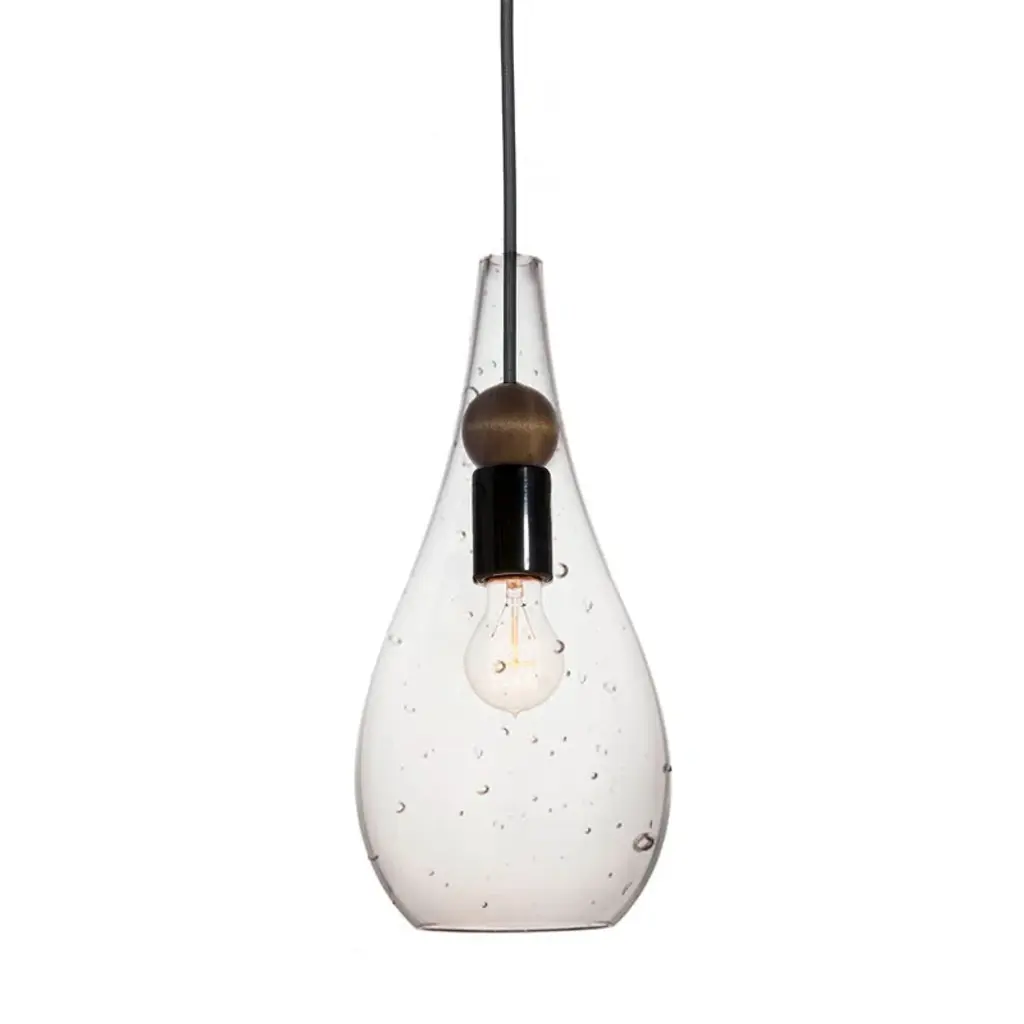 Mini 13” seeded handblown glass shade featuring modern cord. The petite size and teardrop shape add an organic sophistication to any room. Hang a trio above an island, flank a bathroom mirror with a pair, or add a touch of elegance as bedside lights.