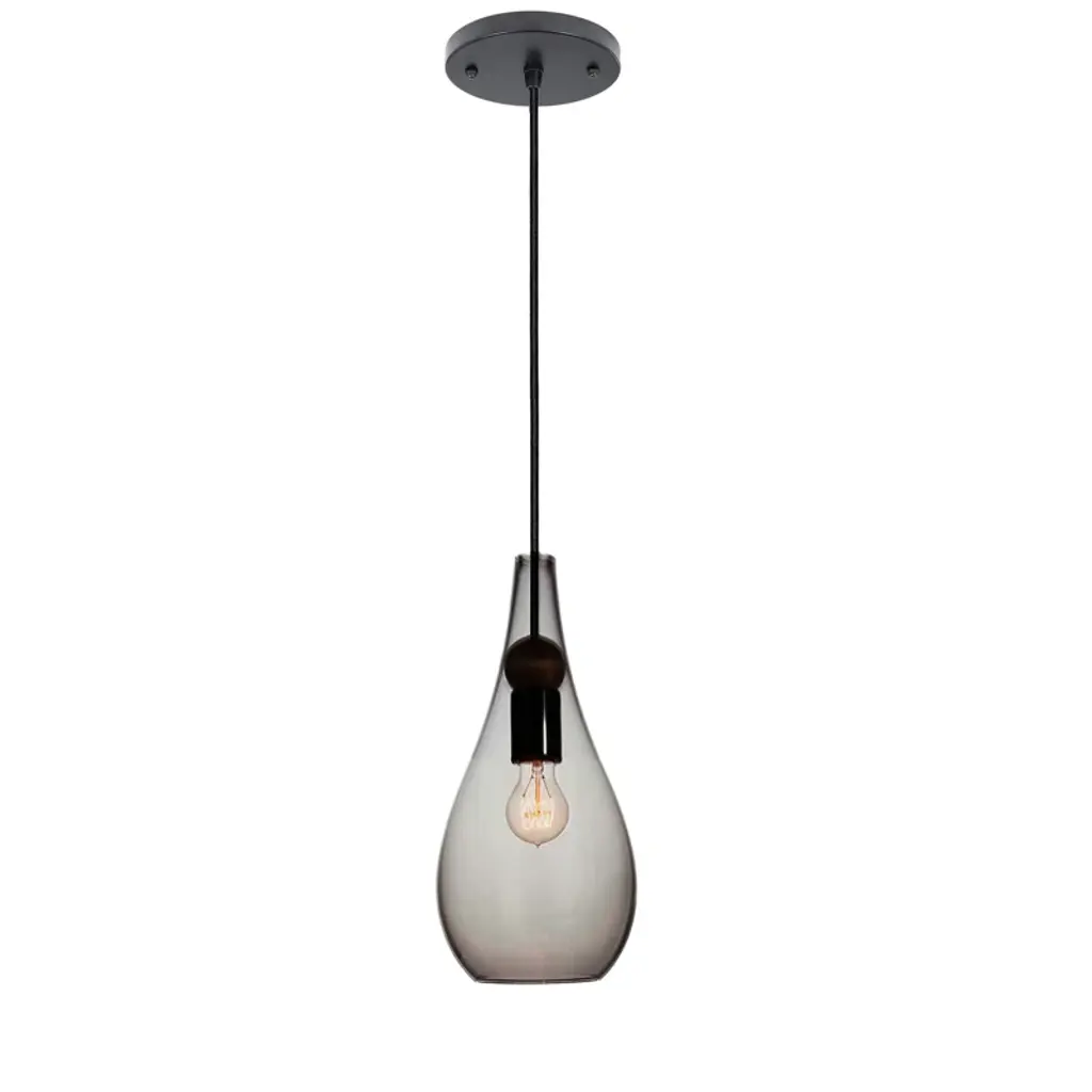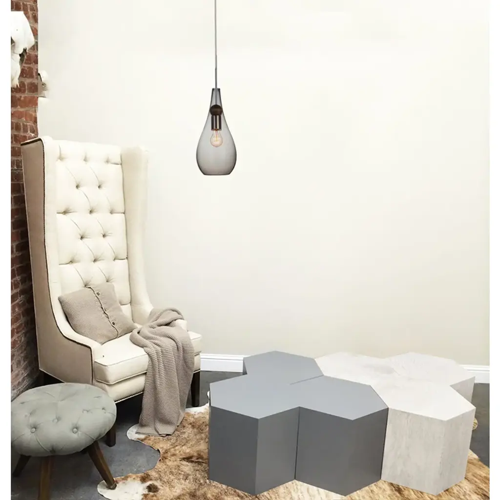 Mini 13” smoke handblown glass shade featuring modern cord. The petite size and teardrop shape add an organic sophistication to any room. Hang a trio above an island, flank a bathroom mirror with a pair, or add a touch of elegance as bedside lights.