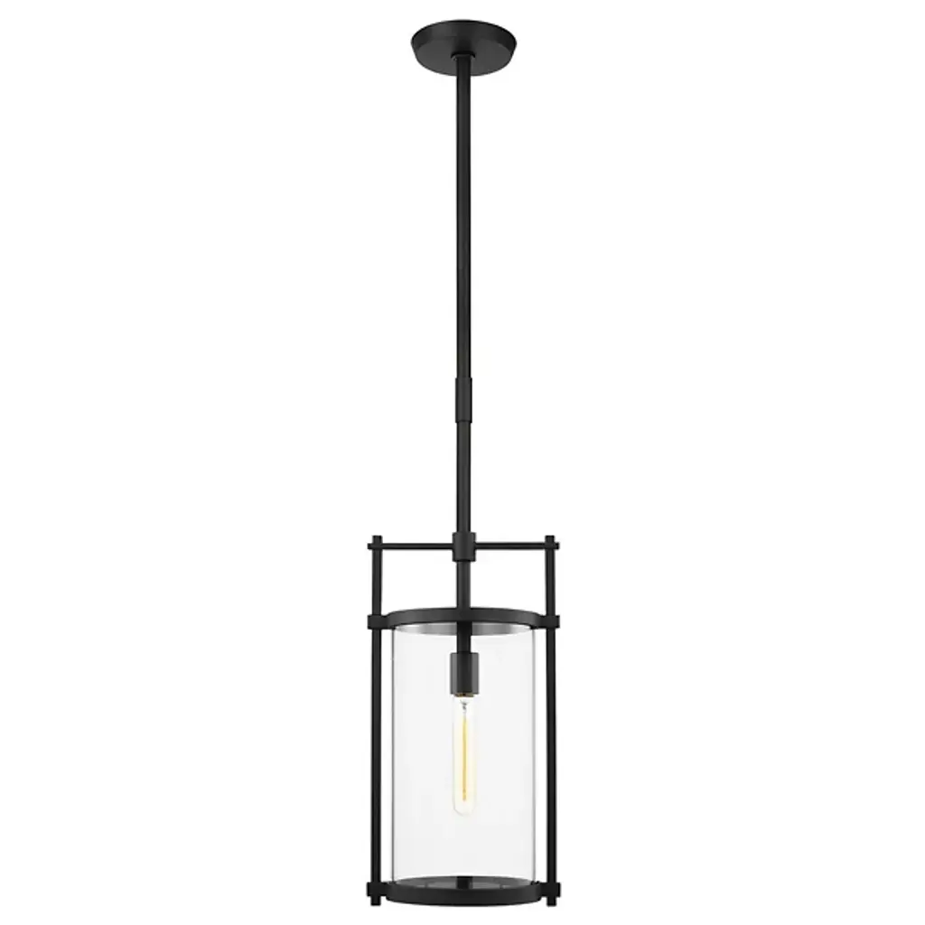 Add a potent glow and an elegant appeal to the Eastham Outdoor Pendant from Visual Comfort Studio, formerly known as Chapman & Myers, Fashioned from robust Stone Strong material, the fixture’s single stem sweeps down, depositing wet-listed lamping inside a cylindrical, clear glass shade framed by ring accents top and bottom, with a parallel bracket to hold it all in place. The glass mutes bright glare to the sides, pouring out a focused spot of downlight below an even, appealing glow.