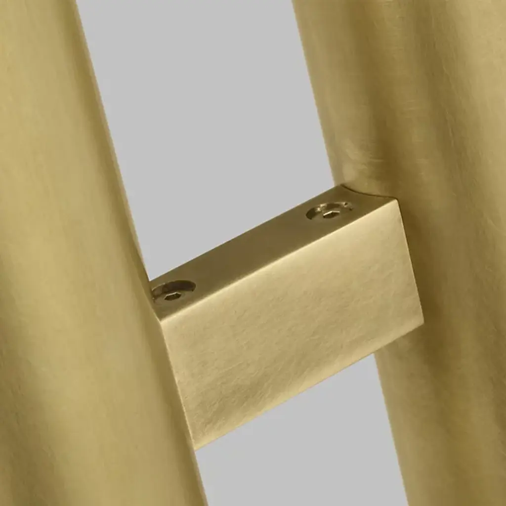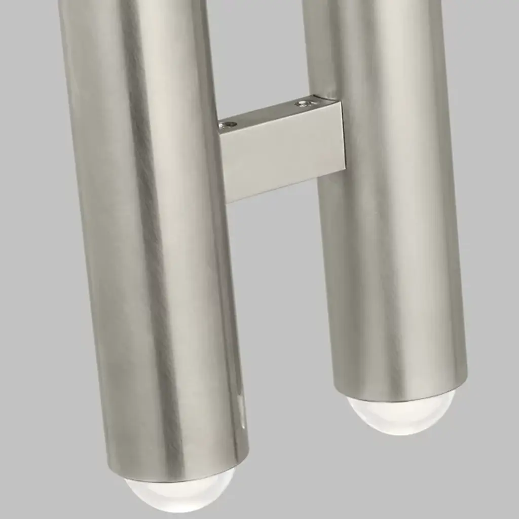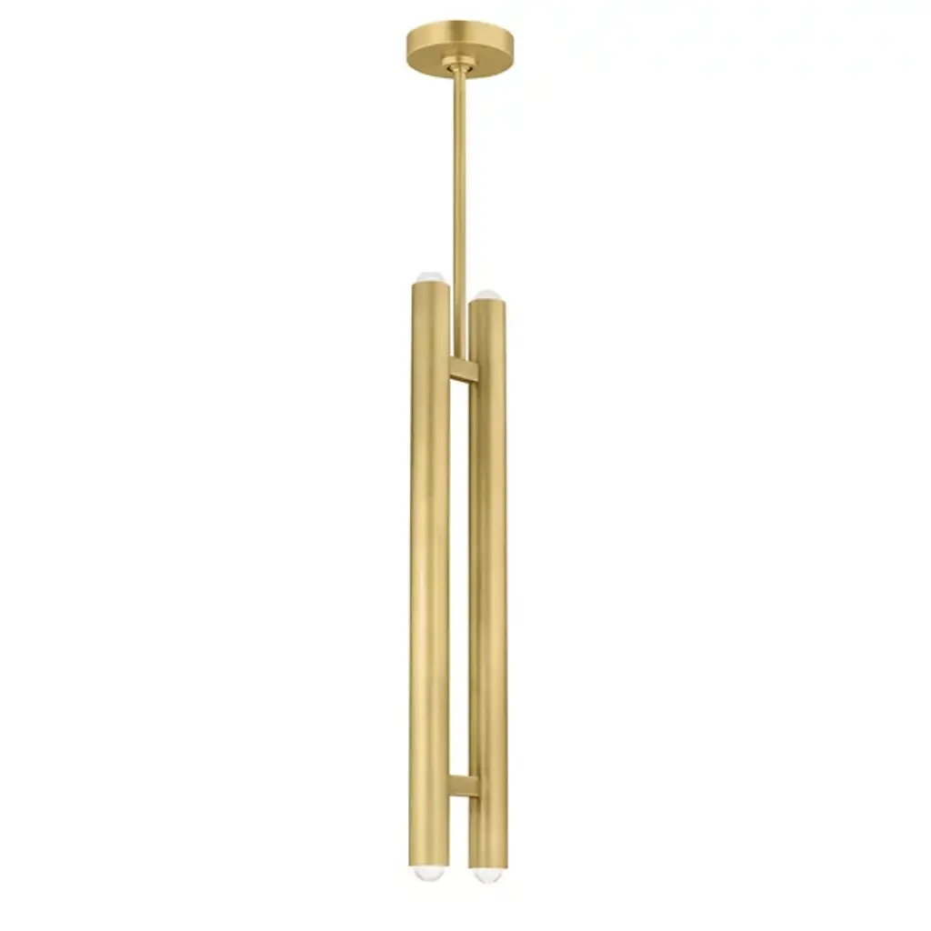 Bring even illumination to high-ceilinged interiors with the refined, dual-lighting design of the Ebell LED Pendant from Kelly Wearstler for Visual Comfort Modern, formerly known as Tech Lighting, It uses natural brass to create a sculptural and expressive silhouette that calls back to mid-century modern design. The piece dispatches a slim down rod from a low-profile ceiling canopy. The down rod stretches down to a short crossbar that secures a vertical cylinder housing at each end. These cylinders contain dimmable LED lamping that translates to up and downlight. An inset dome of laser-etched glass caps off each open end of the housing, mellowing bright glare above and below into a warm, even glow.