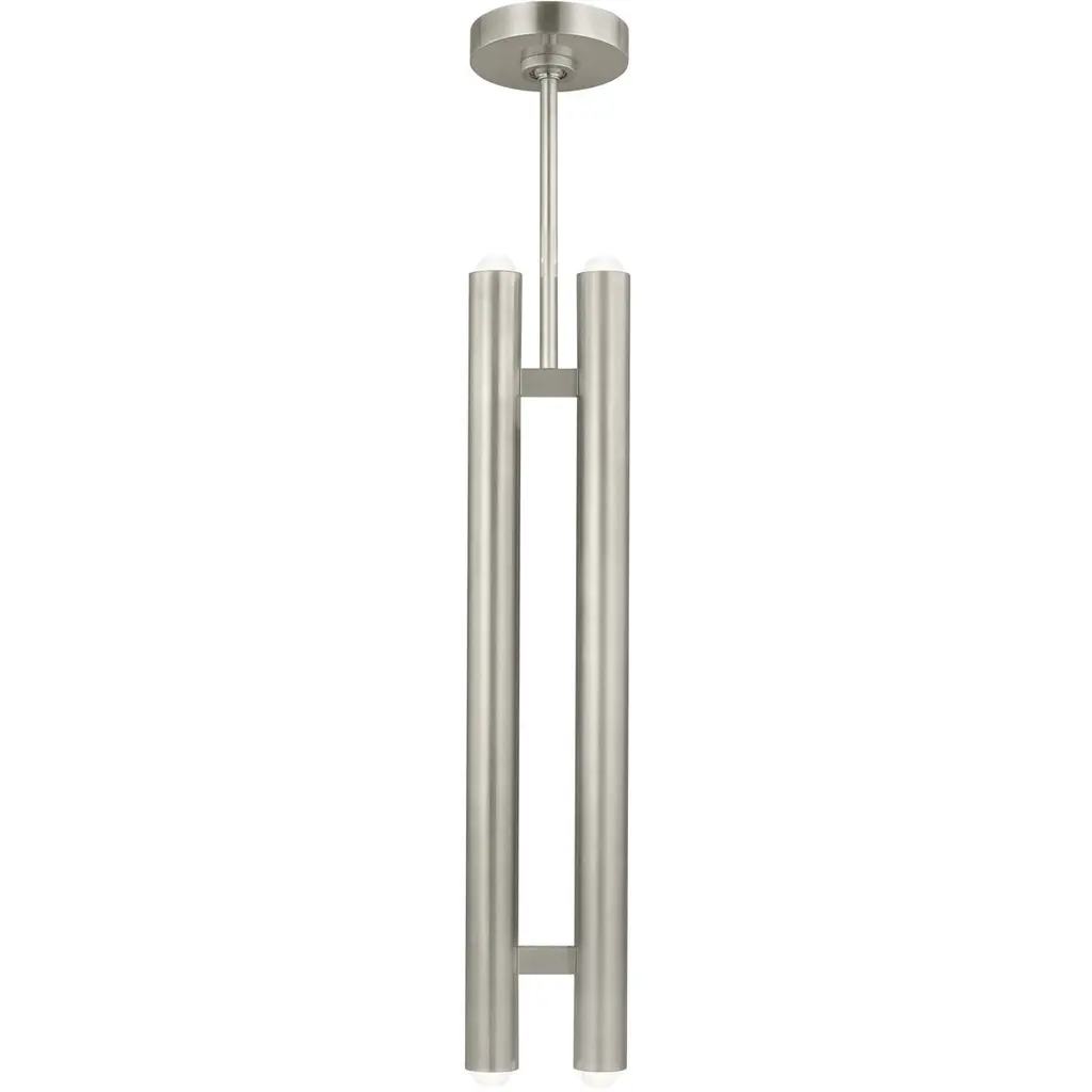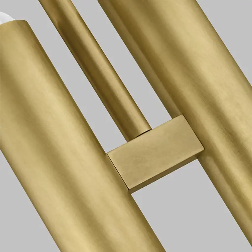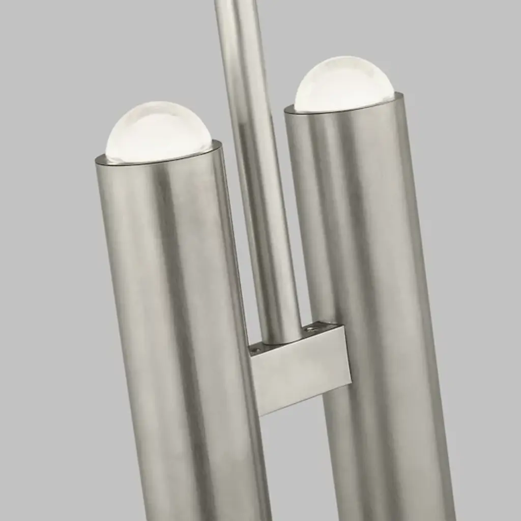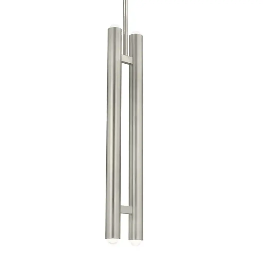 Bring even illumination to high-ceilinged interiors with the refined, dual-lighting design of the Ebell LED Pendant from Kelly Wearstler for Visual Comfort Modern, formerly known as Tech Lighting, It uses natural brass to create a sculptural and expressive silhouette that calls back to mid-century modern design. The piece dispatches a slim down rod from a low-profile ceiling canopy. The down rod stretches down to a short crossbar that secures a vertical cylinder housing at each end. These cylinders contain dimmable LED lamping that translates to up and downlight. An inset dome of laser-etched glass caps off each open end of the housing, mellowing bright glare above and below into a warm, even glow.