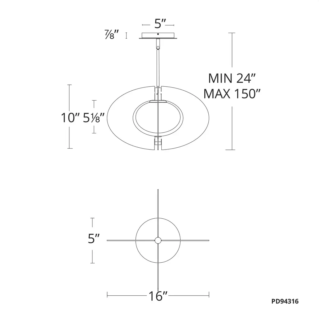 Contemporary composition. Spherical etched opal glass is perfectly bisected by lustrous planes of metal, creating a halo of bright LED light.