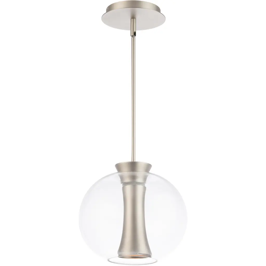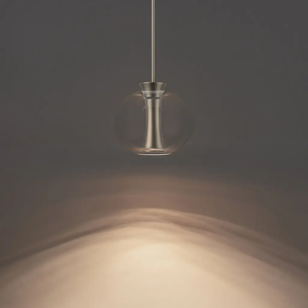 The Echo mini pendant is an all-LED brushed nickel luminaire from dweLED by WAC. Decorative orb integrating a uniquely formed spot for a truly celestial look. Like a bubble floating in air. The clear glass shade includes a downlight. Ideal for grouping together to illuminate a table in a dining room, a bar in a lounge, an island in a kitchen or any other spaces where you want to make an exceptional design statement. This mini pendant illuminates using ACLED driverless technology that features a high 90 color rendering index and a CCT of 3000 Kelvin. The LEDs have a very long 73,000 hour rated life. Echo operates on 120V and uses just 11 watts delivering over 360 lumens. This LED luminaire is ETL and cETL listed for damp locations. It is California Title 24 rated for the highest energy efficient requirements today. Dims down nicely with an electronic low voltage or TRIAC dimming system. Three 12-inch downrods and one 6-inch down rods are included. A spin-on round canopy with minimal hardware can be mounted on a sloped ceiling.