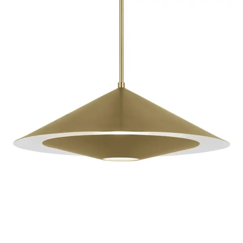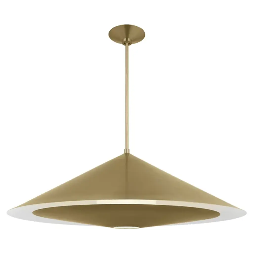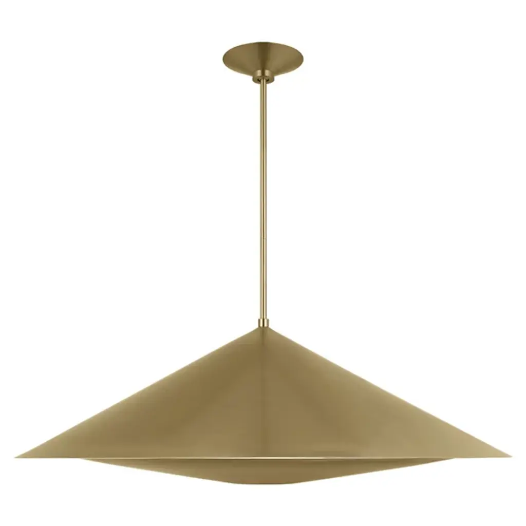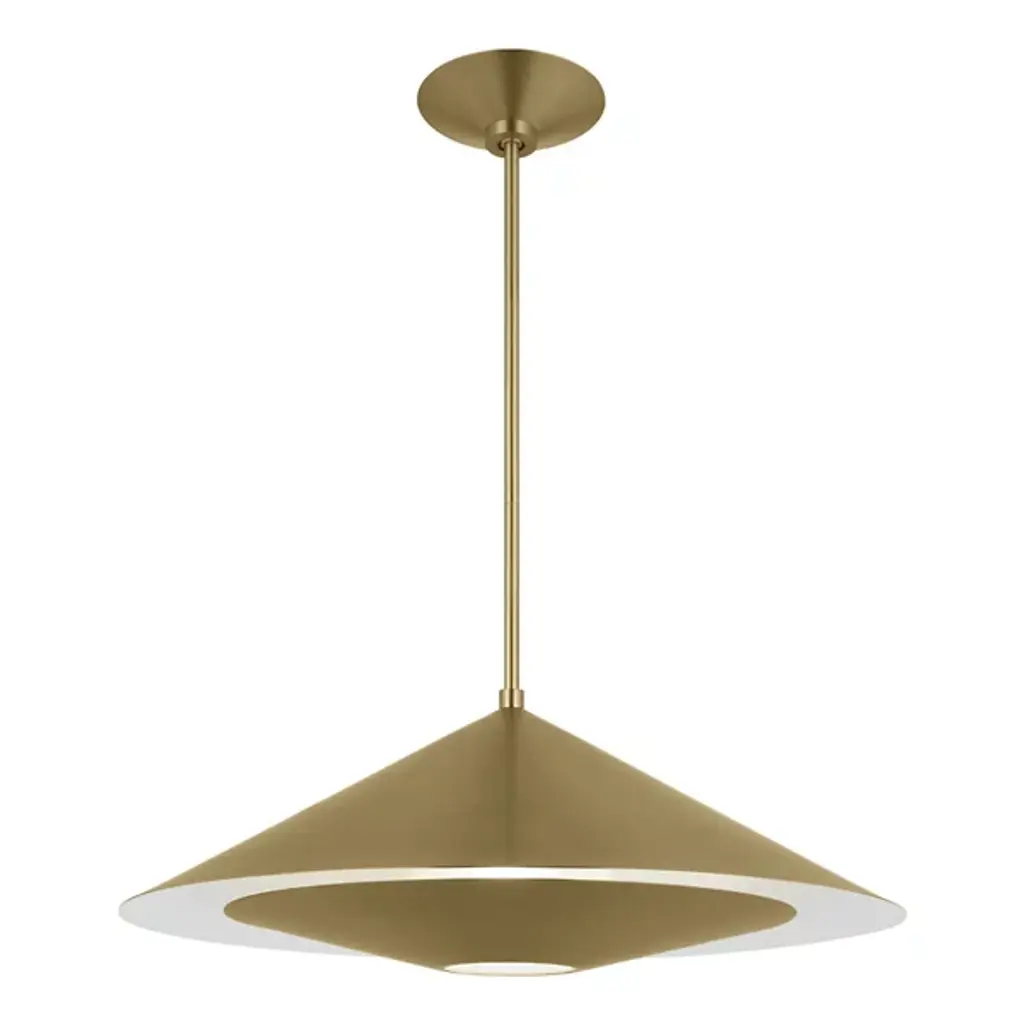 The Echo Pendant from Visual Comfort Studio offers a captivating retro presence made using simple geometric shapes. This Kelly Wearstler design leans into her synthesis of modern and vintage elements, using a broad conical shade overlapping an inverted dish that caps its open base. A glass diffuser with a sandblasted interior and a clean exterior cuts bright glare to the sides, transforming direct light into a generous glow that burnishes the layered metal shade around it, appearing to float when illuminated.