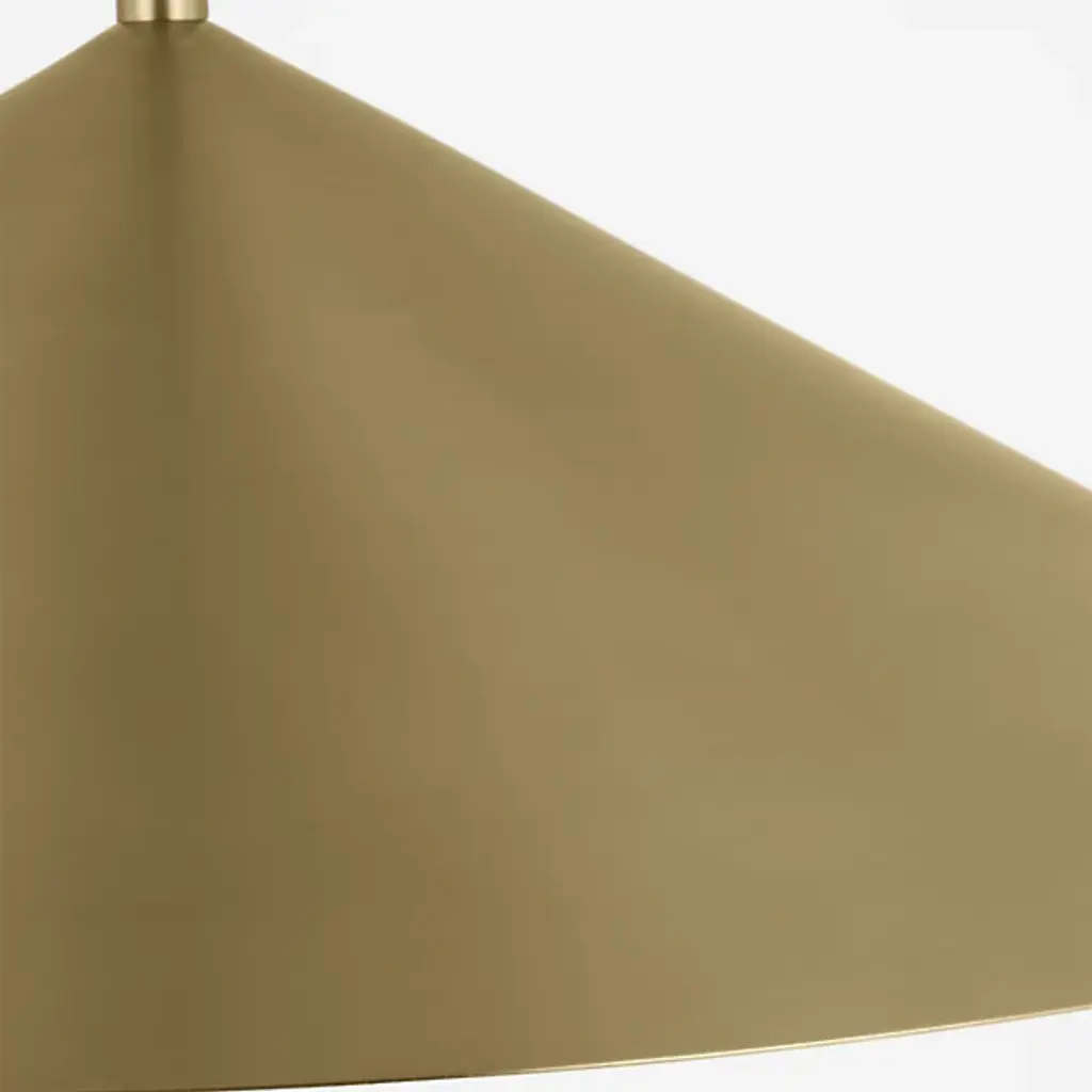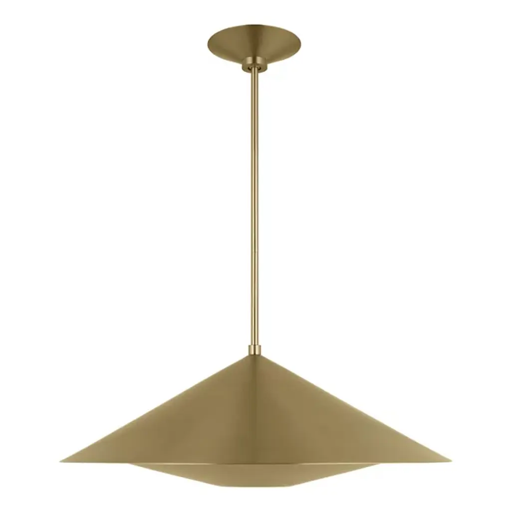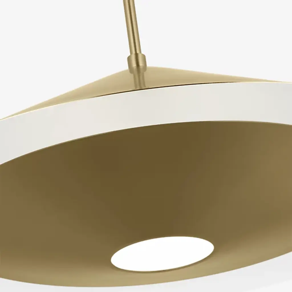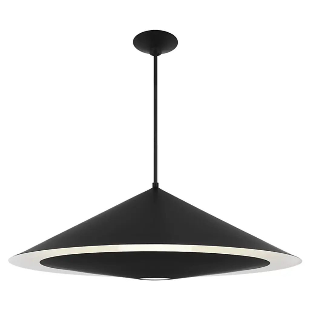 The Echo Pendant from Visual Comfort Studio offers a captivating retro presence made using simple geometric shapes. This Kelly Wearstler design leans into her synthesis of modern and vintage elements, using a broad conical shade overlapping an inverted dish that caps its open base. A glass diffuser with a sandblasted interior and a clean exterior cuts bright glare to the sides, transforming direct light into a generous glow that burnishes the layered metal shade around it, appearing to float when illuminated.