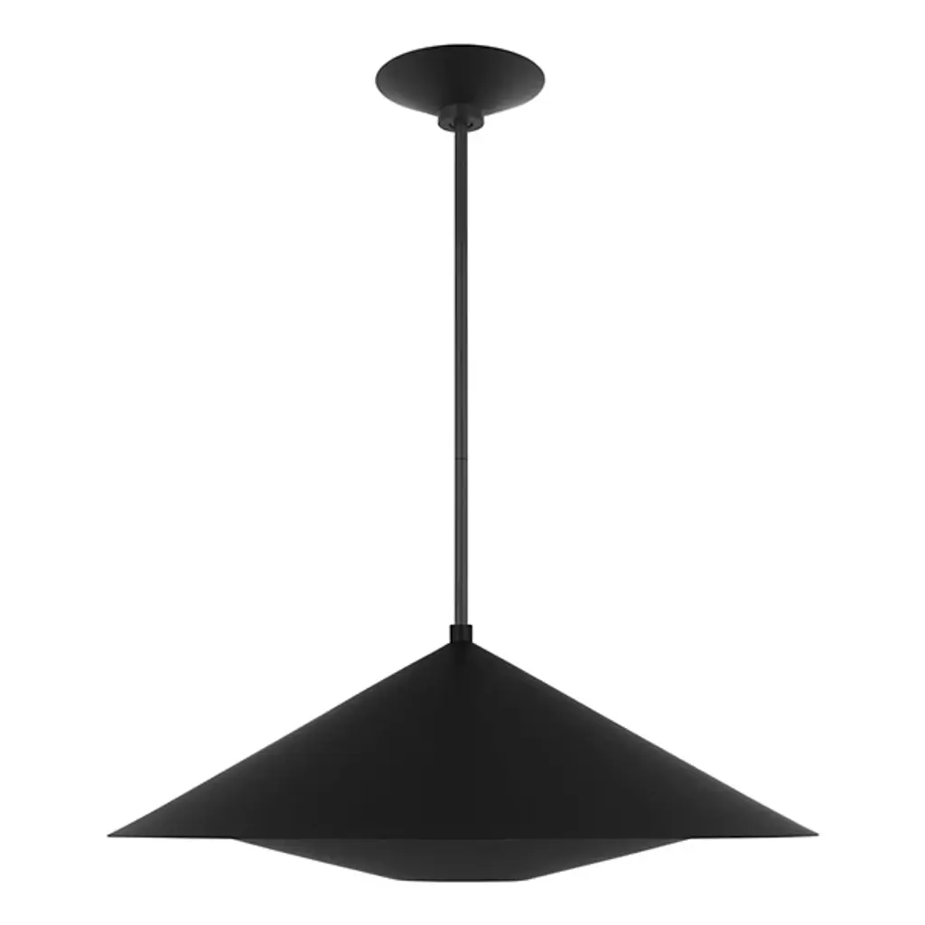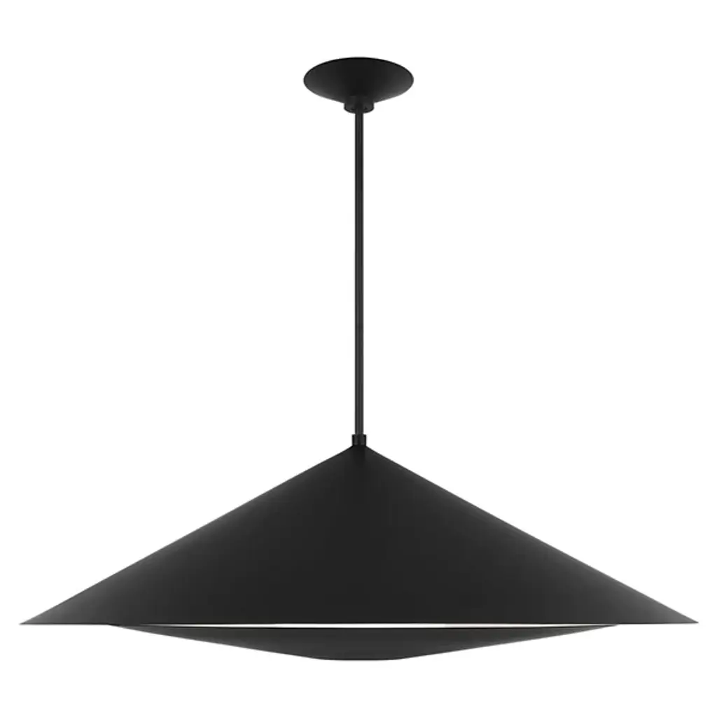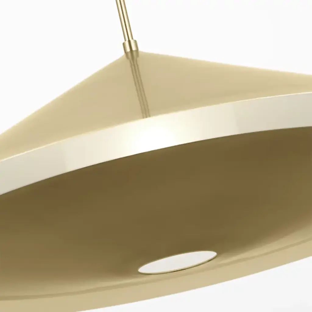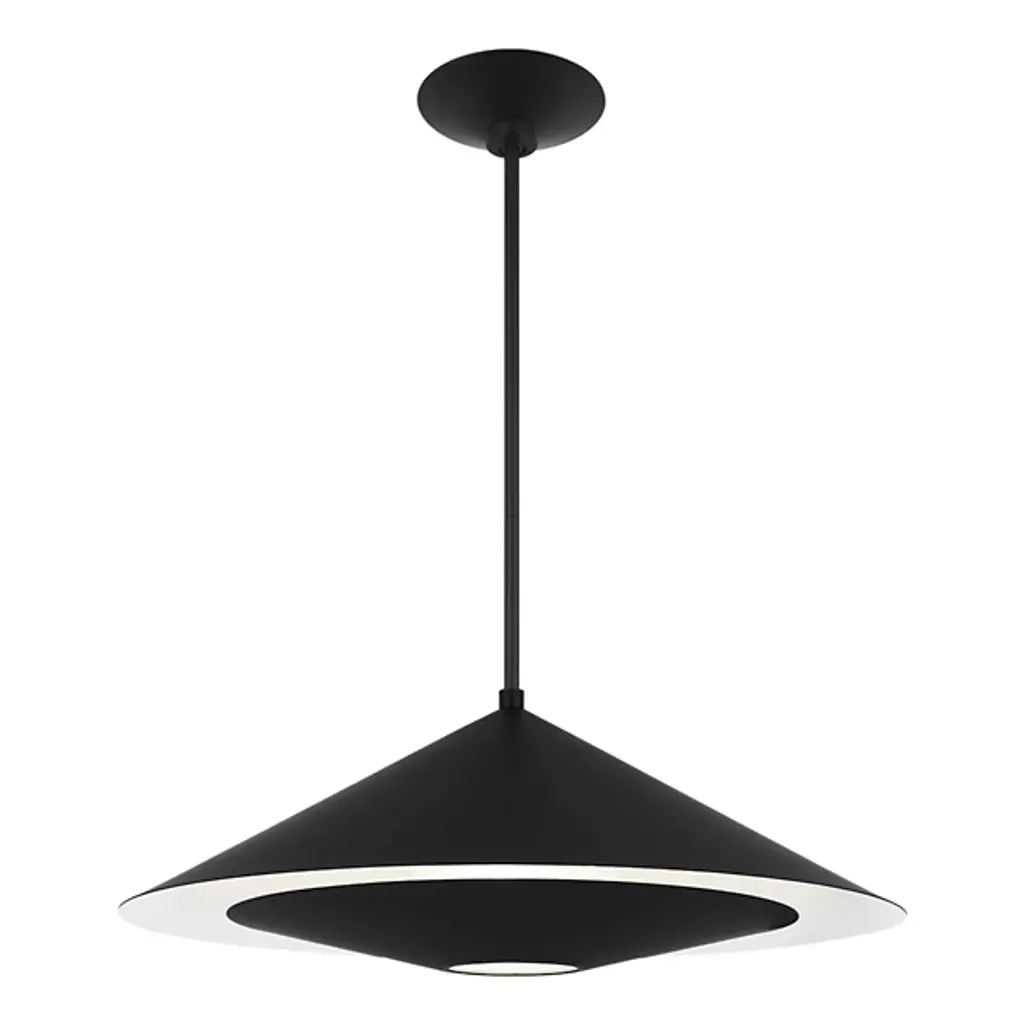 The Echo Pendant from Visual Comfort Studio offers a captivating retro presence made using simple geometric shapes. This Kelly Wearstler design leans into her synthesis of modern and vintage elements, using a broad conical shade overlapping an inverted dish that caps its open base. A glass diffuser with a sandblasted interior and a clean exterior cuts bright glare to the sides, transforming direct light into a generous glow that burnishes the layered metal shade around it, appearing to float when illuminated.