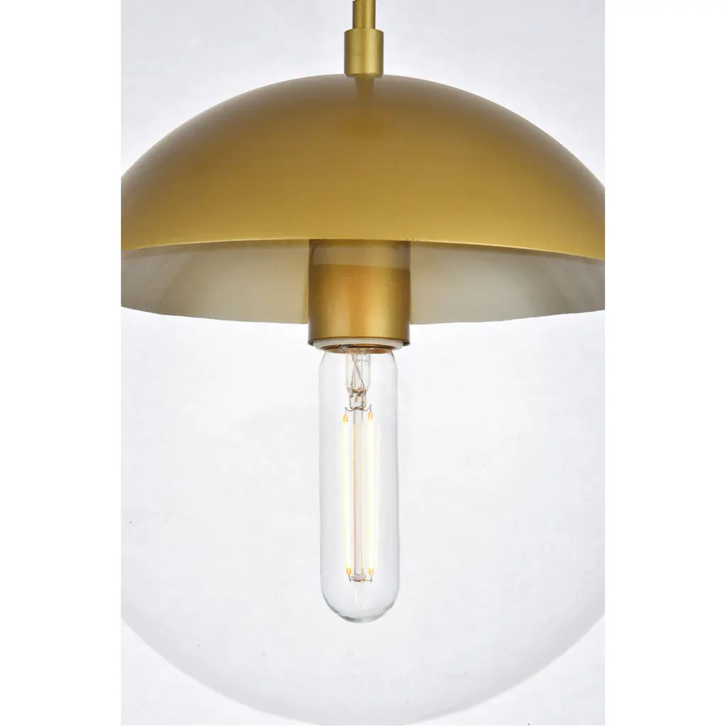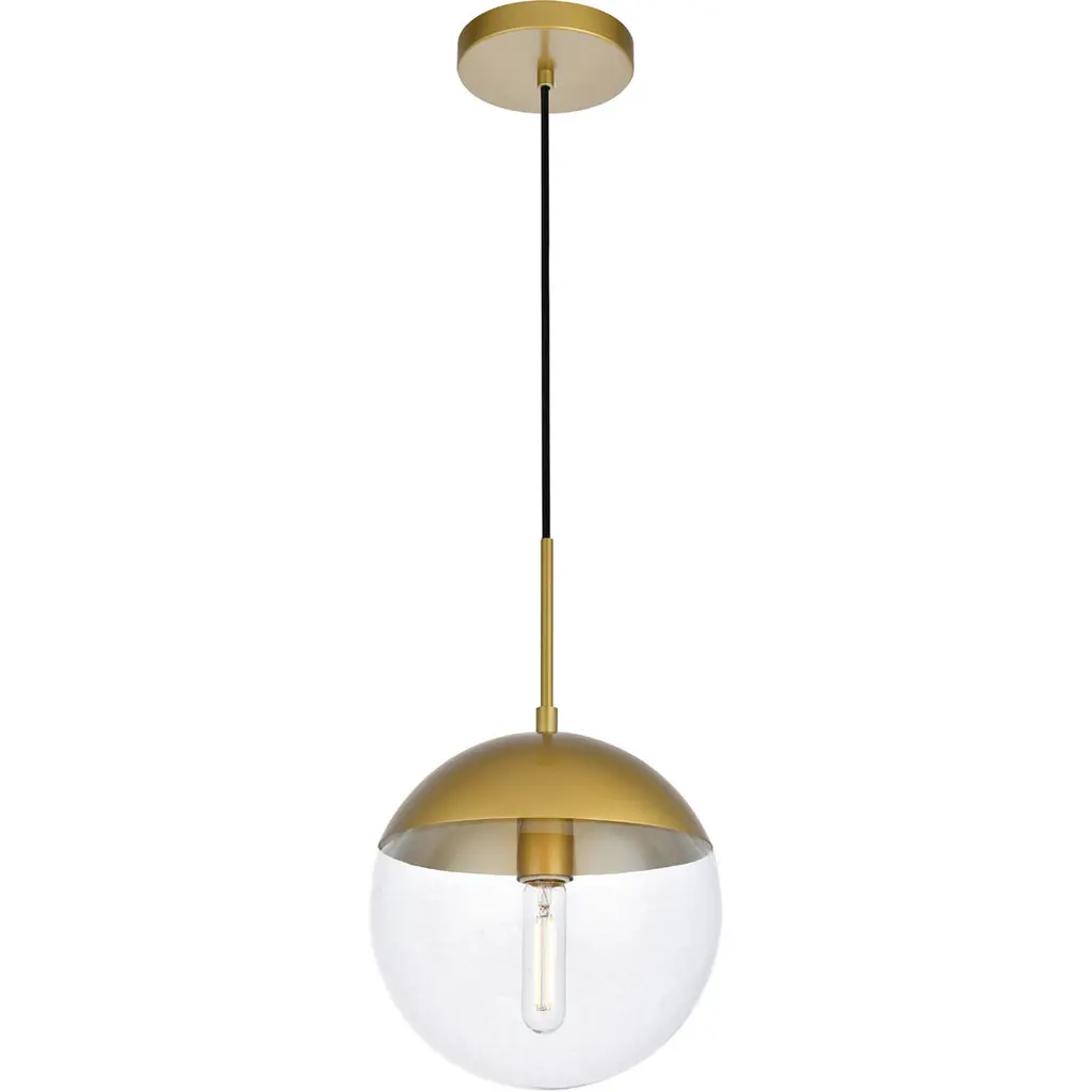 Refined style with a practical design, Eclipse hanging pendant lamps bring cosmopolitan sophistication anywhere, especially to an entryway, office, bathroom, bedroom, or kitchen. The smooth iron frame features a disk-shaped canopy and comes in a brass finish. An adjustable black cord allows you to vary the hanging height from 18 to 65 inches. A touch of color on top of the clear spherical glass shade brings character to this classic style. Living in the big city has never been this easy.
