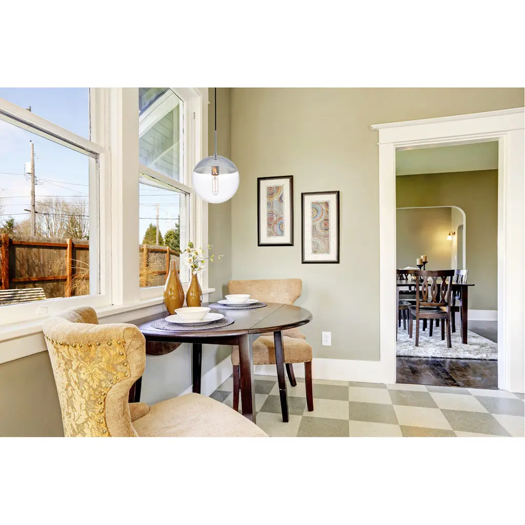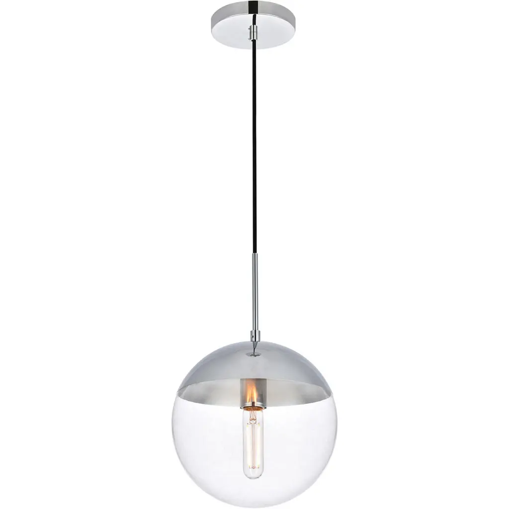 Refined style with a practical design, Eclipse hanging pendant lamps bring cosmopolitan sophistication anywhere, especially to an entryway, office, bathroom, bedroom, or kitchen. The smooth iron frame features a disk-shaped canopy and comes in a chrome finish. An adjustable black cord allows you to vary the hanging height from 18 to 65 inches. A touch of color on top of the clear spherical glass shade brings character to this classic style. Living in the big city has never been this easy.