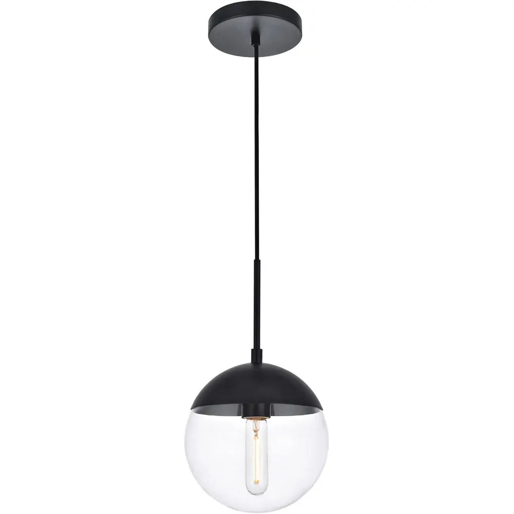 Refined style with a practical design, Eclipse hanging pendant lamps bring cosmopolitan sophistication anywhere, especially to an entryway, office, bathroom, bedroom, or kitchen. The smooth iron frame features a disk-shaped canopy and comes in a black finish. An adjustable black cord allows you to vary the hanging height from 16 to 63 inches. A touch of color on top of the clear spherical glass shade brings character to this classic style. Living in the big city has never been this easy.