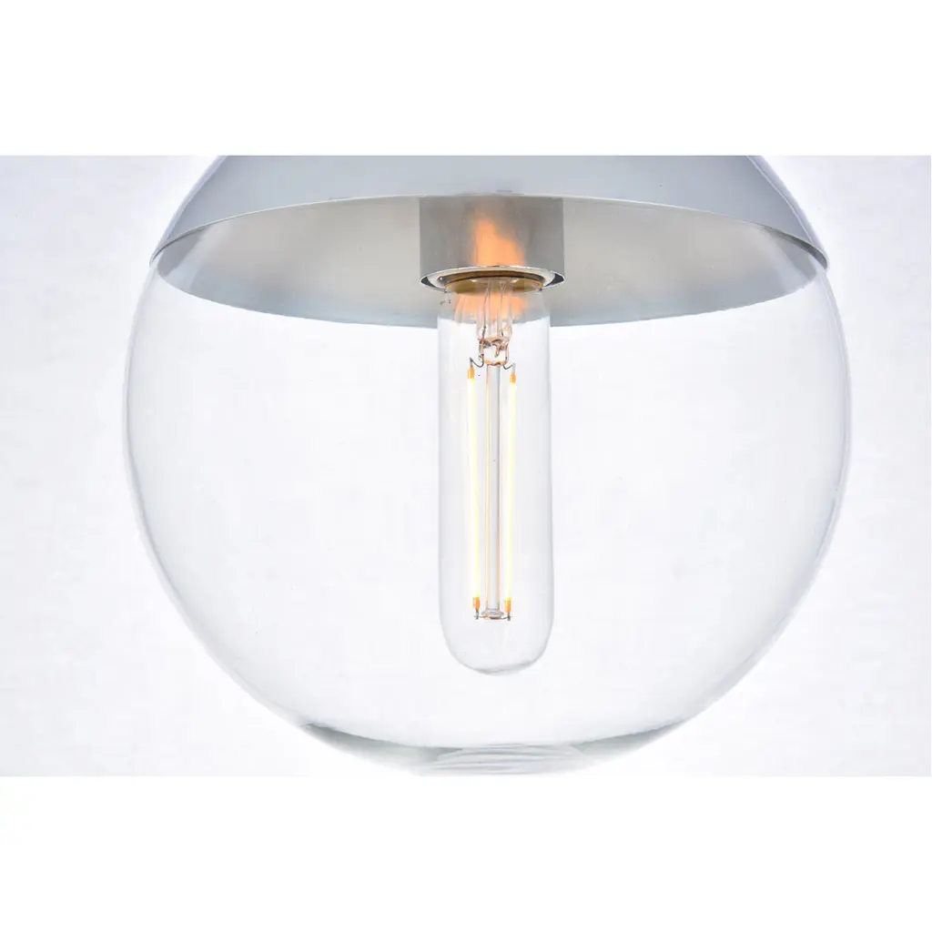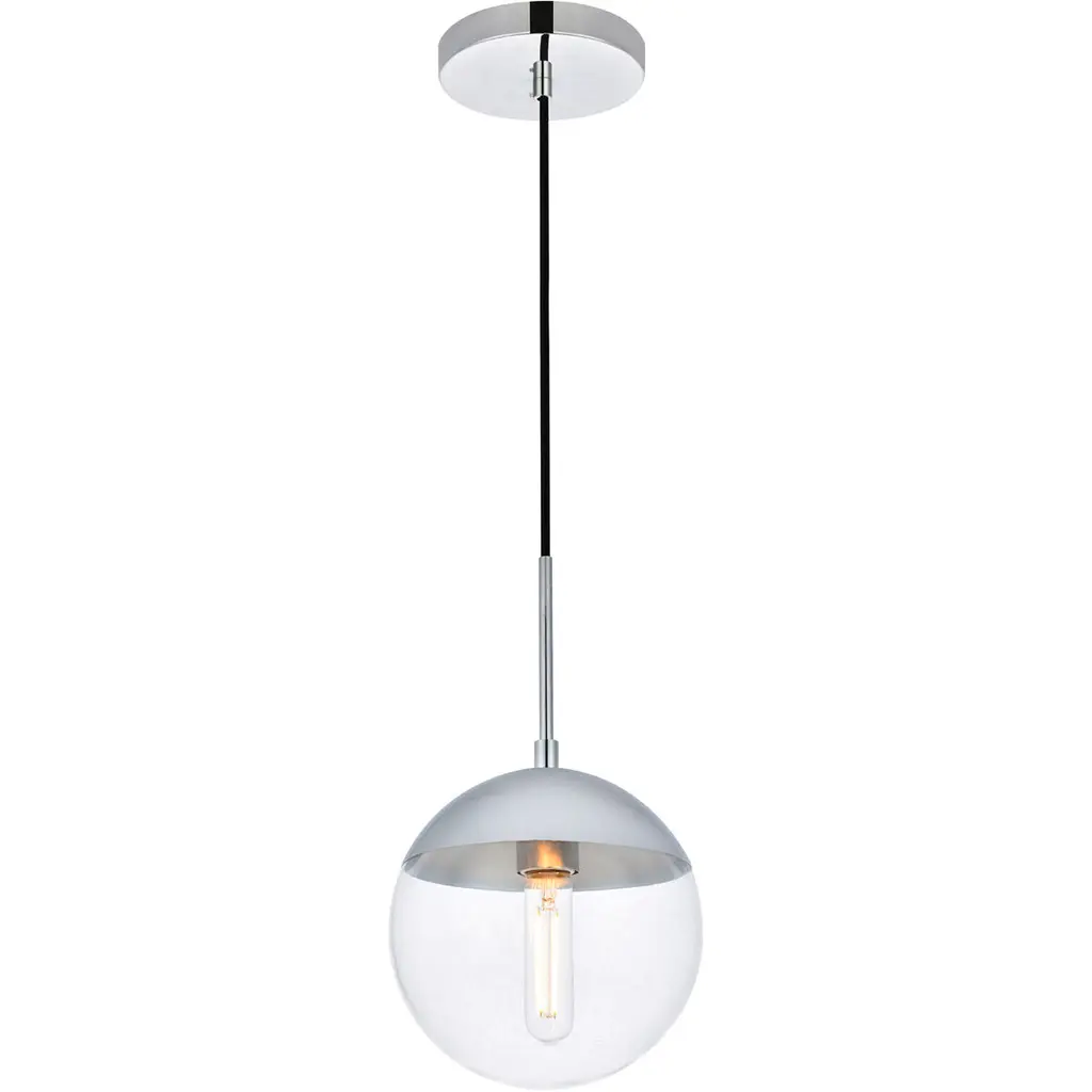 Refined style with a practical design, Eclipse hanging pendant lamps bring cosmopolitan sophistication anywhere, especially to an entryway, office, bathroom, bedroom, or kitchen. The smooth iron frame features a disk-shaped canopy and comes in a chrome finish. An adjustable black cord allows you to vary the hanging height from 16 to 63 inches. A touch of color on top of the clear spherical glass shade brings character to this classic style. Living in the big city has never been this easy.