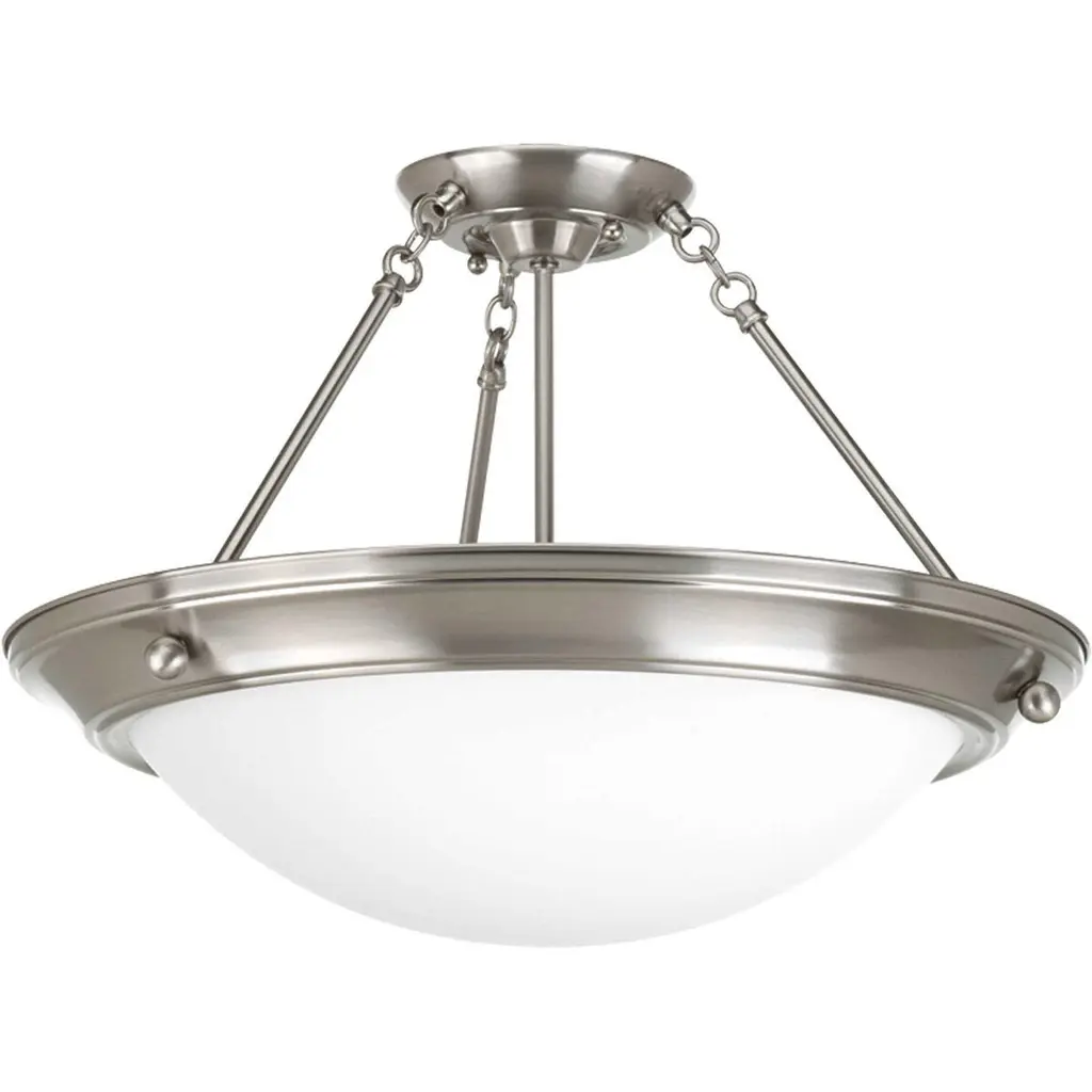 Three-light 19-3/8" pendant with satin white glass is perfect for residential and commercial applications. Brushed Nickel finish.