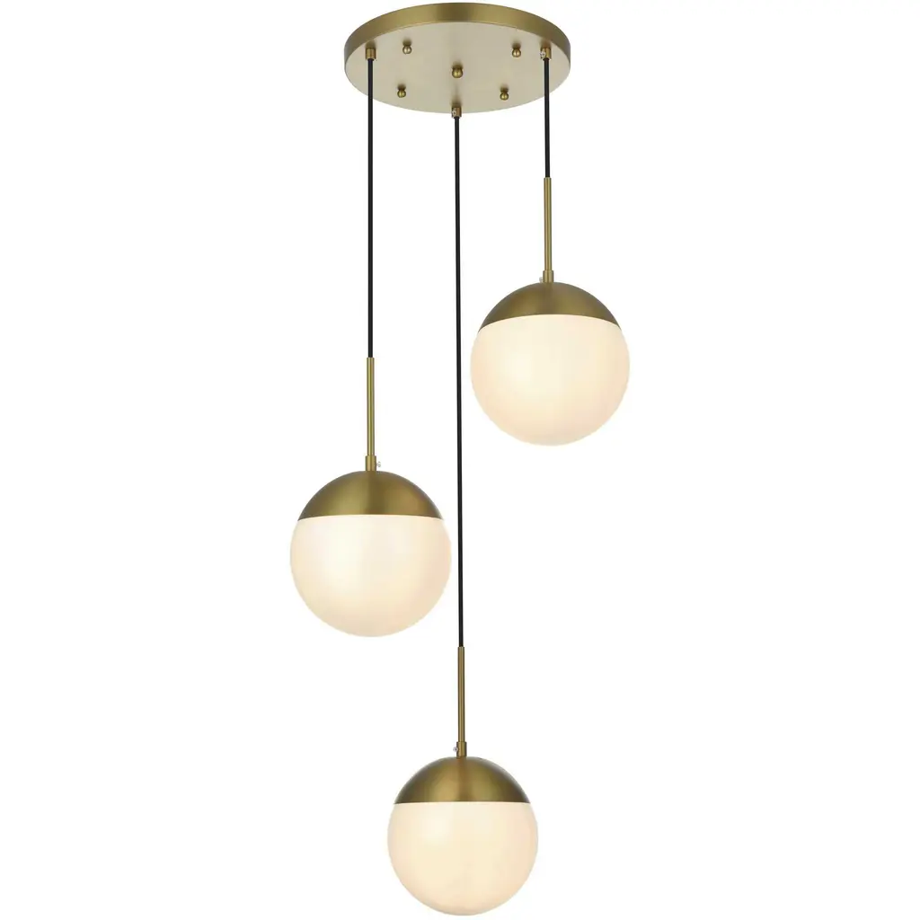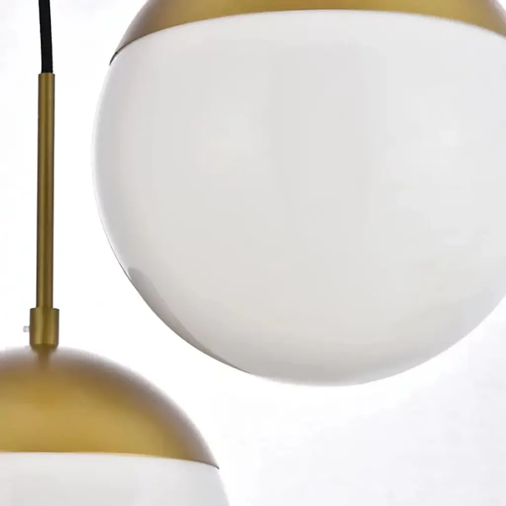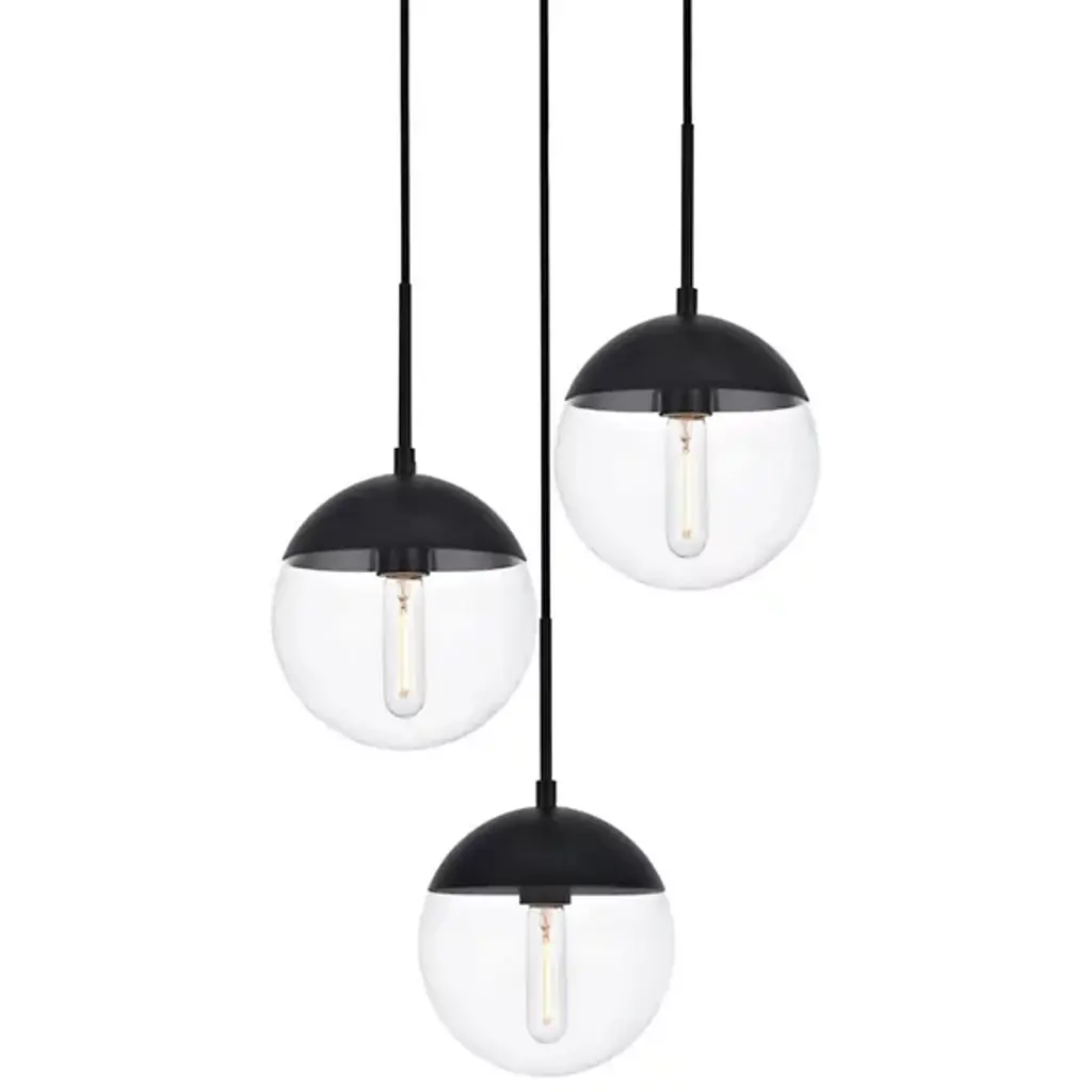 The Eclipse Multi Light Pendant from Elegant Lighting allows you to set the mood from bright and energizing to soft and intimate with its dimmable control. It features three orbs of light, each a perfect fusion of glass and opaque metal, dangling at varying heights from slender cords. Each globe houses a single bulb, its glow diffused by the glass lower half while the metal cap above directs light downward with purpose. The circular canopy anchors this pendant, providing a sleek counterpoint to the spherical shades.