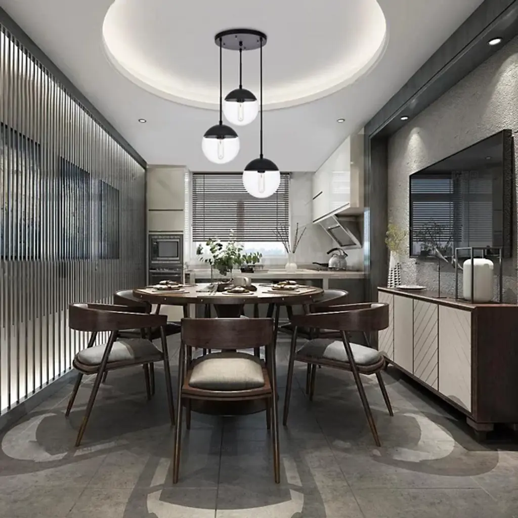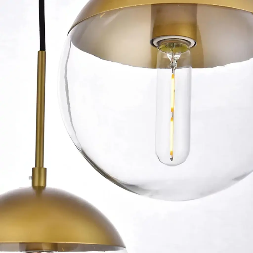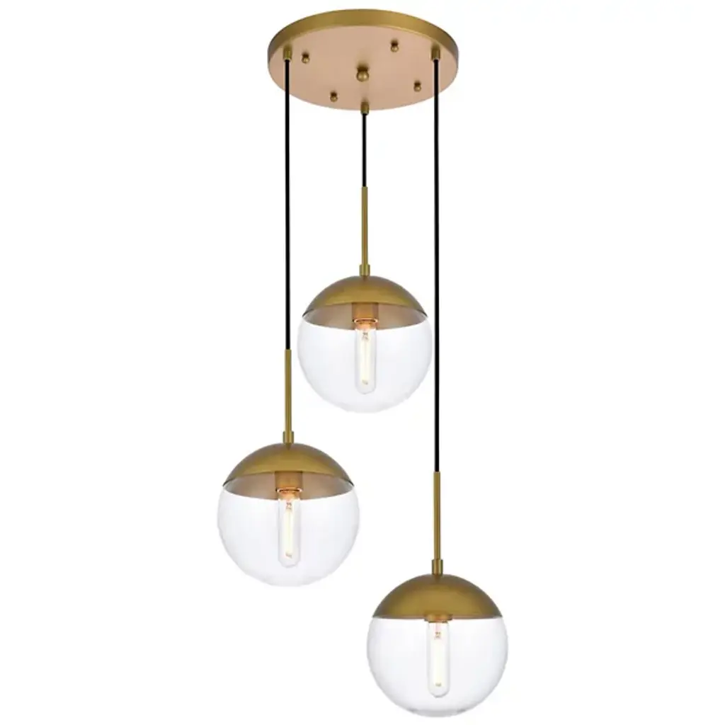 The Eclipse Multi Light Pendant from Elegant Lighting allows you to set the mood from bright and energizing to soft and intimate with its dimmable control. It features three orbs of light, each a perfect fusion of glass and opaque metal, dangling at varying heights from slender cords. Each globe houses a single bulb, its glow diffused by the glass lower half while the metal cap above directs light downward with purpose. The circular canopy anchors this pendant, providing a sleek counterpoint to the spherical shades.