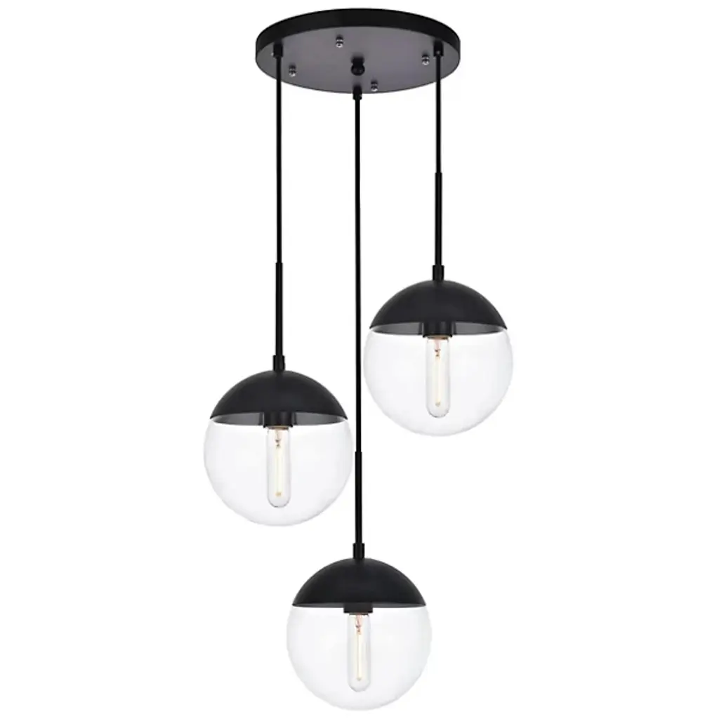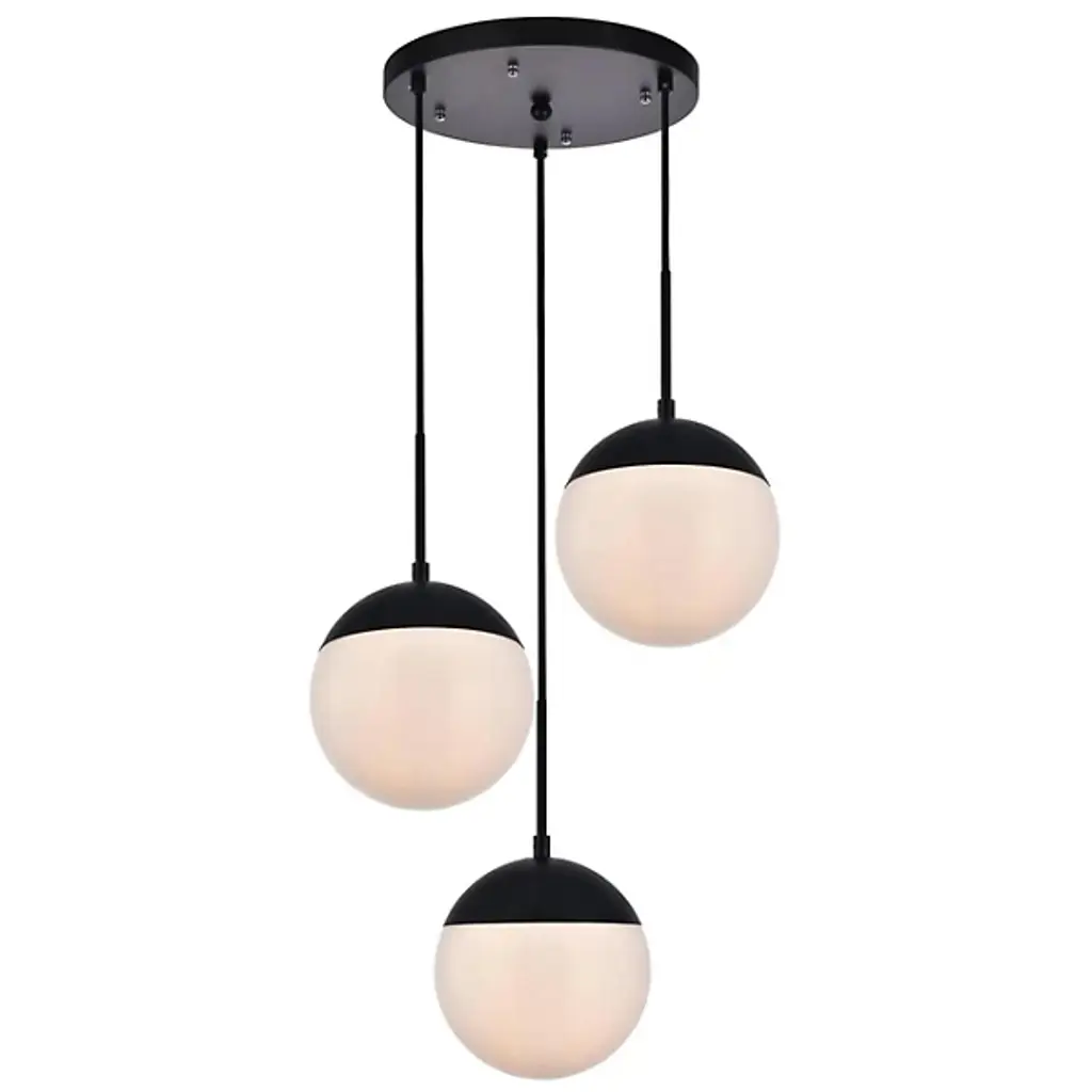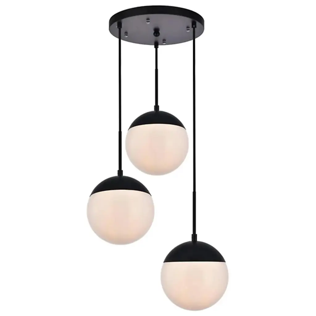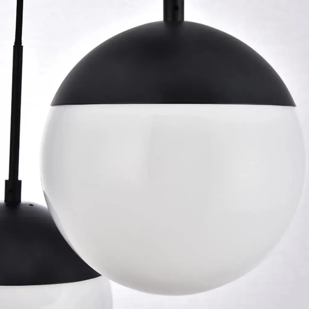 The Eclipse Multi Light Pendant from Elegant Lighting allows you to set the mood from bright and energizing to soft and intimate with its dimmable control. It features three orbs of light, each a perfect fusion of glass and opaque metal, dangling at varying heights from slender cords. Each globe houses a single bulb, its glow diffused by the glass lower half while the metal cap above directs light downward with purpose. The circular canopy anchors this pendant, providing a sleek counterpoint to the spherical shades.