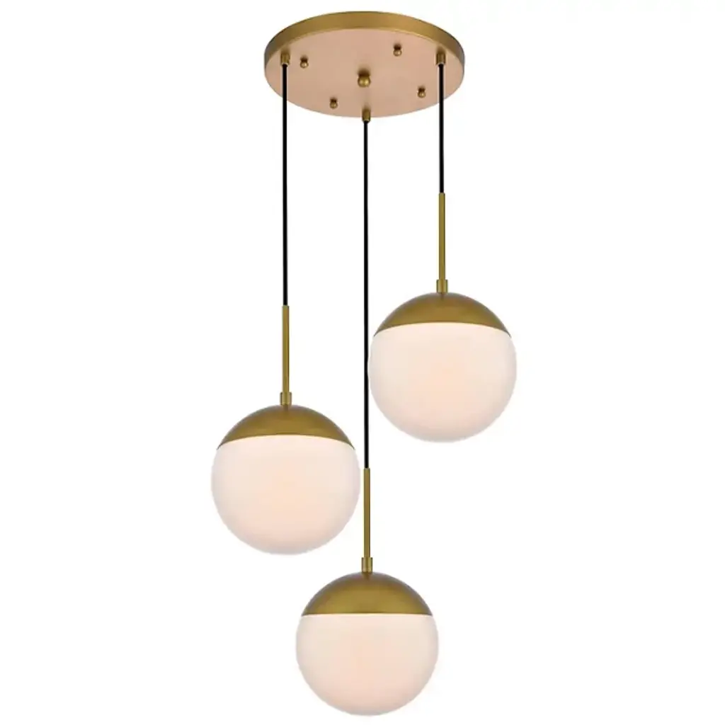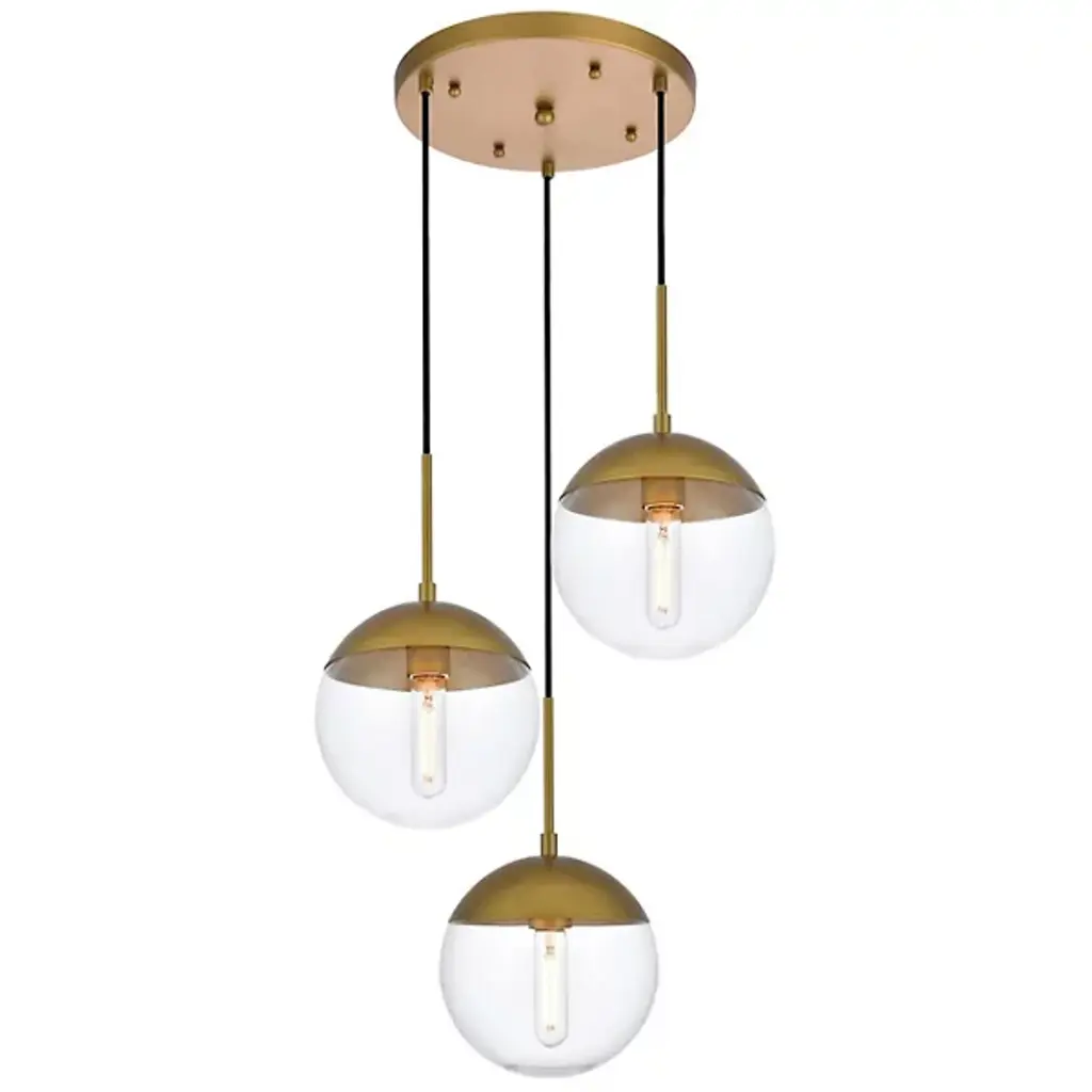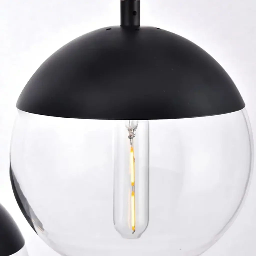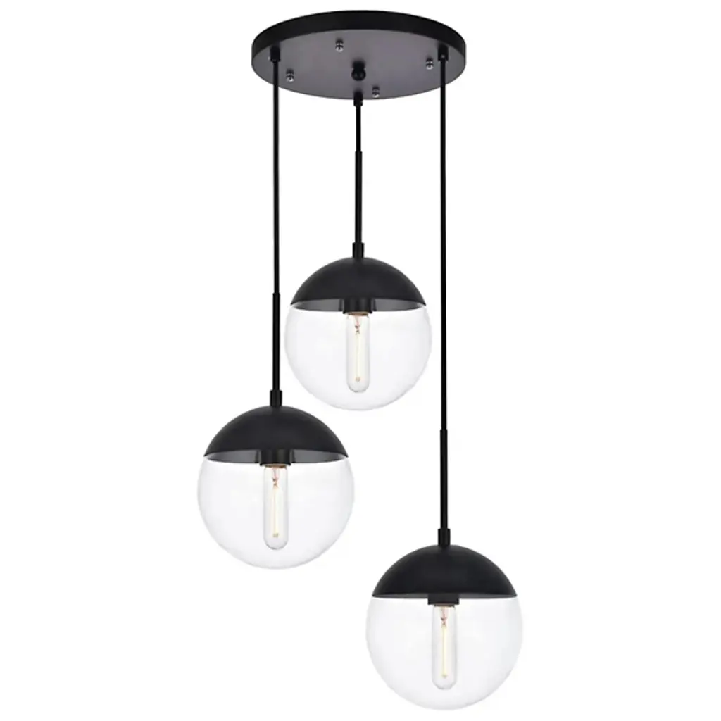 The Eclipse Multi Light Pendant from Elegant Lighting allows you to set the mood from bright and energizing to soft and intimate with its dimmable control. It features three orbs of light, each a perfect fusion of glass and opaque metal, dangling at varying heights from slender cords. Each globe houses a single bulb, its glow diffused by the glass lower half while the metal cap above directs light downward with purpose. The circular canopy anchors this pendant, providing a sleek counterpoint to the spherical shades.