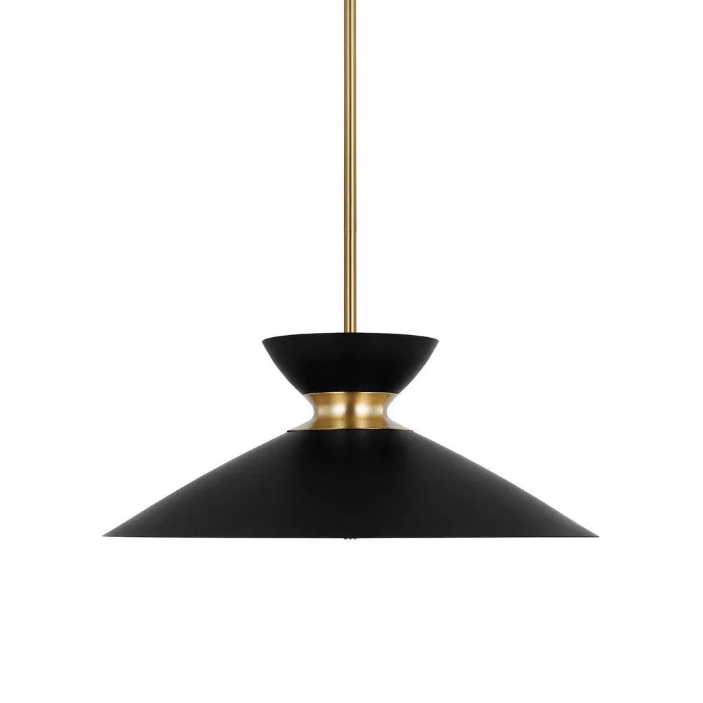 The ED Ellen DeGeneres Heath Wide Pendant Light from Visual Comfort & Co adds a stunningly modern aesthetic to any space. Features include a striking contrast of colored steel and burnished brass, an adjustable stem, and a wide shade, designed to cast light from the inside-out. This impressive pendant is suitable for both dry and damp areas, making it a versatile addition to any interior design. Highlights