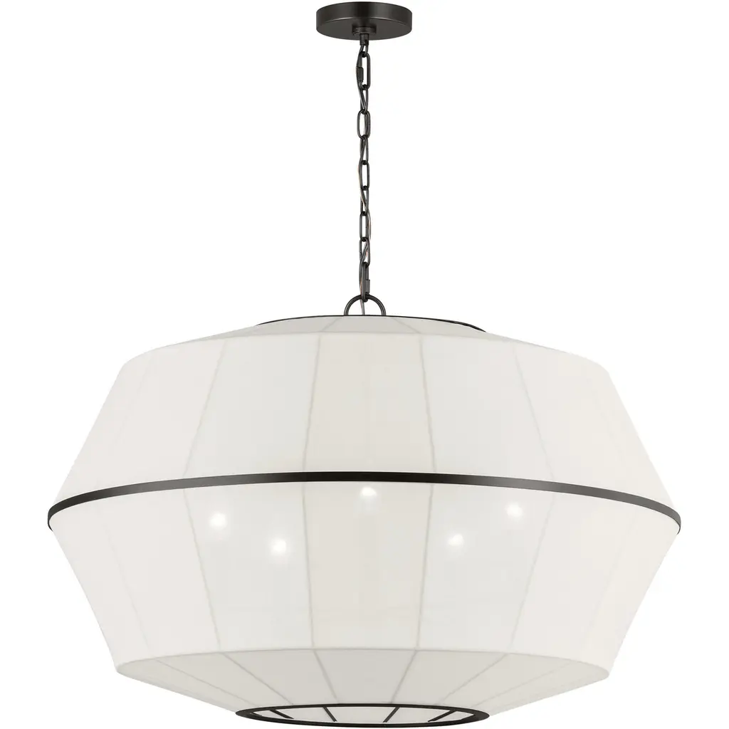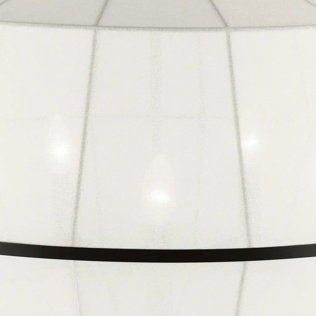 Showcasing multifaceted geometry, the Hikari series by Ellen DeGeneres is inspired by her personal collection of sculptural lighting. Grounded by the contrast of hard and soft materials, the aged iron and white linen fixture radiates soft, diffused light. The Hikari pendant can be used in a dining room, living room, bedroom or entryway.