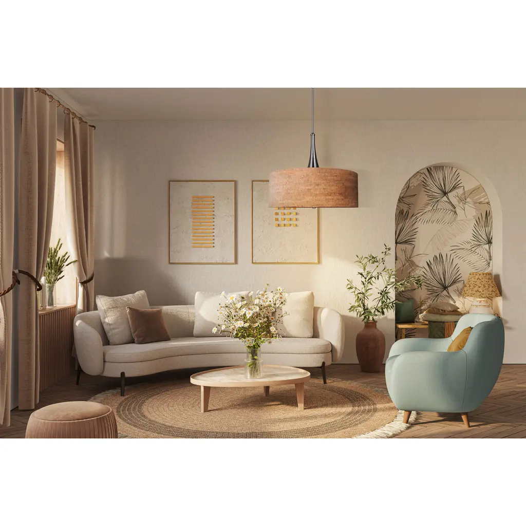 Introducing Eden, a modern and unique chandelier that transforms any space with its sophisticated charm. This 3-light rod chandelier features a stunning cork shade paired with a frosted glass diffuser, creating a warm and inviting ambiance. With a 100W Type A bulb, Eden ensures ample illumination for your home.Measuring 22 inches in width and adjustable in height from 28.25 to 70.25 inches, this hanging light offers versatile installation options to suit any room's needs. The sleek design of the Eden chandelier adds a touch of contemporary elegance, making it a standout piece in any setting. Perfect for dining rooms, living rooms, or entryways, Eden combines functionality with a stylish aesthetic.Elevate your home decor with the Eden rod chandelier, a perfect blend of modern design and unique flair. Let this exquisite hanging light be the centerpiece of your space, providing both beauty and brilliant illumination.