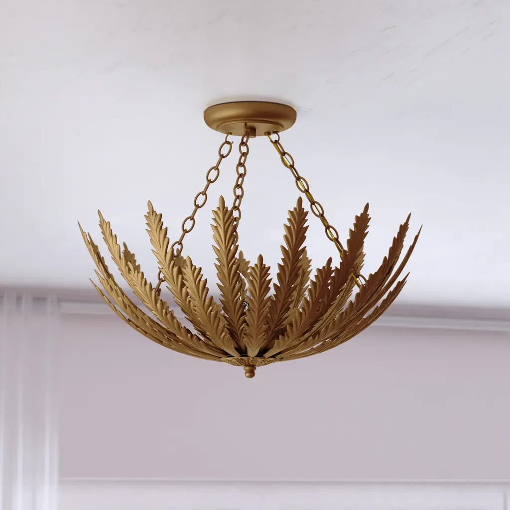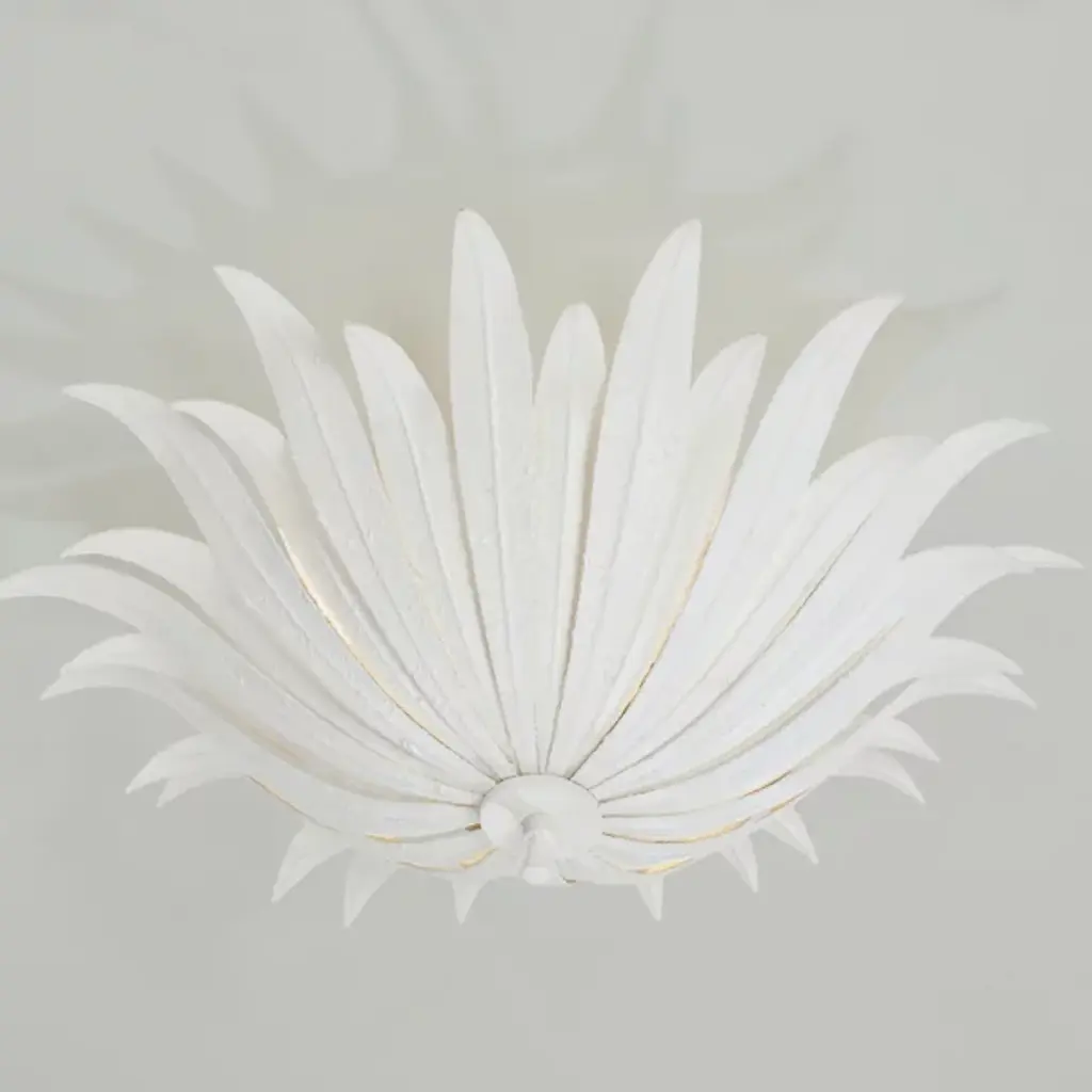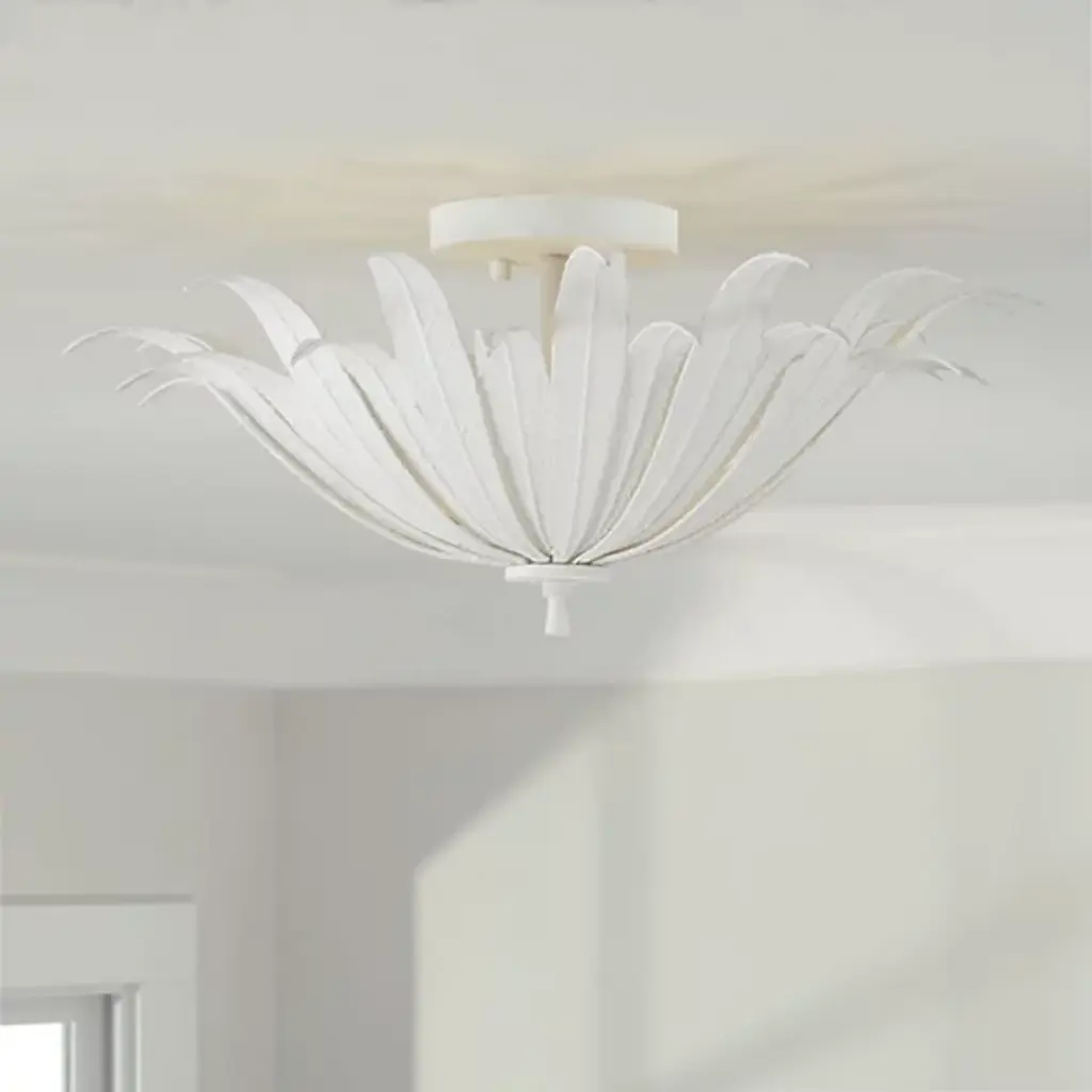 The Eden Semi-Flushmount from Capital Lighting transforms botanical inspiration into sculptural lighting through curved metal leaves that radiate outward like an opening flower. Each leaf-shaped element curves gracefully from the central mounting point, creating organic movement that softens the ceiling line. The design captures that moment when a bloom reaches full extension, with the metal framework forming delicate petals that house integrated LED lighting. This approach brings natural forms indoors while the upward-facing configuration provides ambient illumination that washes across ceilings.