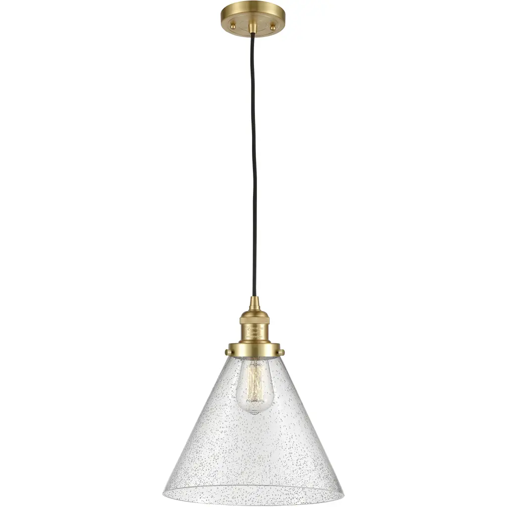 Edison Cone Led 12 Inch Brushed Brass Mini Pendant Ceiling Light In Seedy Glass