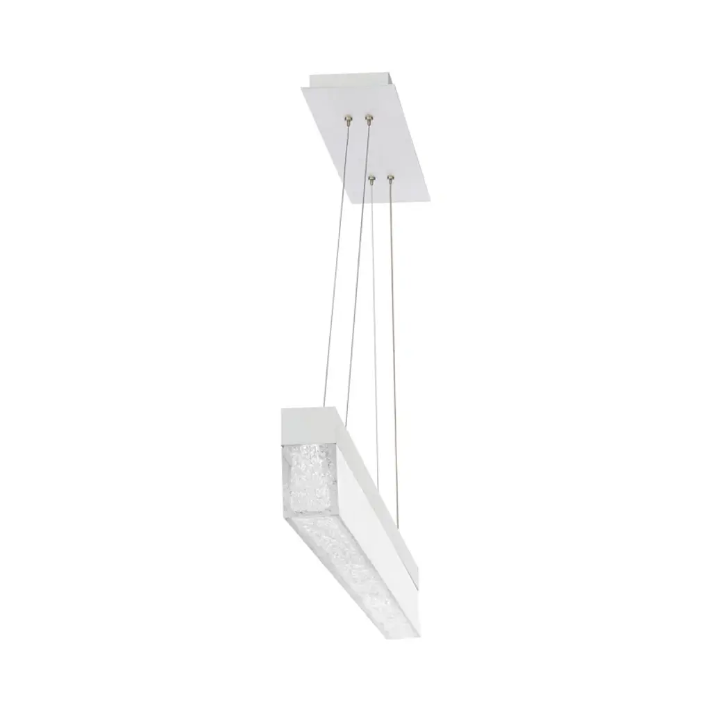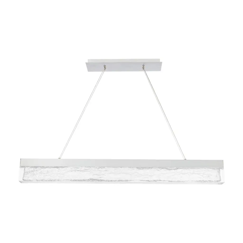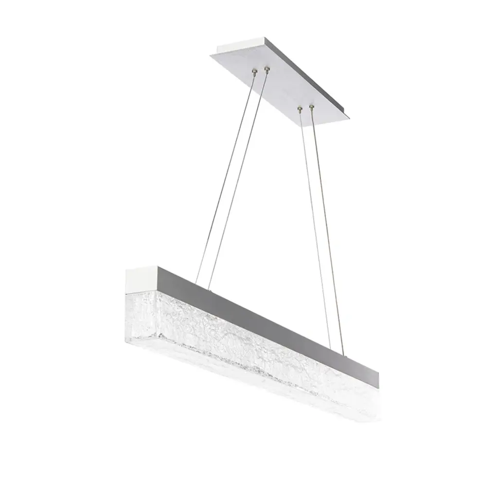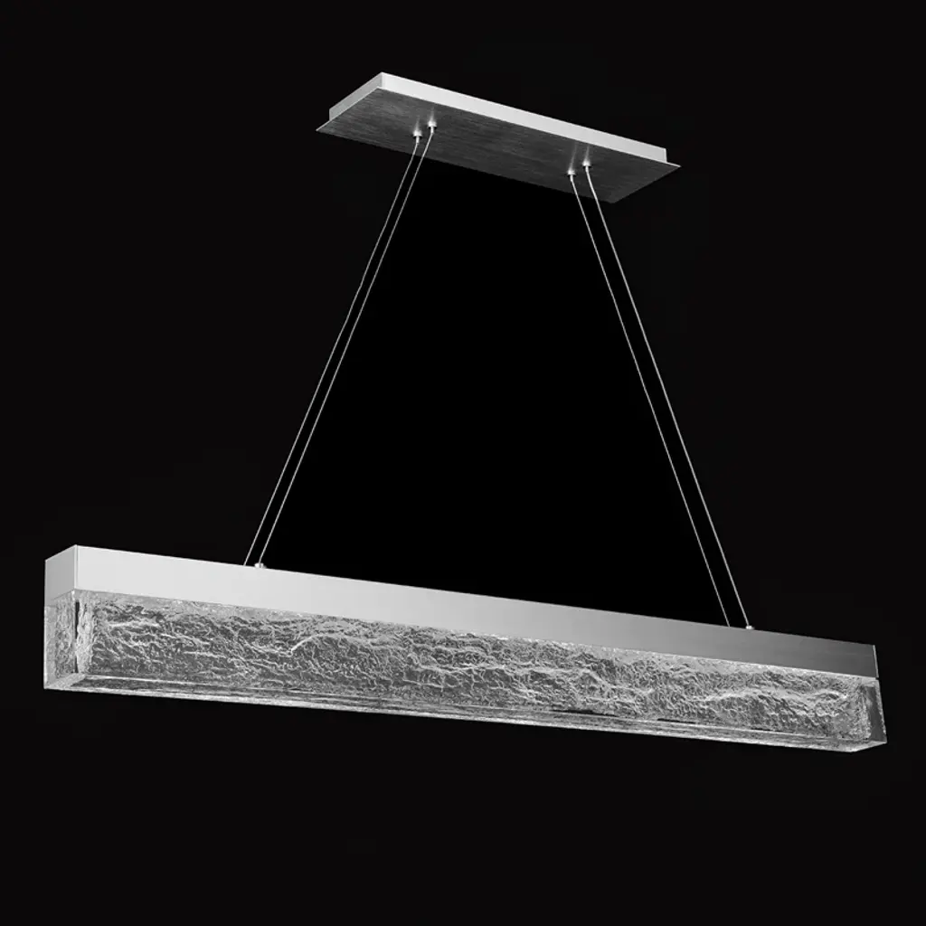A glamourous facade of illumination, rooted in a minimal elegant aesthetic that is substantial enough to be an iconic piece of architectural lighting with style and proportion. Simply a glittering, breathtaking presentation of light. Effervescent is a 45-inch linear pendant featuring a cutting edge translucent acrylic shade with bark-textured interior patterns that create an impressive reflective quality. Carefully suspended by four electrified aircraft cables, Effervescent eliminates the need for dangling power cords found in traditional LED pendants. The arrangement of energy-efficient integrated LEDs in its frame passes light through the patterns of the acrylic for an effective downlight and ambient light delivery. Available in black or brushed aluminum finishes.