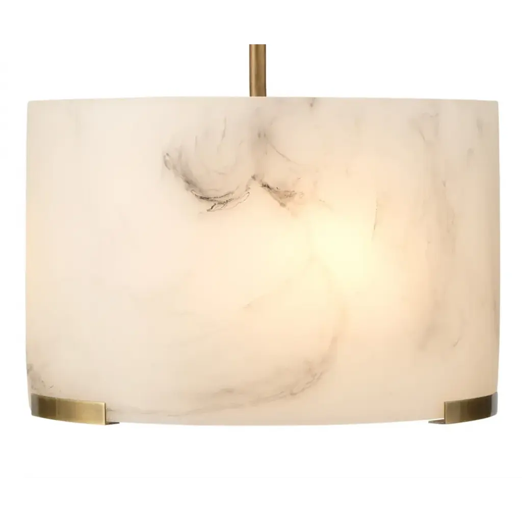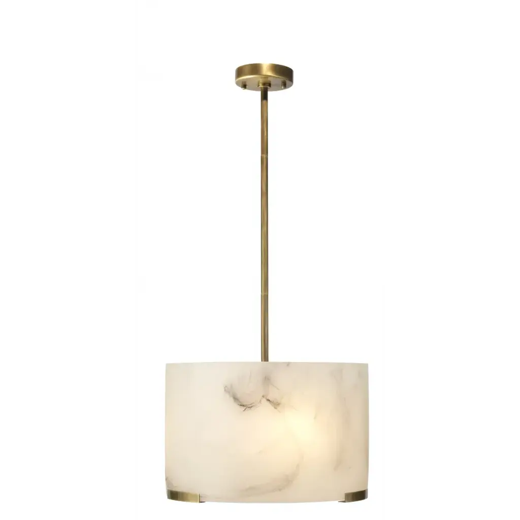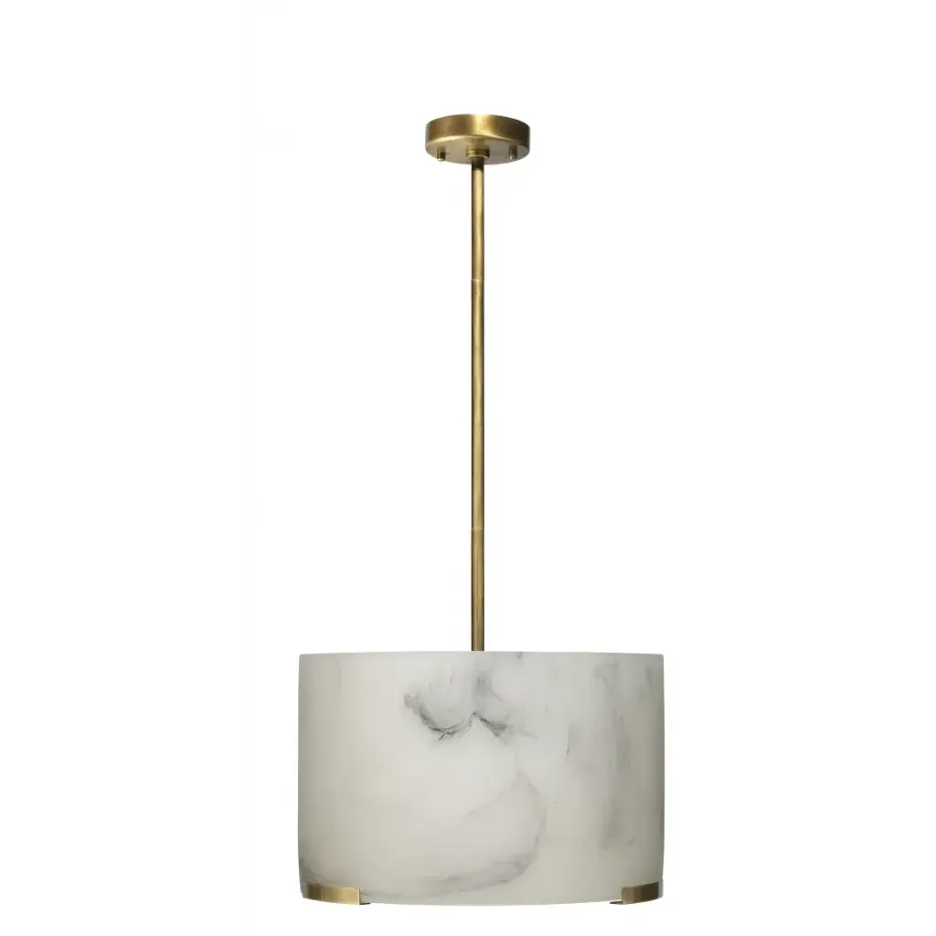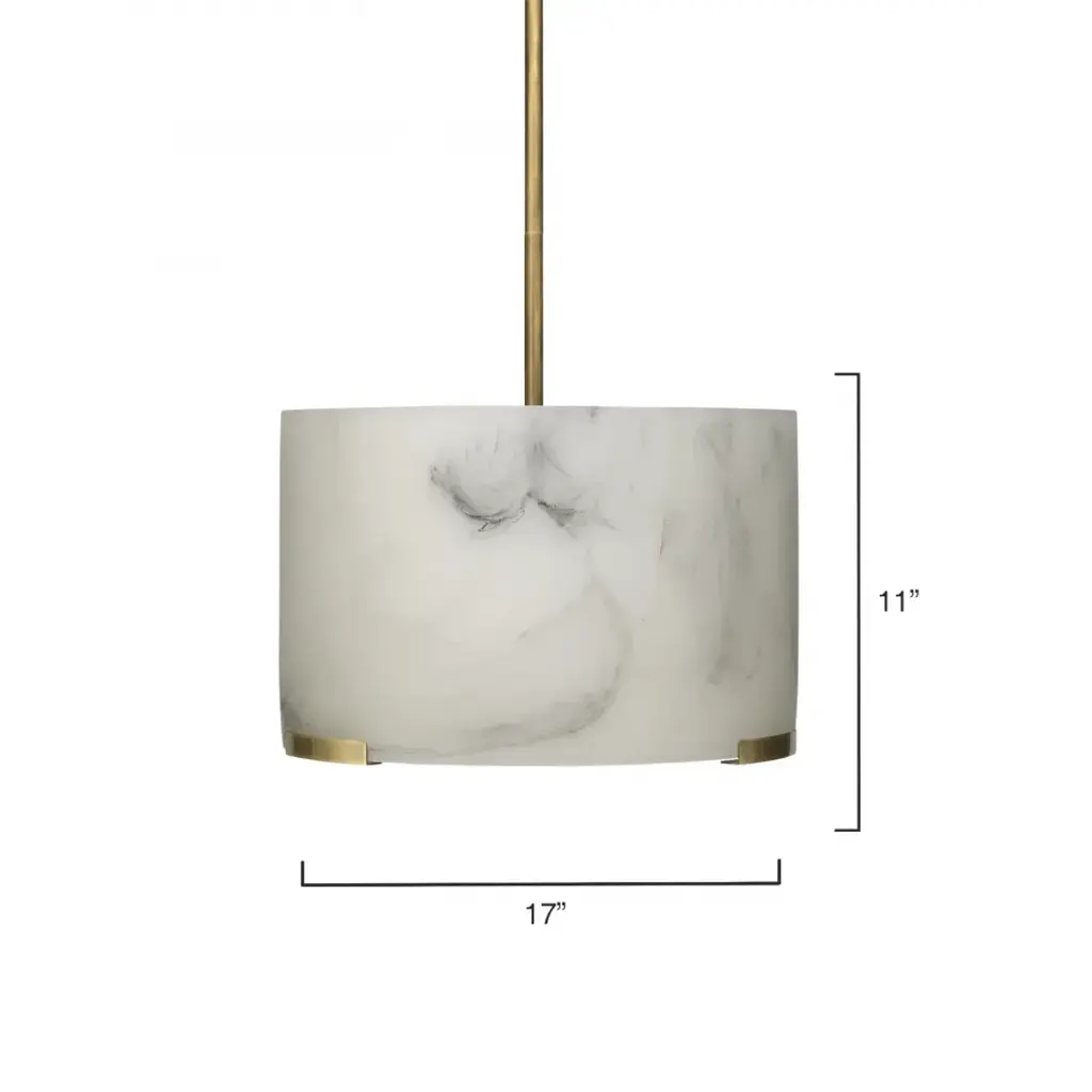 Soften your space with the elegance of this pendant, featuring a faux alabaster drum shade. Crafted meticulously from high-quality resin, each shade replicates the delicate swirl patterns and veining of natural stone (without the weight) for a one-of-a-kind effect in each piece. Enhanced by metal accents and hardware finished in naturally warm antiqued brass, this pendant combines artistry with functionality for an unparalleled aesthetic impact.