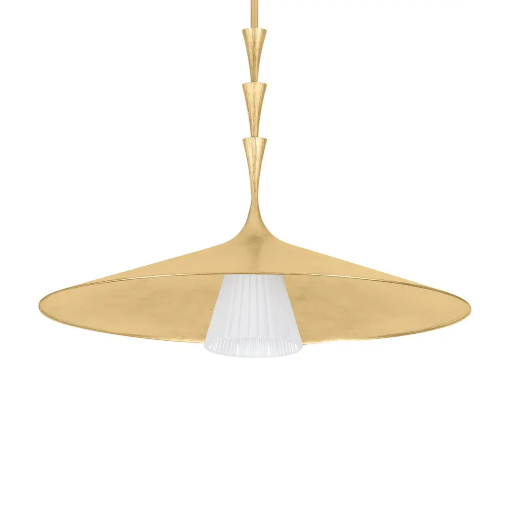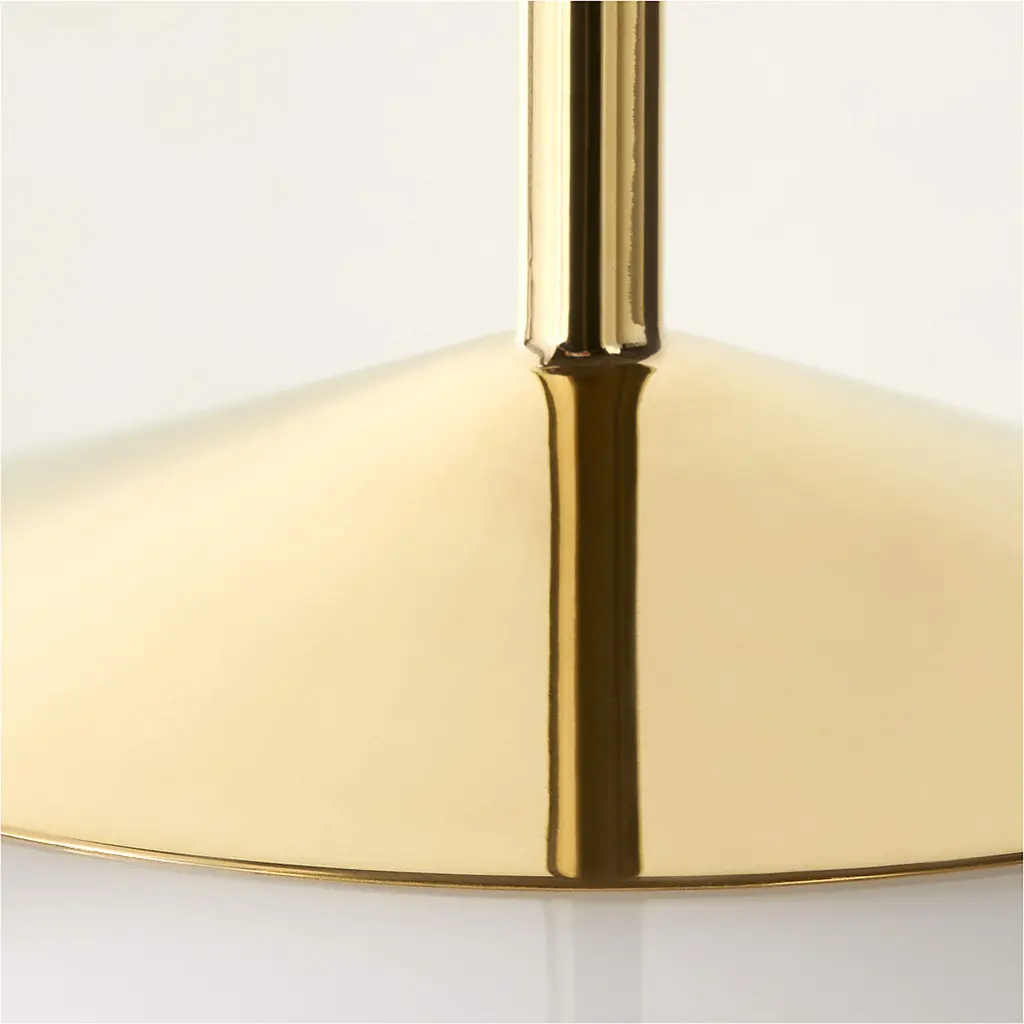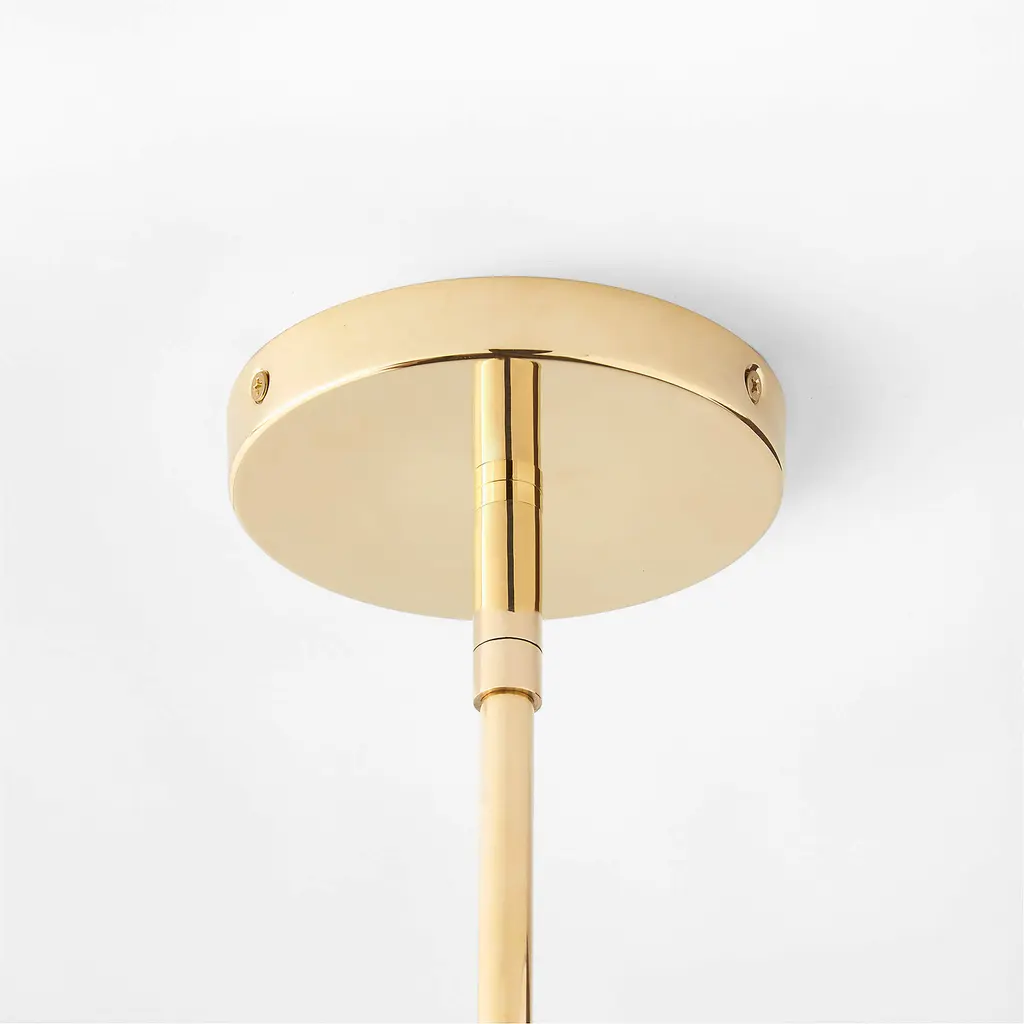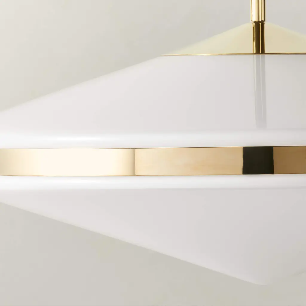 Elevated and modern, polished brass pendant by Barcelona-based Mermelada Estudio emits a soft glow from a silhouette of sharp lines and warm finishes. The fixture is constructed of one continuous piece of polished brass that suspends the angled opaline glass shade from above. Brass is unlacquered, offering a living finish that will develop the patina of a vintage find. CB2 exclusive. Due to the nature of the material, brass patina will vary in color and darken over time.