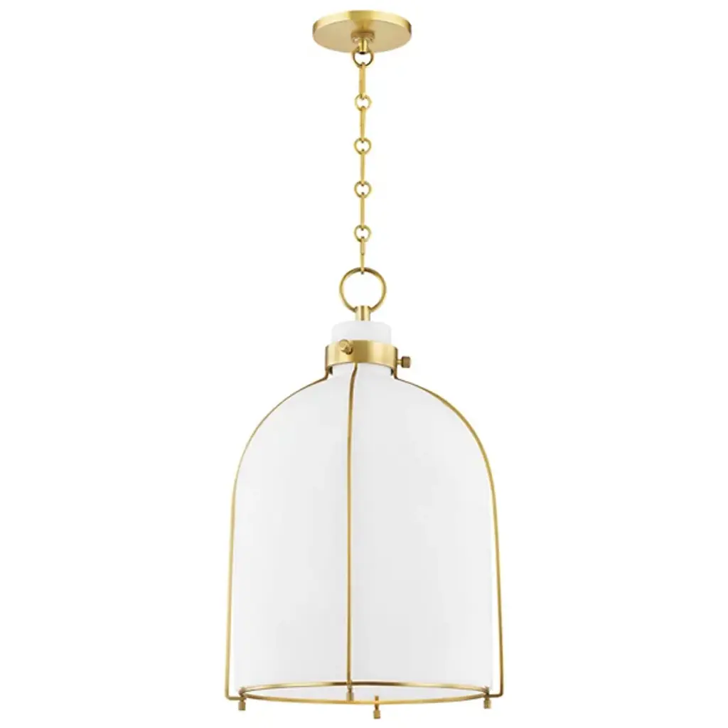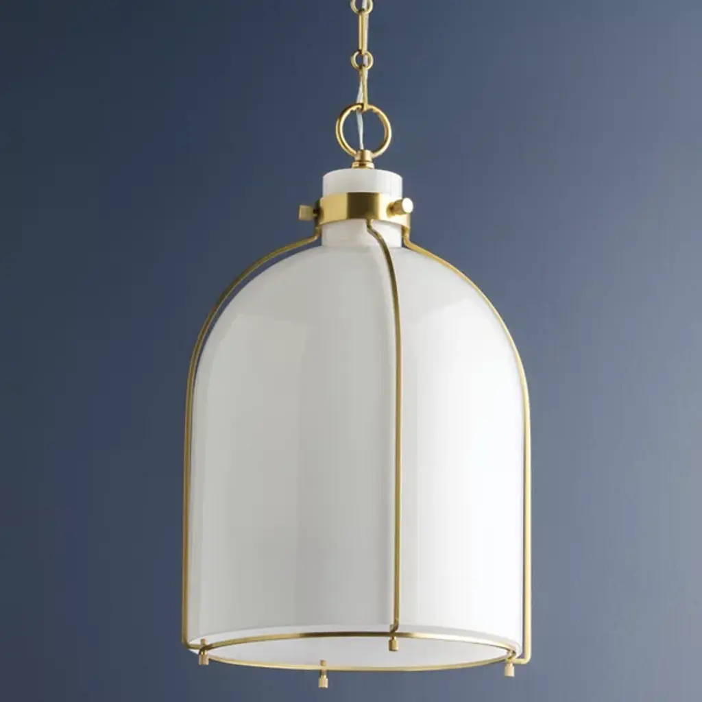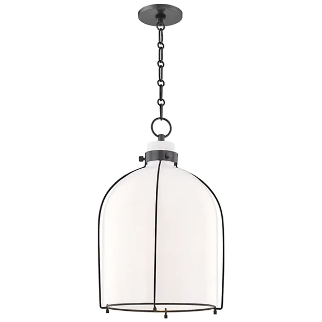 Finished with industrial elegance. The Eldridge 7314 Pendant by Hudson Valley Lighting draws instant attention with its bell-shaped shade made of Opal Shiny Glass. Metal framework traces the shade, fixed to a brace with exposed hardware on its bottleneck top. Suspended from a pendant O-ring hoop with alternating round and oval chain links, this piece works well above an entryway, dining space or in multiples above a kitchen island or bar. An incandescent bulb powers the piece to emit a soft, white light.