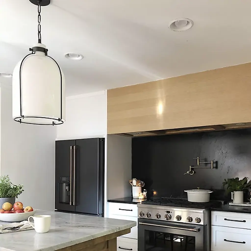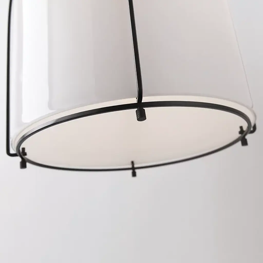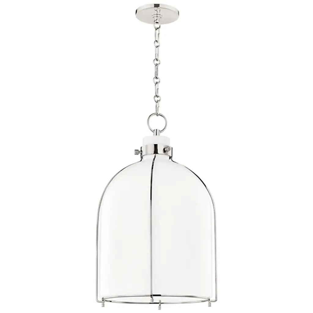 Finished with industrial elegance. The Eldridge 7314 Pendant by Hudson Valley Lighting draws instant attention with its bell-shaped shade made of Opal Shiny Glass. Metal framework traces the shade, fixed to a brace with exposed hardware on its bottleneck top. Suspended from a pendant O-ring hoop with alternating round and oval chain links, this piece works well above an entryway, dining space or in multiples above a kitchen island or bar. An incandescent bulb powers the piece to emit a soft, white light.