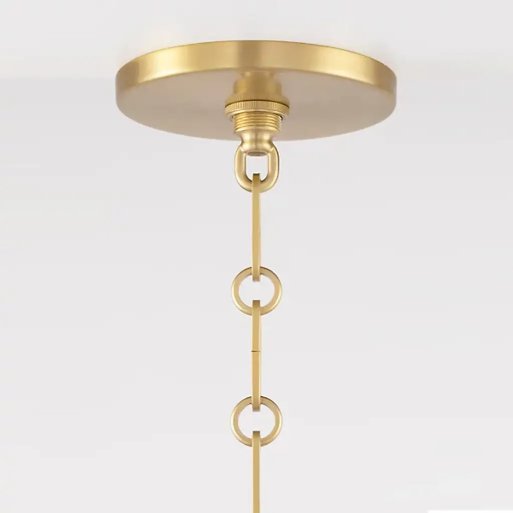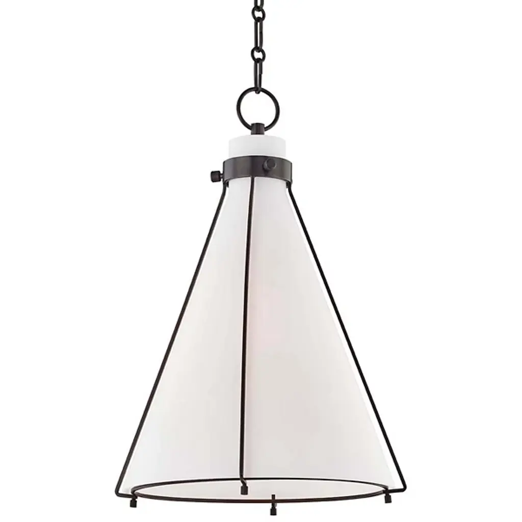 Industrial with a nod to minimalism. Metal wire framework tracing a flared Glass shade makes the Eldridge 7316 Pendant by Hudson Valley Lighting a statement-making light source. A pendant O-ring loop holds the design firmly in place, attached to an alternating series of oval and round chain links. Casting a soft, white glow from an incandescent bulb with an E26 medium base, this piece is perfect for illuminating a hallway or master bedroom or hung in multiples above a surface.