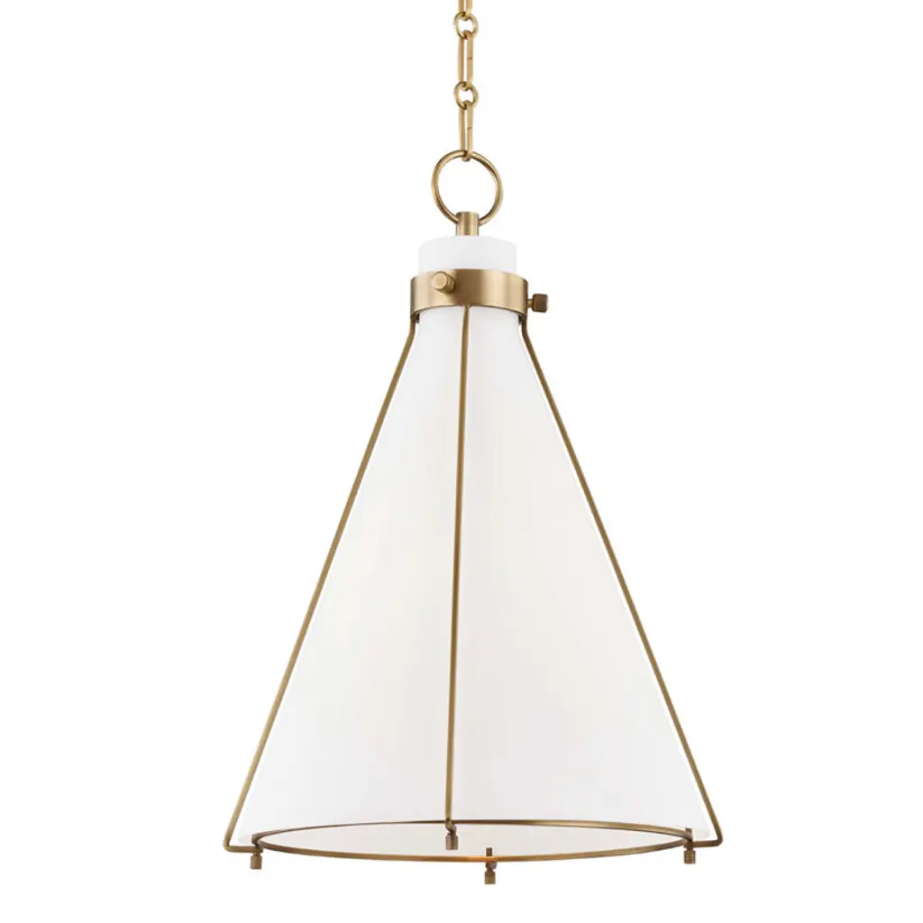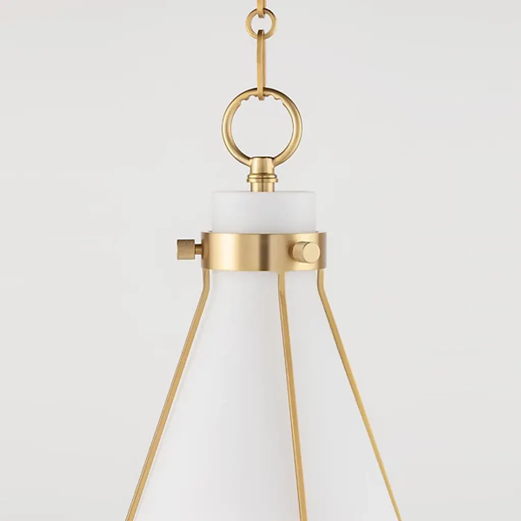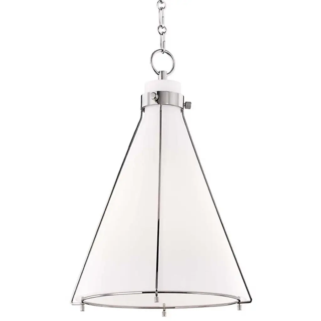 Industrial with a nod to minimalism. Metal wire framework tracing a flared Glass shade makes the Eldridge 7316 Pendant by Hudson Valley Lighting a statement-making light source. A pendant O-ring loop holds the design firmly in place, attached to an alternating series of oval and round chain links. Casting a soft, white glow from an incandescent bulb with an E26 medium base, this piece is perfect for illuminating a hallway or master bedroom or hung in multiples above a surface.