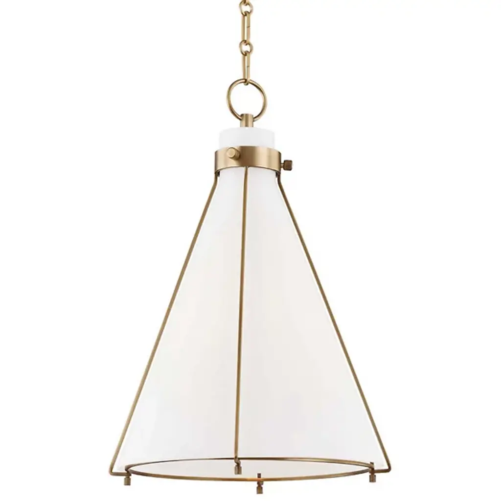 Industrial with a nod to minimalism. Metal wire framework tracing a flared Glass shade makes the Eldridge 7316 Pendant by Hudson Valley Lighting a statement-making light source. A pendant O-ring loop holds the design firmly in place, attached to an alternating series of oval and round chain links. Casting a soft, white glow from an incandescent bulb with an E26 medium base, this piece is perfect for illuminating a hallway or master bedroom or hung in multiples above a surface.