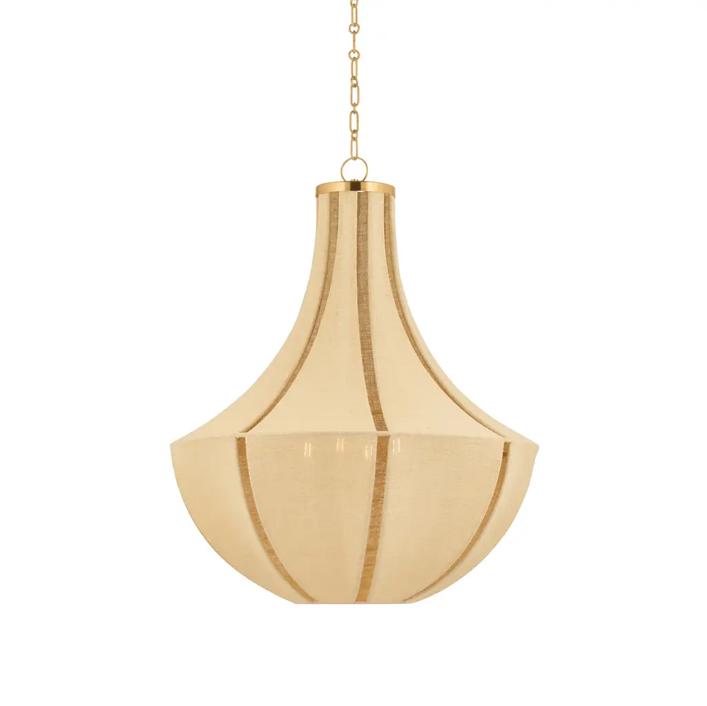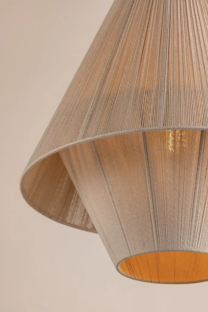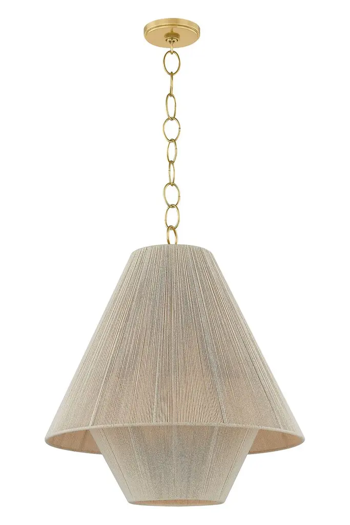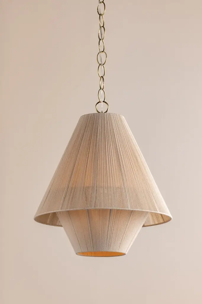 To create the casual elegance of the Eleanor pendant, two light and airy string shades are nested around a central light source. The overlapping of the conical shades creates a subtle moire effect, adding depth to the dynamic silhouette. Suspended by a simple, yet refined Aged Brass chain, Eleanor is perfect over a dining table or in a bedroom.