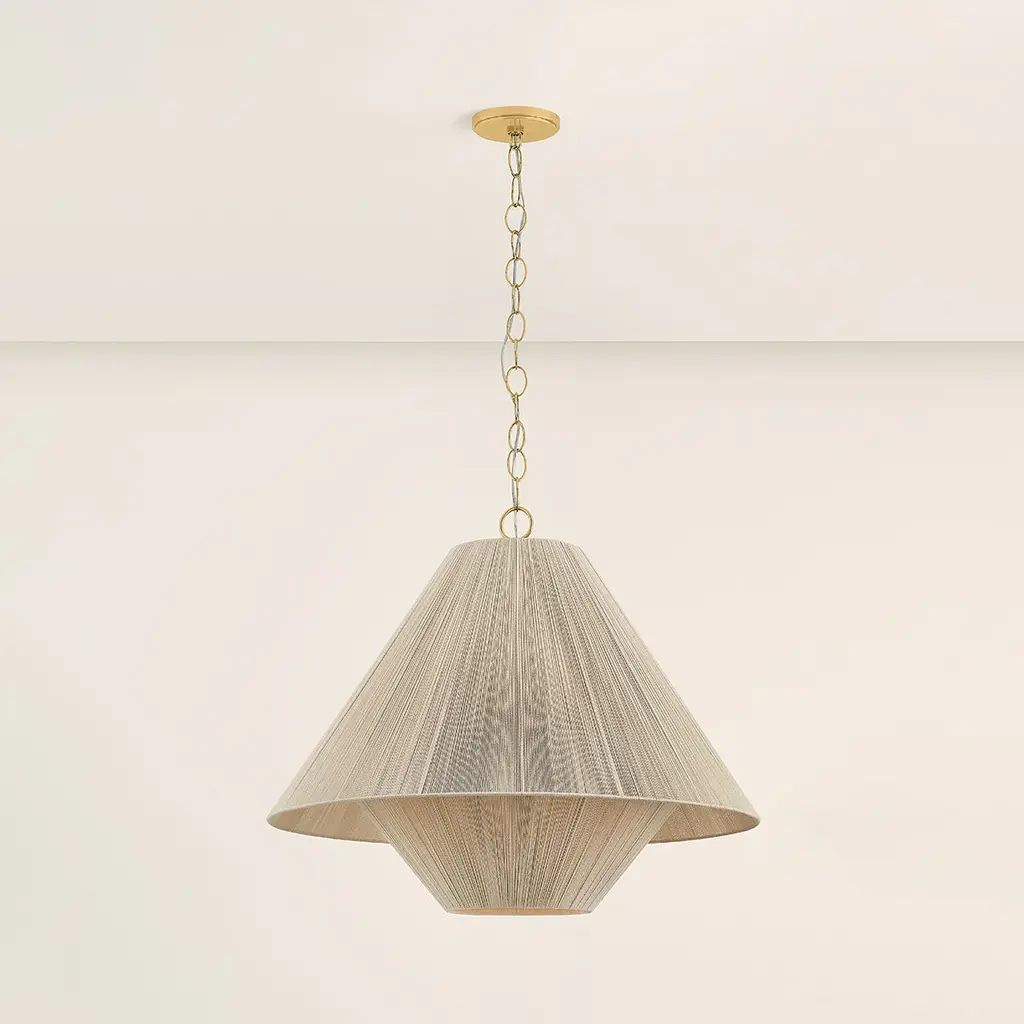 To create the casual elegance of the Eleanor pendant, two light and airy string shades are nested around a central light source. The overlapping of the conical shades creates a subtle moire effect, adding depth to the dynamic silhouette. Suspended by a simple, yet refined Aged Brass chain, Eleanor is perfect over a dining table or in a bedroom.
