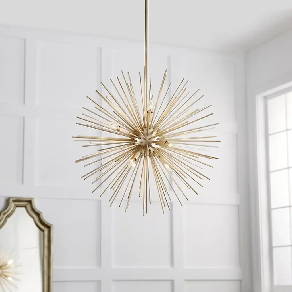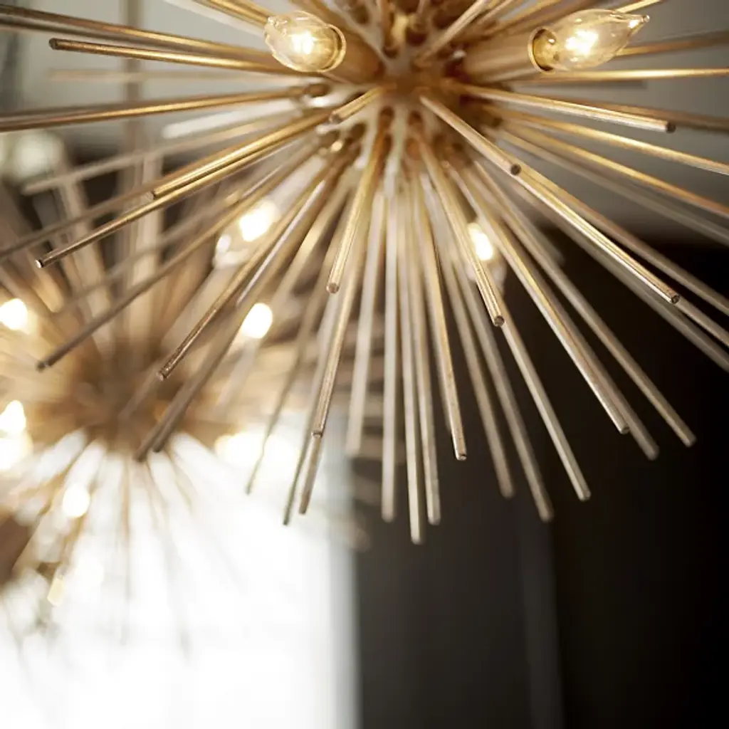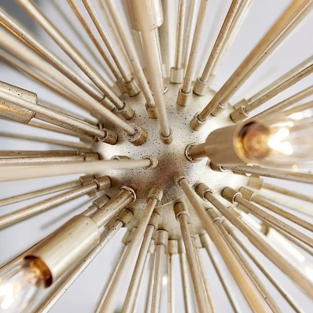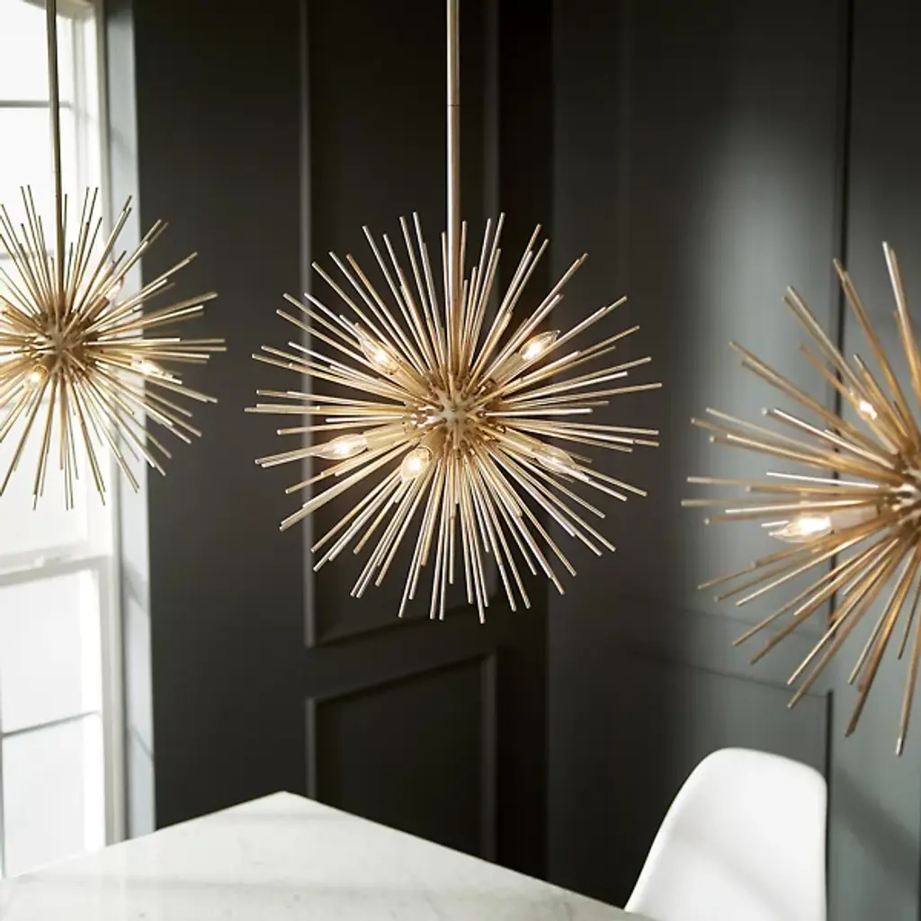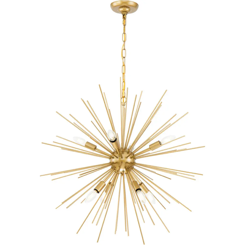 Dramatic lighting for modern spaces. The Electra Pendant from Quorum International features a starburst design that looks wonderful in high-end, luxury settings. Dozens of rods expand outward from the core to give the effect of an explosion, compounded when the eight lights are on. The light hangs from a downrod connected to a matching, round canopy for a seamless look that creates a mid-century modern product. Its dynamic appearance makes it ideally suited for a contemporary dining room above the table.