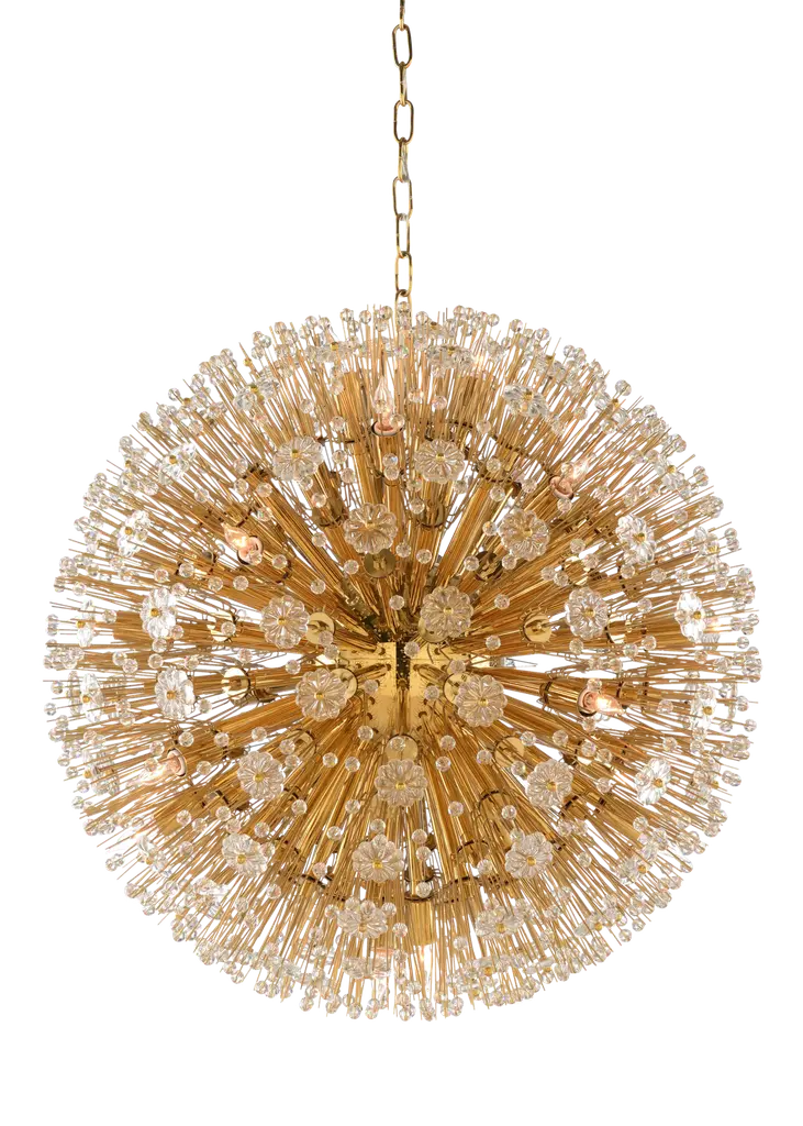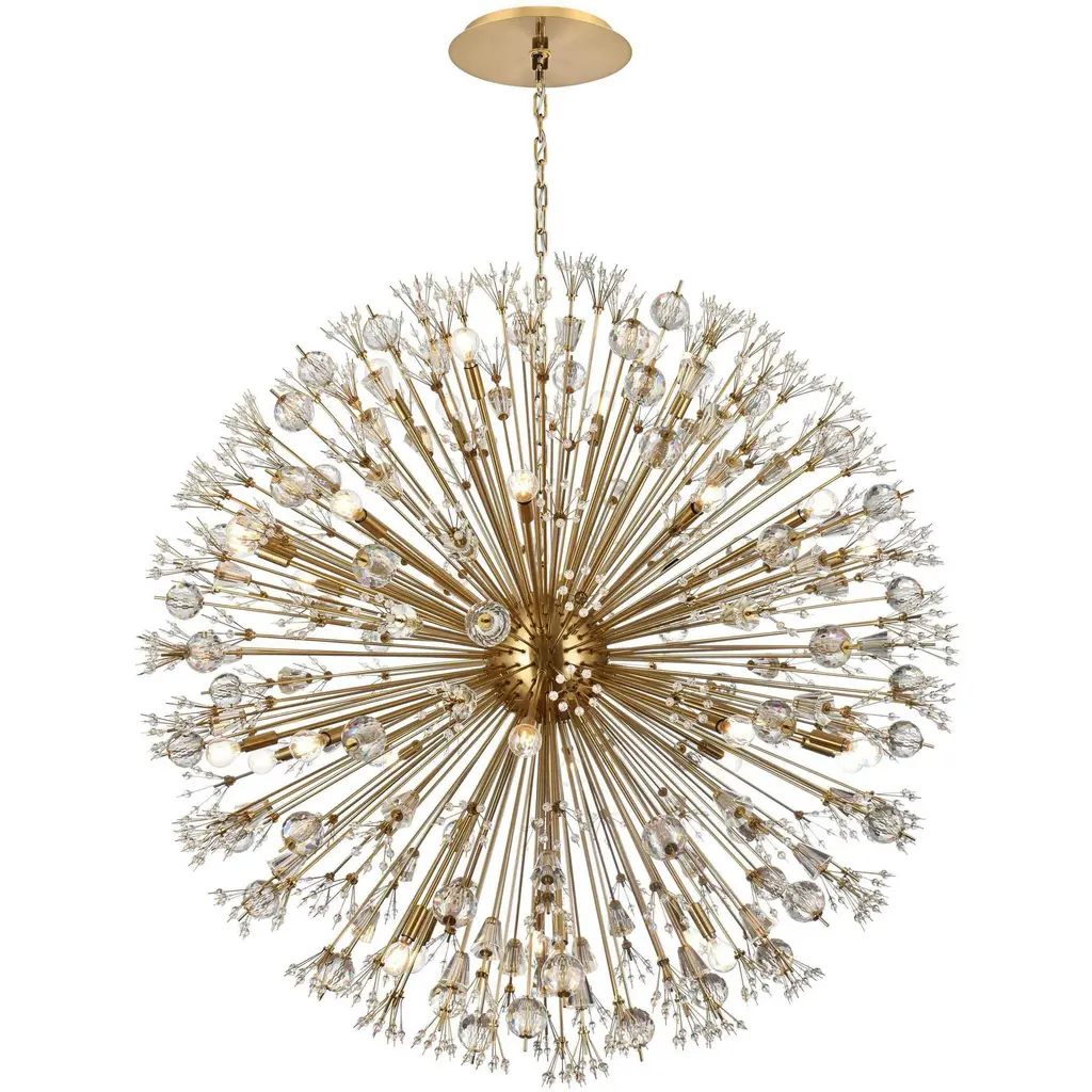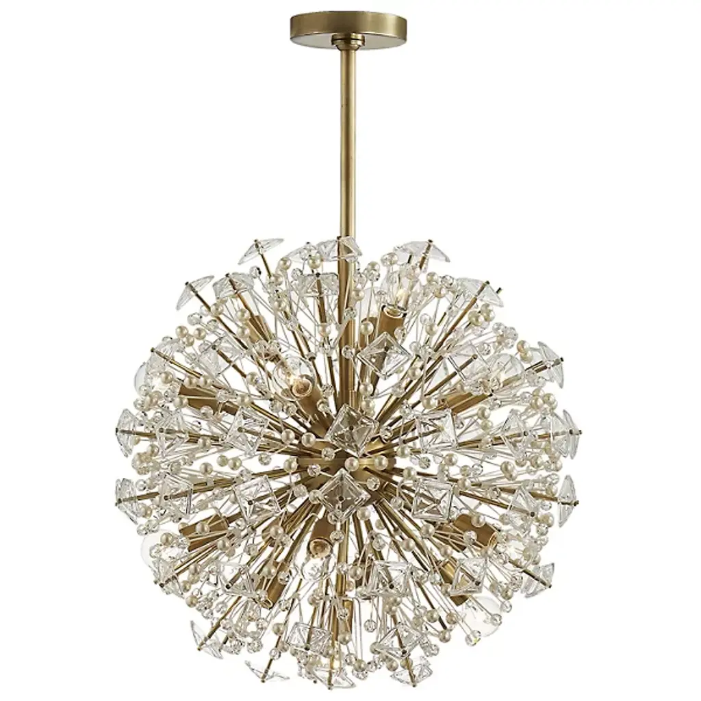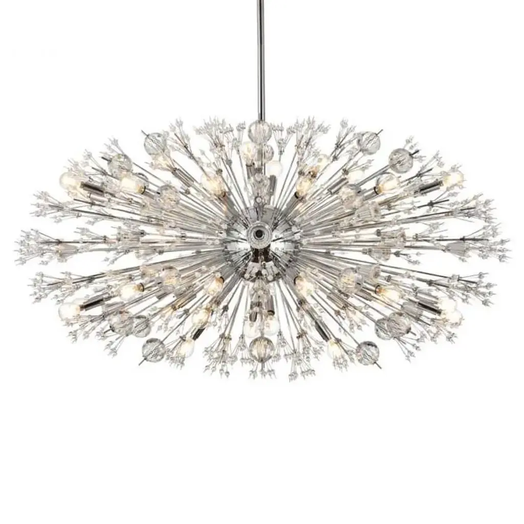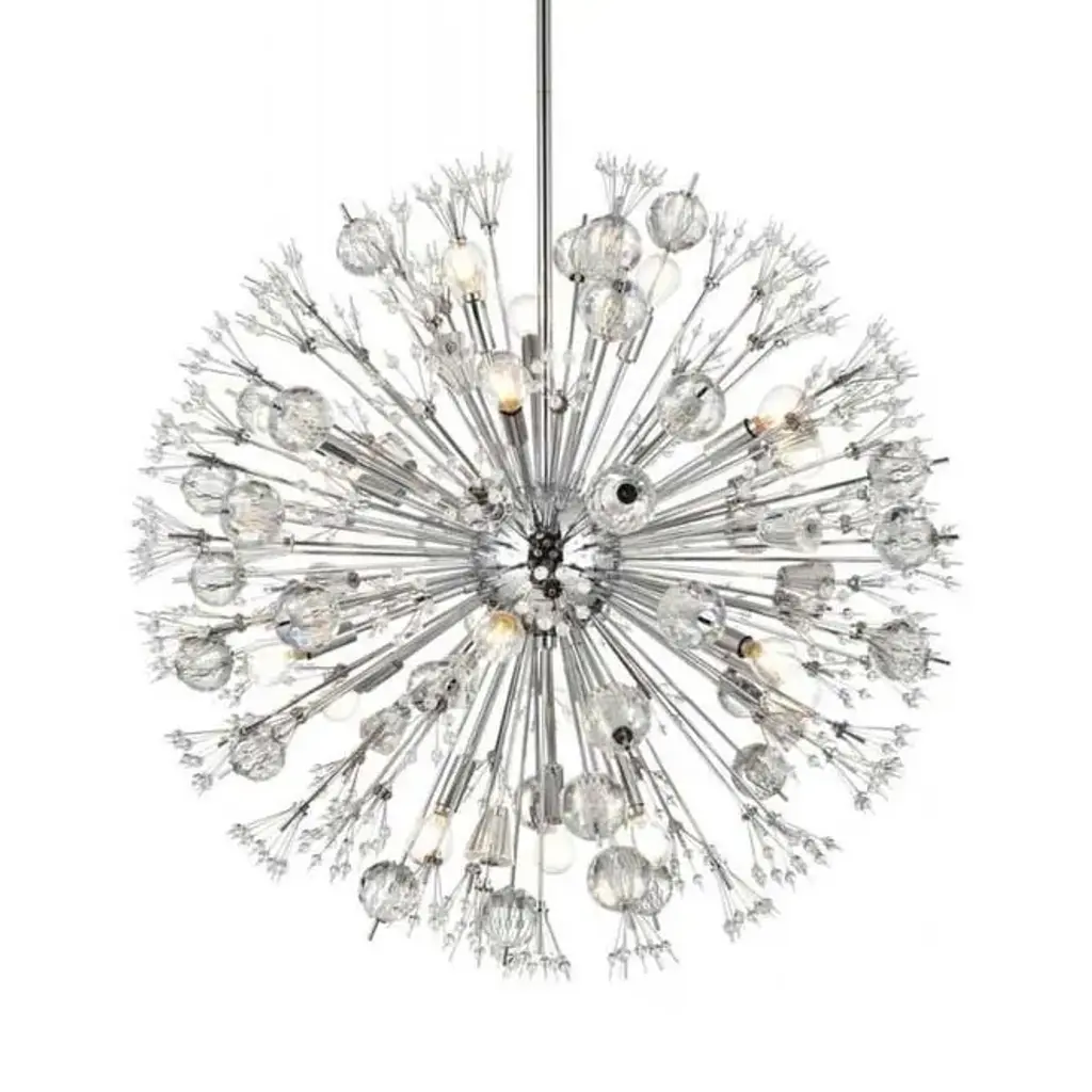 Like an explosion frozen in time, Vera collection hanging fixtures are suspended chaos. Clear large crystal balls and sprays of smaller crystals swirl amidst exposed candelabra bulbs (not included) balanced on dainty wires. A gleaming steel sphere forms the epicenter of the storm. A touch of savage beauty that easily compliments a kitchen, entryway, or bedroom. Sloped ceiling adaptable with a durable swivel could be mounted on vaulted or angled ceilingsFeatures:Dimensions:Electrical Specifications: