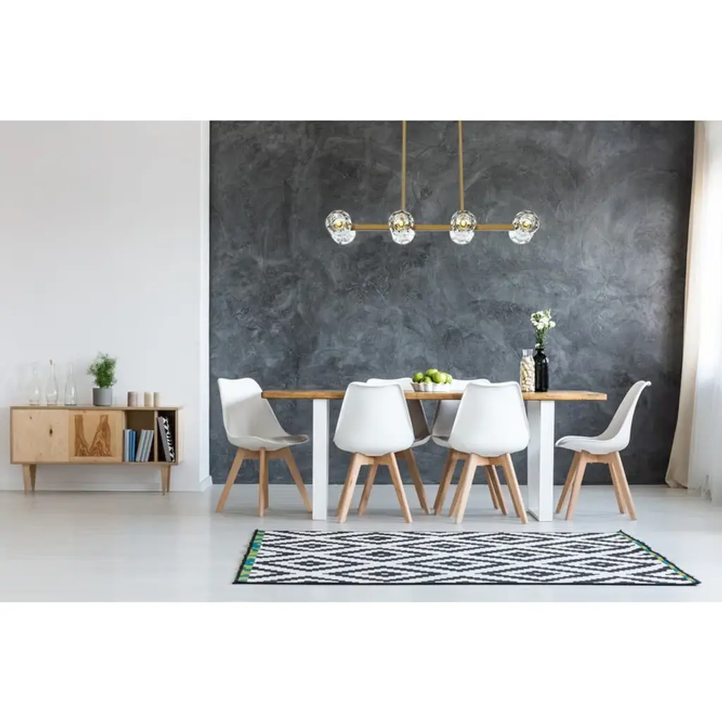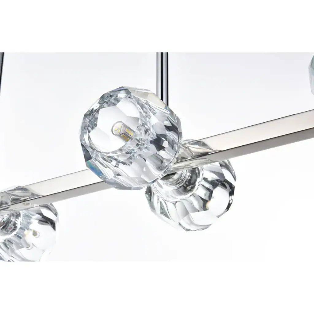 Presenting the Eren pendant light—a beacon of sophisticated elegance. Eight lights, adorned with faceted crystal glass shades, emit a luxurious and dazzling radiance, creating a timeless atmosphere of charm. Crafted with durability in mind, the robust iron base adds an industrial touch to the contemporary design. With two 46-inch rods for stability and a sleek modern aesthetic, the Eren pendant light offers a hassle-free setup. Illuminate your space with Eren, epitomizing style, durability, and radiant sophistication.Features:Dimensions:Electrical Specifications: