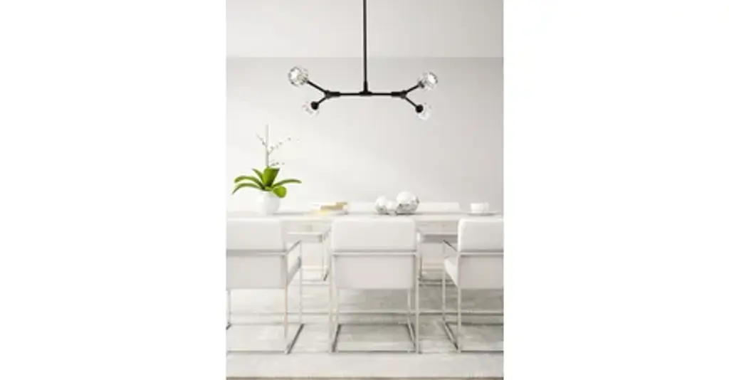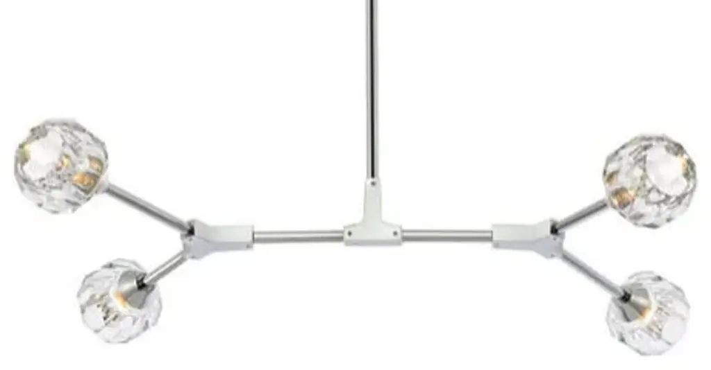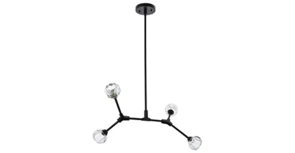 Crafted from iron metal and crystal, it features a round ceiling canopy, a hanging rod of 46 inch long, and arms extended with a solid K9 crystal ball from rods at all angles for a modern and linear look. Each 20W G9 bulb ( not included) is diffused by a faceted clear crystal ball giving the fixture a touch of industrial and glam inspiration. This work of art will add an artful focal point to your entryway, dining room, kitchen, or office. Evoking a sophisticated and timeless aesthetic to any space and will be an instant conversation started with its finely faceted crystal sphere which is polished by hand to reflect and refract light. Available in three different finishes in gold, chrome, and black. Features: Constructed from iron Comes with crystal shades Requires (4) G9 20 watt bulbs (not included) Includes a 46" downrod Capable of being dimmed Rated for installation in dry locations Title 20 and Title 24 compliant Covered by Elegant Lighting's 1 year limited manufacturer warranty Dimensions: Height: 4" Minimum Height: 12-1/2" Maximum Height: 52-1/2" Width: 21" Product Weight: 10 lbs Wire Length: 70" Cord Length: 70" Shade Height: 3" Shade Width: 3-5/8" Canopy Height: 1" Canopy Width: 6" Electrical Specifications: Max Wattage: 80 watts Number of Bulbs: 4 Watts Per Bulb: 20 watts Bulb Base: G9 Voltage: 110 volts Bulbs Included: No