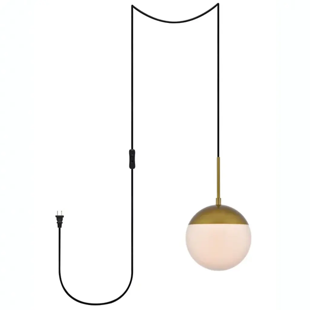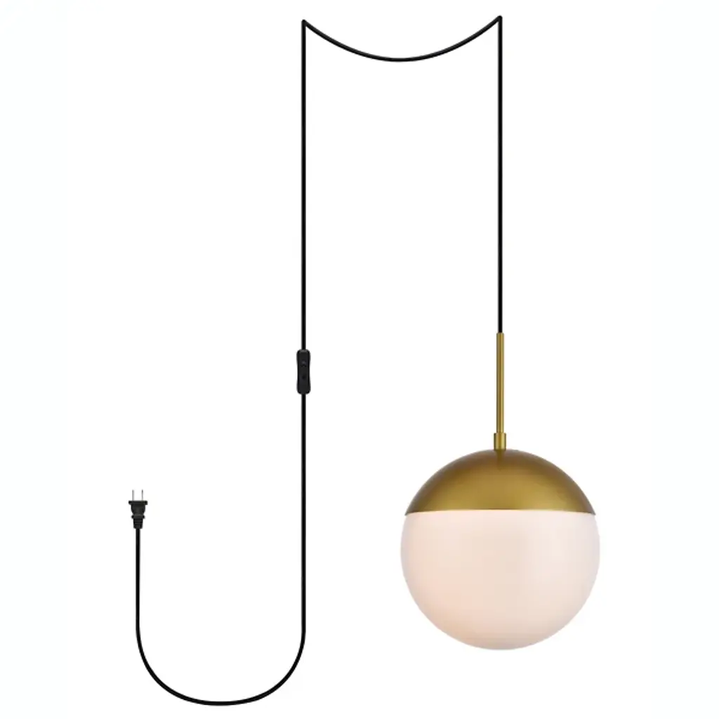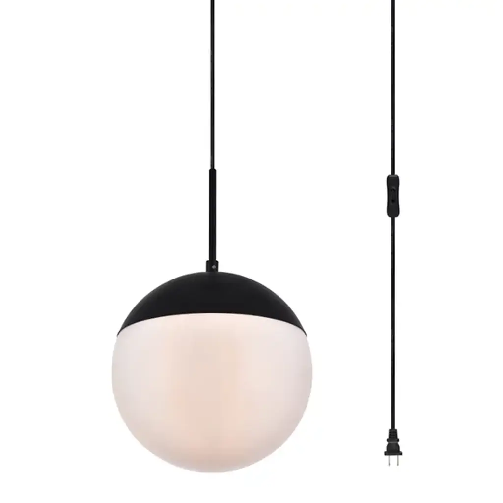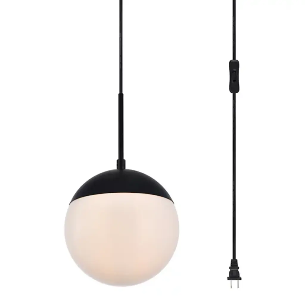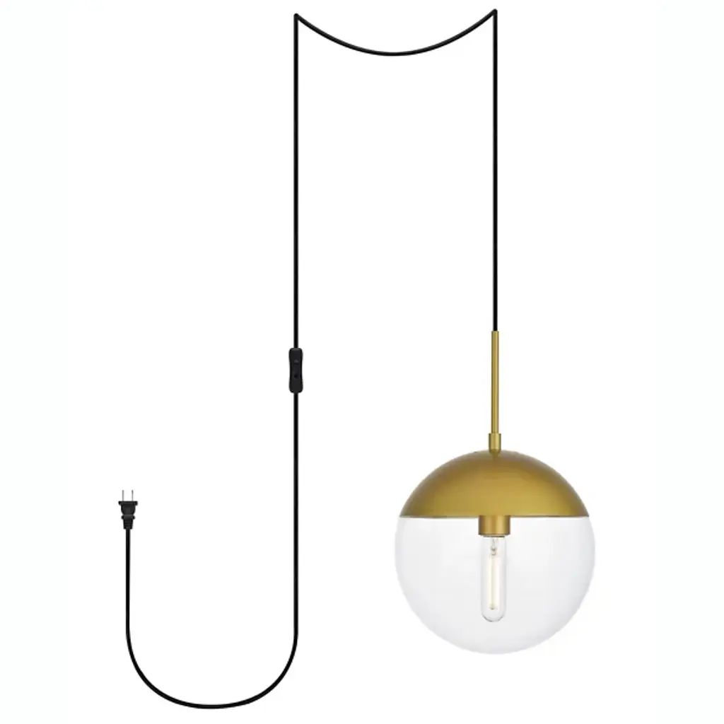 The Elenore Plug in Pendant from Huxe has mid-century modern charm and contemporary style. Elenore features a bowl-shaped metal framework that meets a refined glass shade, forming a globe that encapsulates a powerful LED. This minimalistic yet refined design creates a captivating light fixture. The clean lines and globe shape offer a timeless aesthetic, making it suitable for various settings. Secured by a downrod and a ceiling canopy, your pendant offers a beautiful glow.