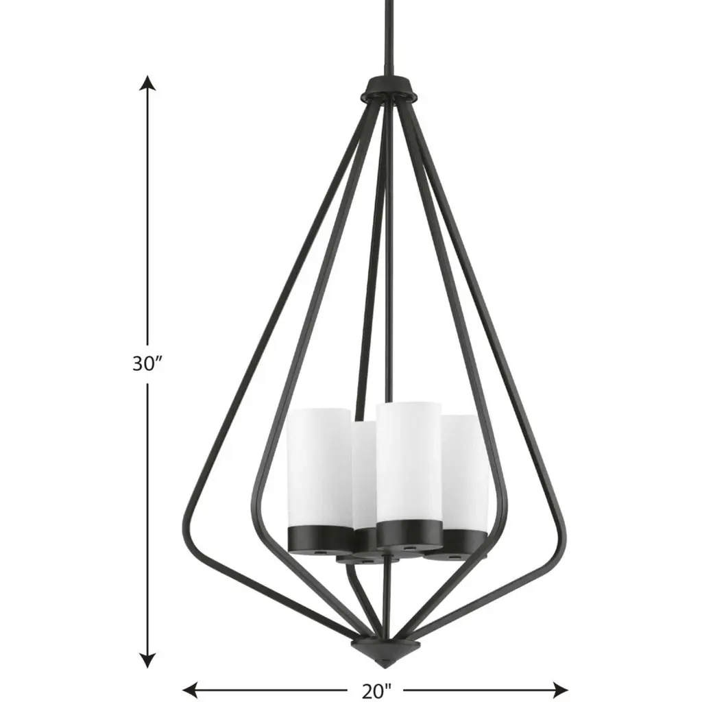 Achieve a sleek and modern look with the Elevate Collection 4-Light Matte Black Etched Glass Modern Pendant Hanging Light. An angular frame coated in a classic matte black finish that accentuates the design's modern aesthetic. The frame captures the crisp etched white glass cylindrical shades for elegant illumination.
