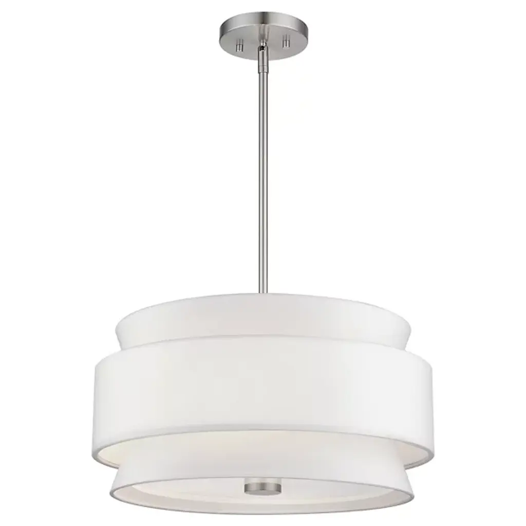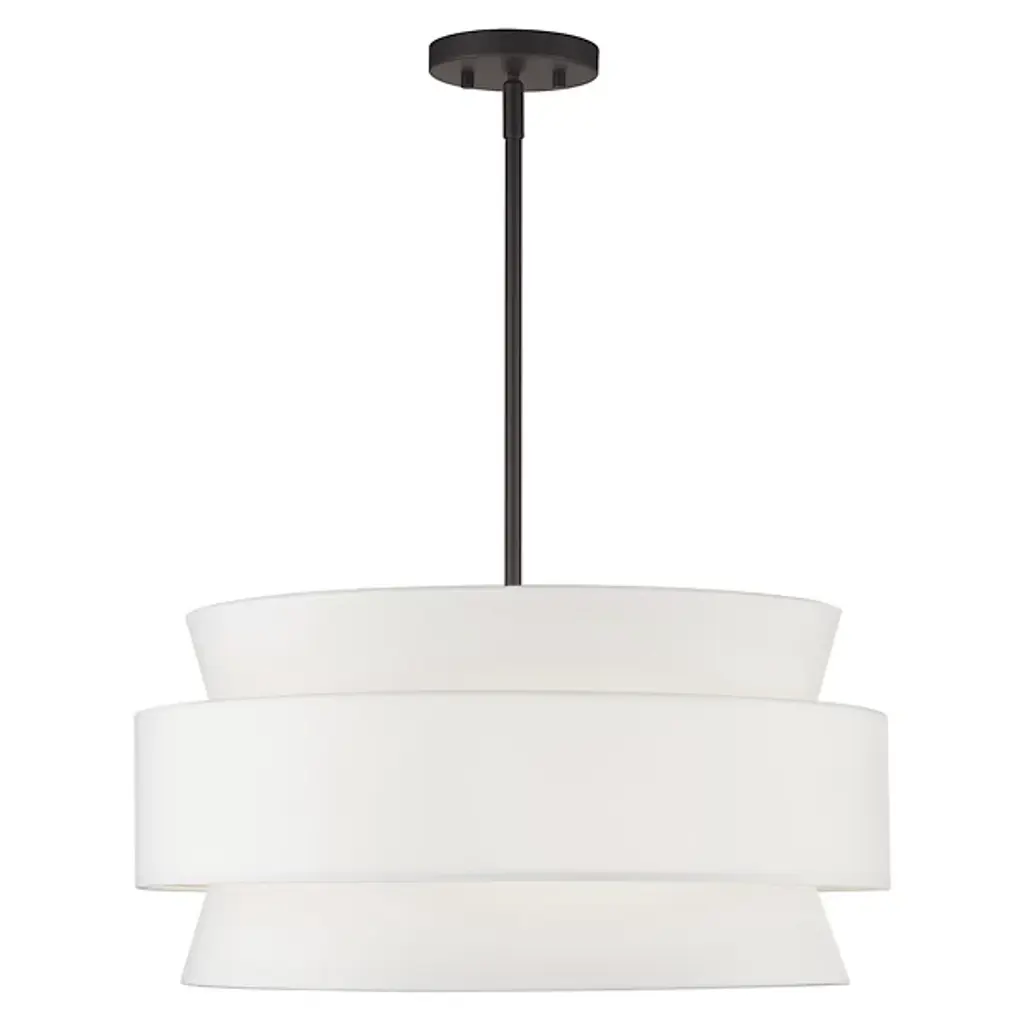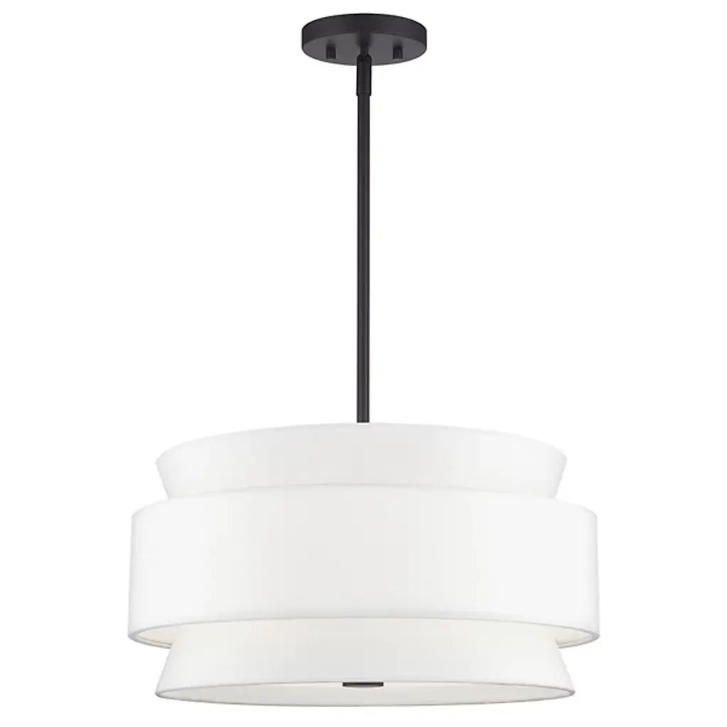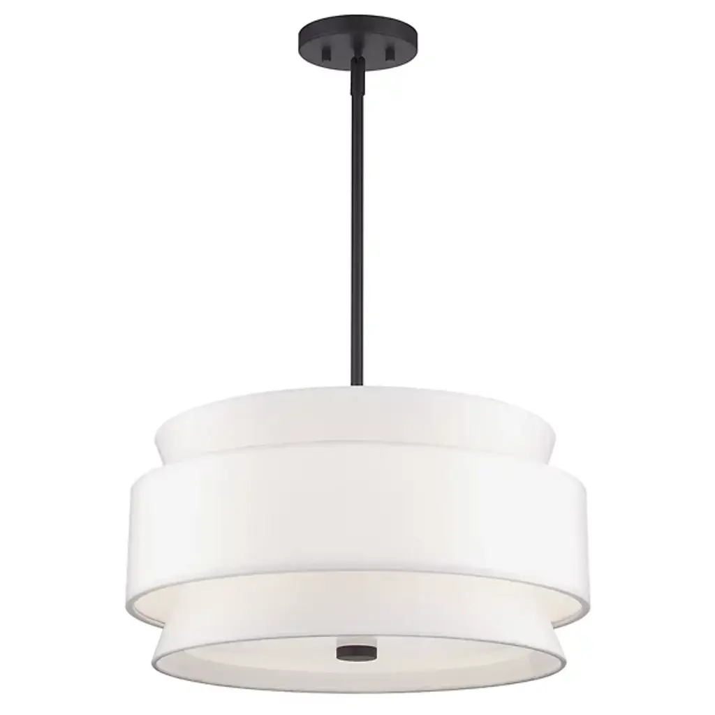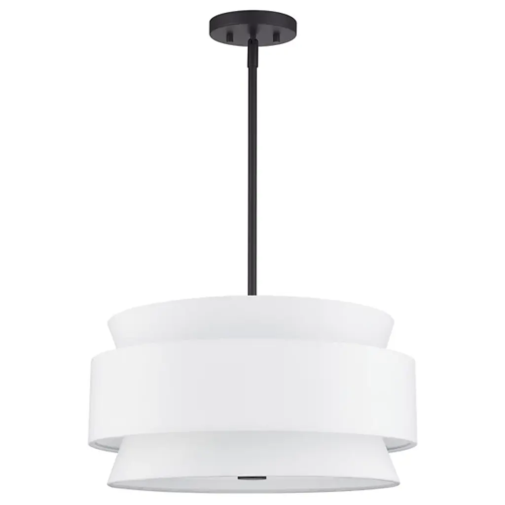 The Eliotte Pendant from Alder & Ore infuses transitional style into its environment with its angular and outswept double drum shade. Suspended from a circle canopy via a central stem, it features a handcrafted off-white fabric hardback shade paired with a satin white acrylic diffuser; this pendant provides gentle, diffused light. Its sturdy steel construction combines enduring elegance with modern sophistication, creating a striking focal point that enhances any space with its warm and inviting glow.