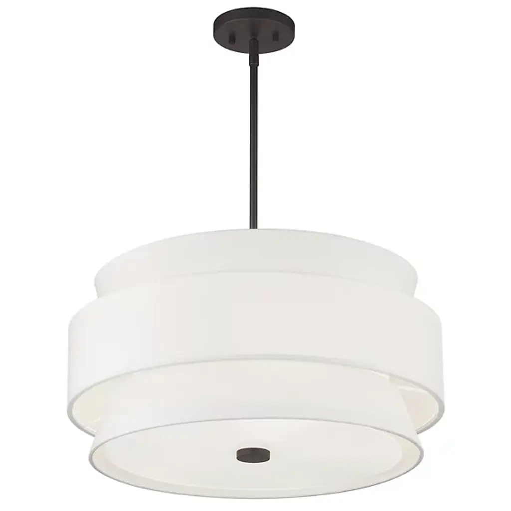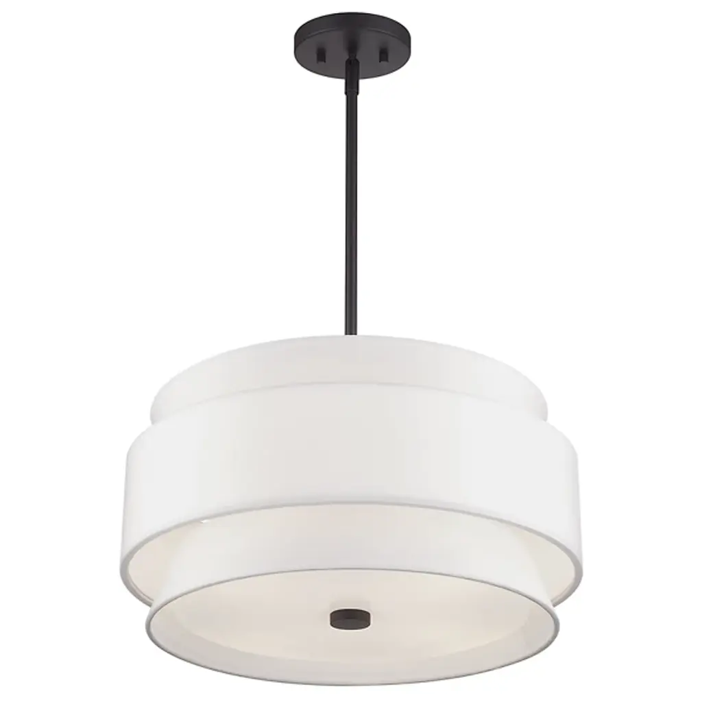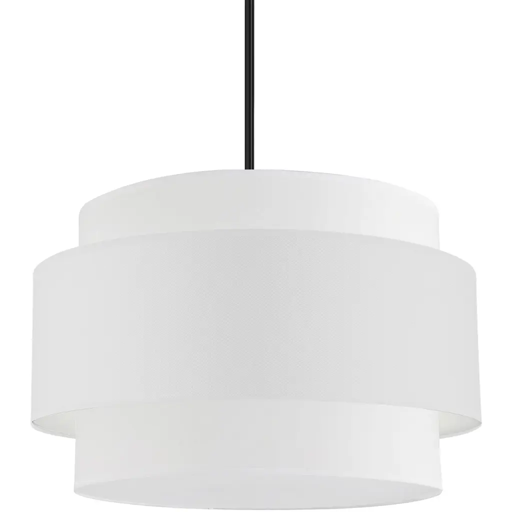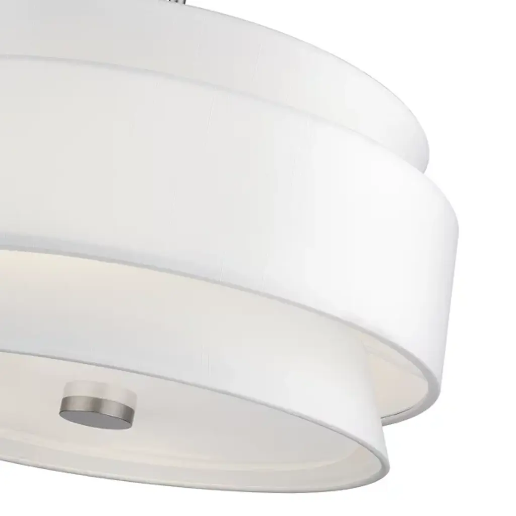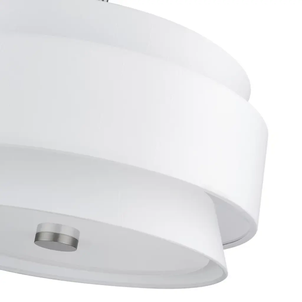 The Eliotte Pendant from Alder & Ore infuses transitional style into its environment with its angular and outswept double drum shade. Suspended from a circle canopy via a central stem, it features a handcrafted off-white fabric hardback shade paired with a satin white acrylic diffuser; this pendant provides gentle, diffused light. Its sturdy steel construction combines enduring elegance with modern sophistication, creating a striking focal point that enhances any space with its warm and inviting glow.