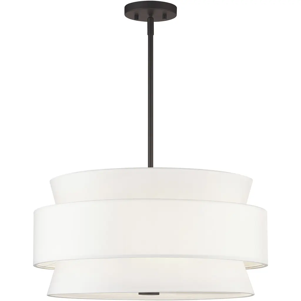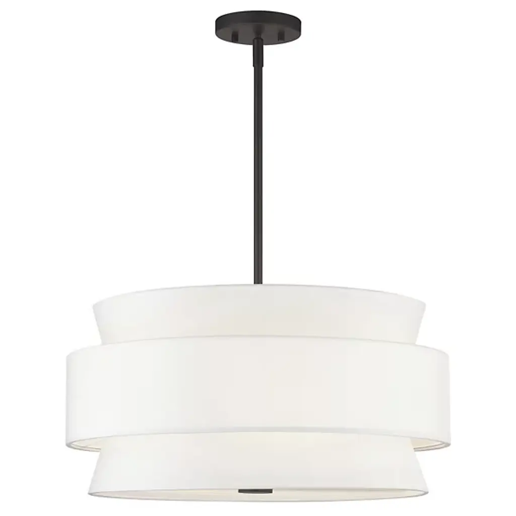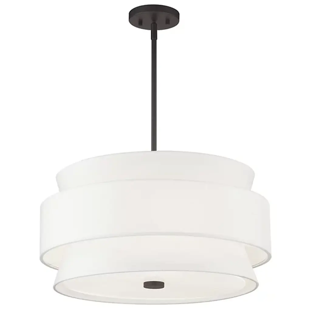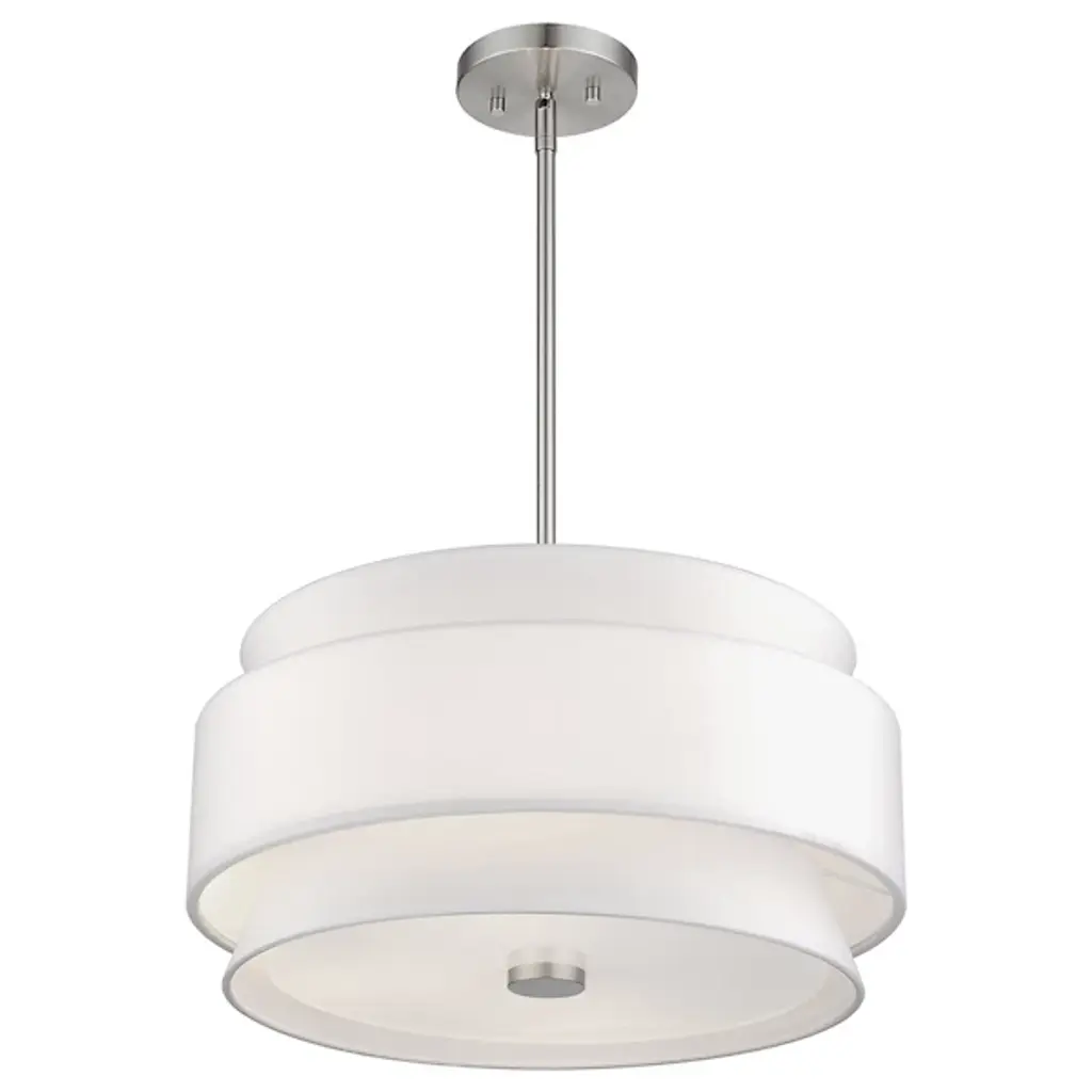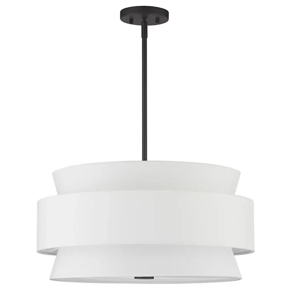 The Eliotte Pendant from Alder & Ore infuses transitional style into its environment with its angular and outswept double drum shade. Suspended from a circle canopy via a central stem, it features a handcrafted off-white fabric hardback shade paired with a satin white acrylic diffuser; this pendant provides gentle, diffused light. Its sturdy steel construction combines enduring elegance with modern sophistication, creating a striking focal point that enhances any space with its warm and inviting glow.