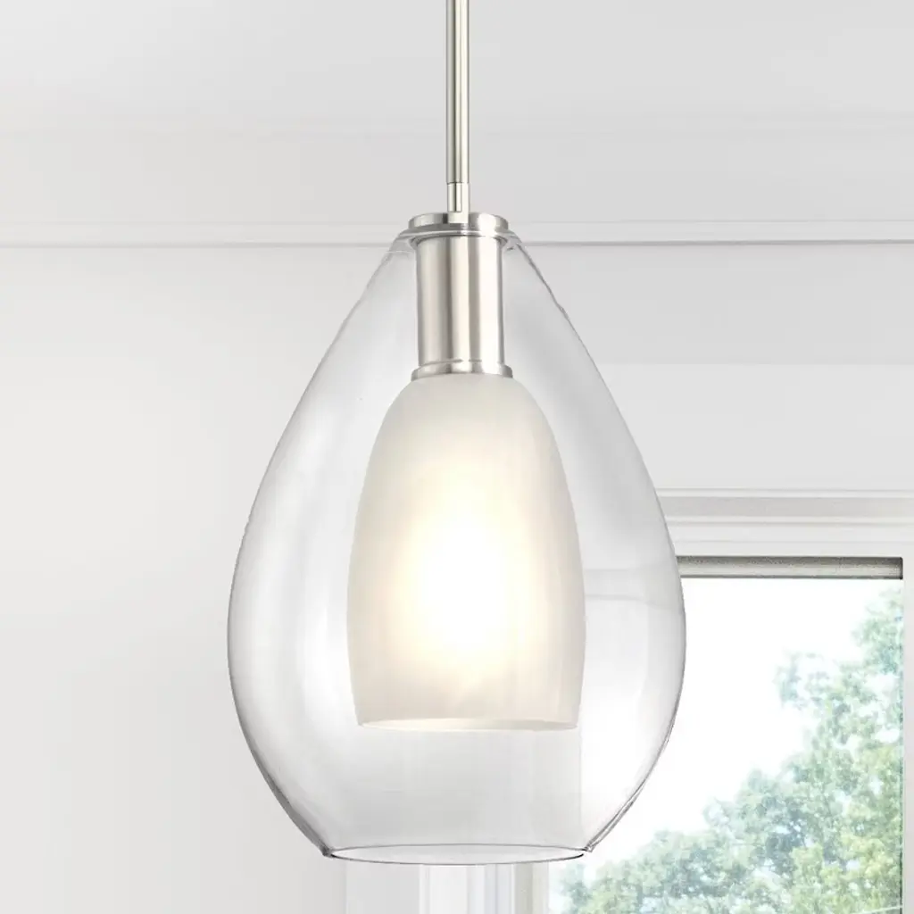 The distinctive Elle 11 Pendant is composed of an outer tear-drop trans gray glass shade, complemented perfectly with a blown opal glass sphere. The inner opal conceals the light source, while both diffusing and directing downward the output the the light source. The pleasing play of light and dimension through the Elle makes for asoothing optical affect. The cord pendant fixture is equipped with a 10' SVT cordset and an low profile flat monopoint canopy. These stylish and functional luminaries are offered in a beautiful brushed Bronze finish.