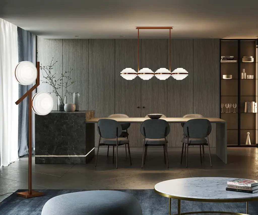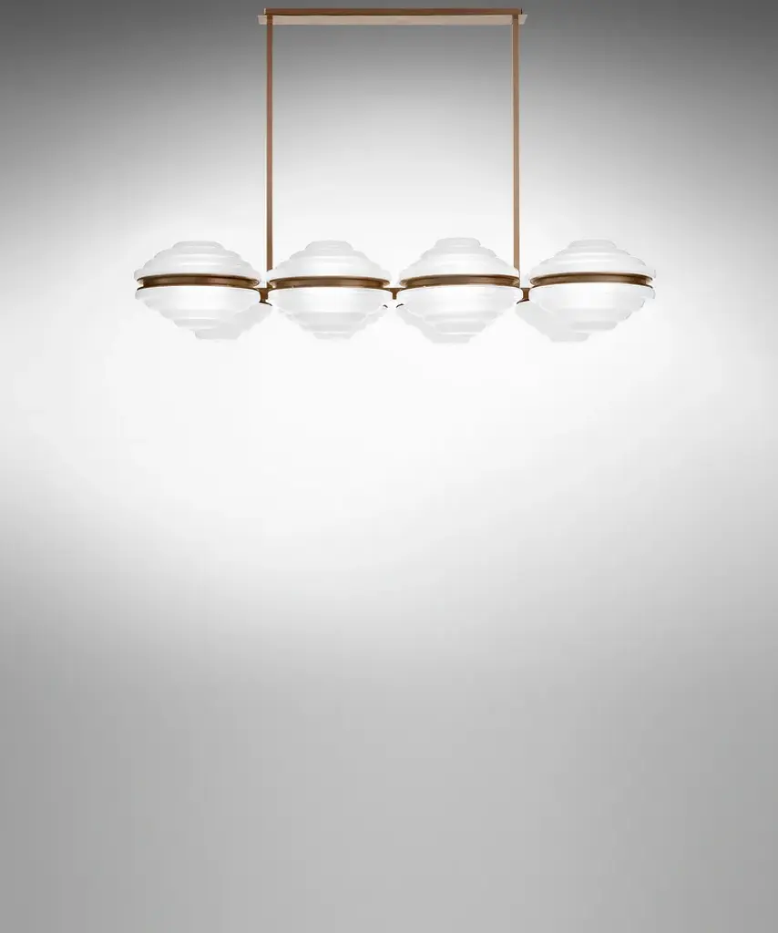 Ellepi is a Pendant in metal with bronze finish and blown satin glass diffusers. FINISHES: Satin/BRZ/CLED bulbs:6xE14IP20INDOORON REQUEST DIMMABLE WITH: TRIACCERTIFICATION: CE/EAC/CULUSWEIGHT: 43KGELLEPI lends itself to an horizontal development with a modern style but with a vintage touch. The elegant bronze finish, illuminated by white satin glass diffusers, gives character and harmony to this suspension.