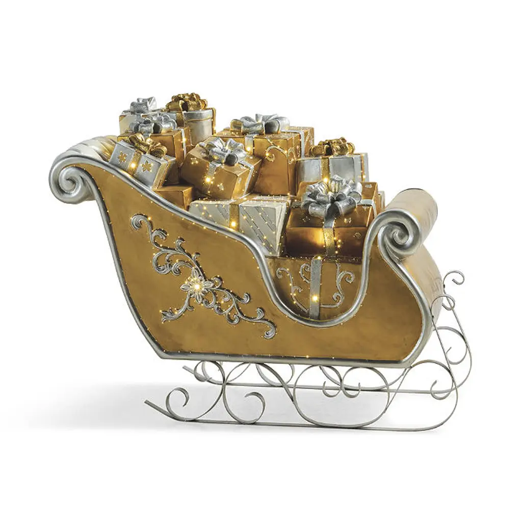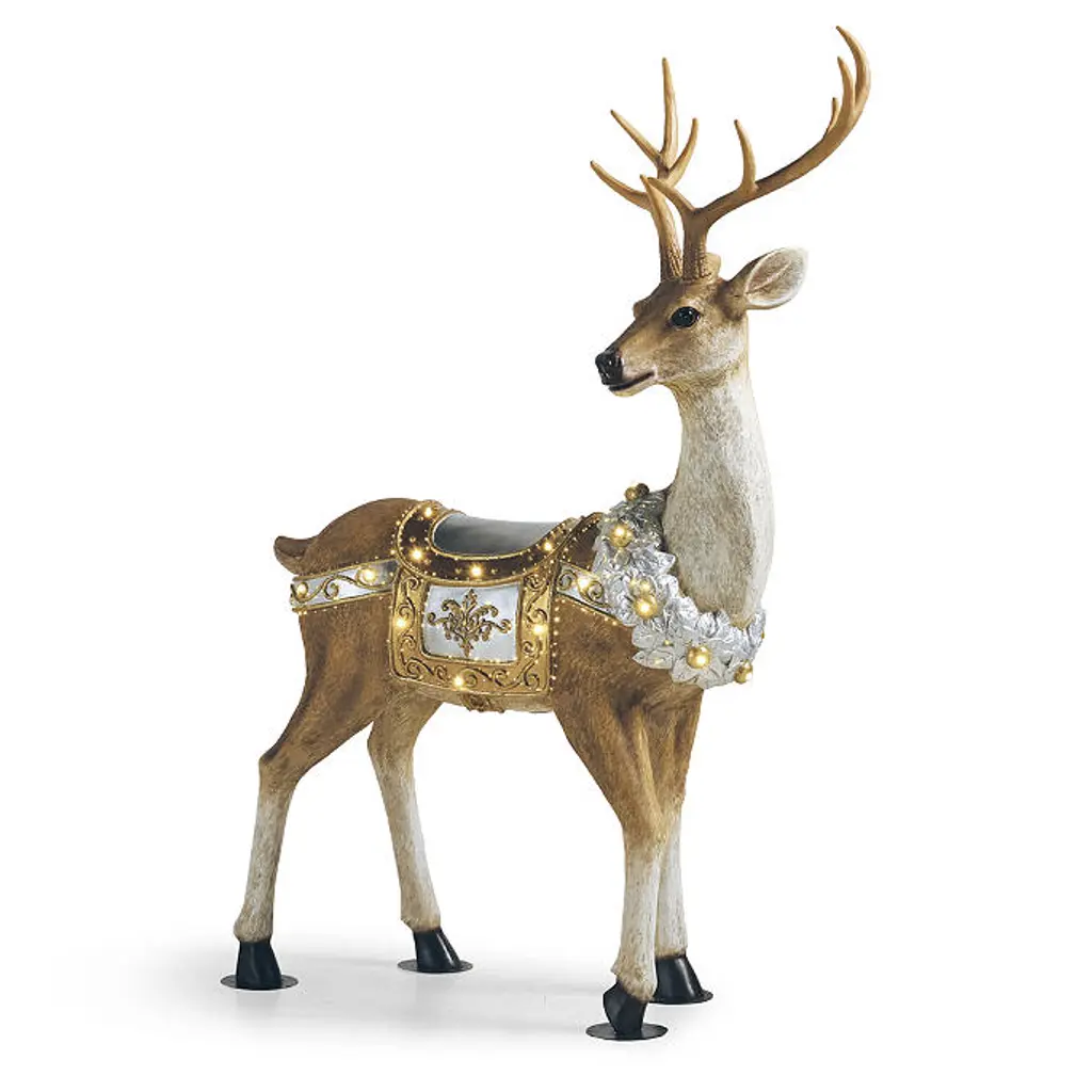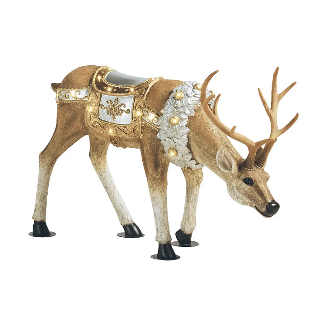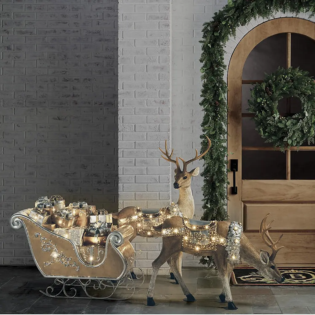 With realistic detail, festive attire and all-weather construction, our Ellesmere Metallic Deer are a beautiful accent for your front porch or snow-covered lawn. The handpainted, nonfading metallic finish is illuminated by 450 pinpoint fiber optic color-changing lights and 30 warm white LED lights. Durable all-weather resin with nonfading metallic paints Handpainted 450 pinpoint fiber optic color-changing lights and 30 warm white LED lights On/off timer function To activate, press the timer button at the time you wish lights to come on; lights will have 8 hours on and 16 hours off and repeat the cycle 6 ft. green cord Includes adapter, plastic yard stake and resin plate to cover on/off switch For indoor or outdoor use Assembly Instructions for LED Ellesmere Metallic Feeding Deer Assembly Instructions for LED Ellesmere Metallic Standing Deer Assembly Instructions for LED Ellesmere Metallic Sleigh with Toys Imported A Frontgate exclusive. At Frontgate, our primary focus is quality. We guarantee that every product we sell will stand up to the supreme test – our customers' satisfaction. To learn more about our policies, visit our Shipping & Processing, Returns & Exchanges and Warranty & Price Guarantee pages.