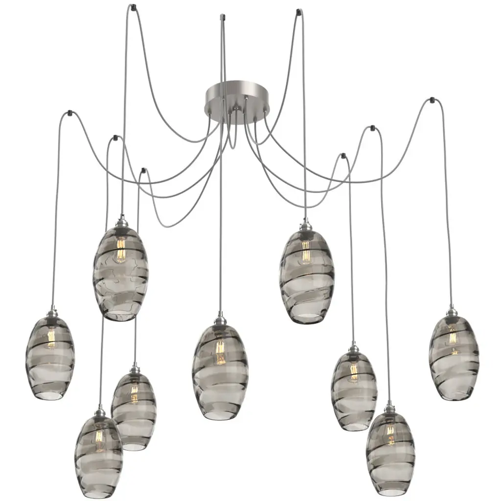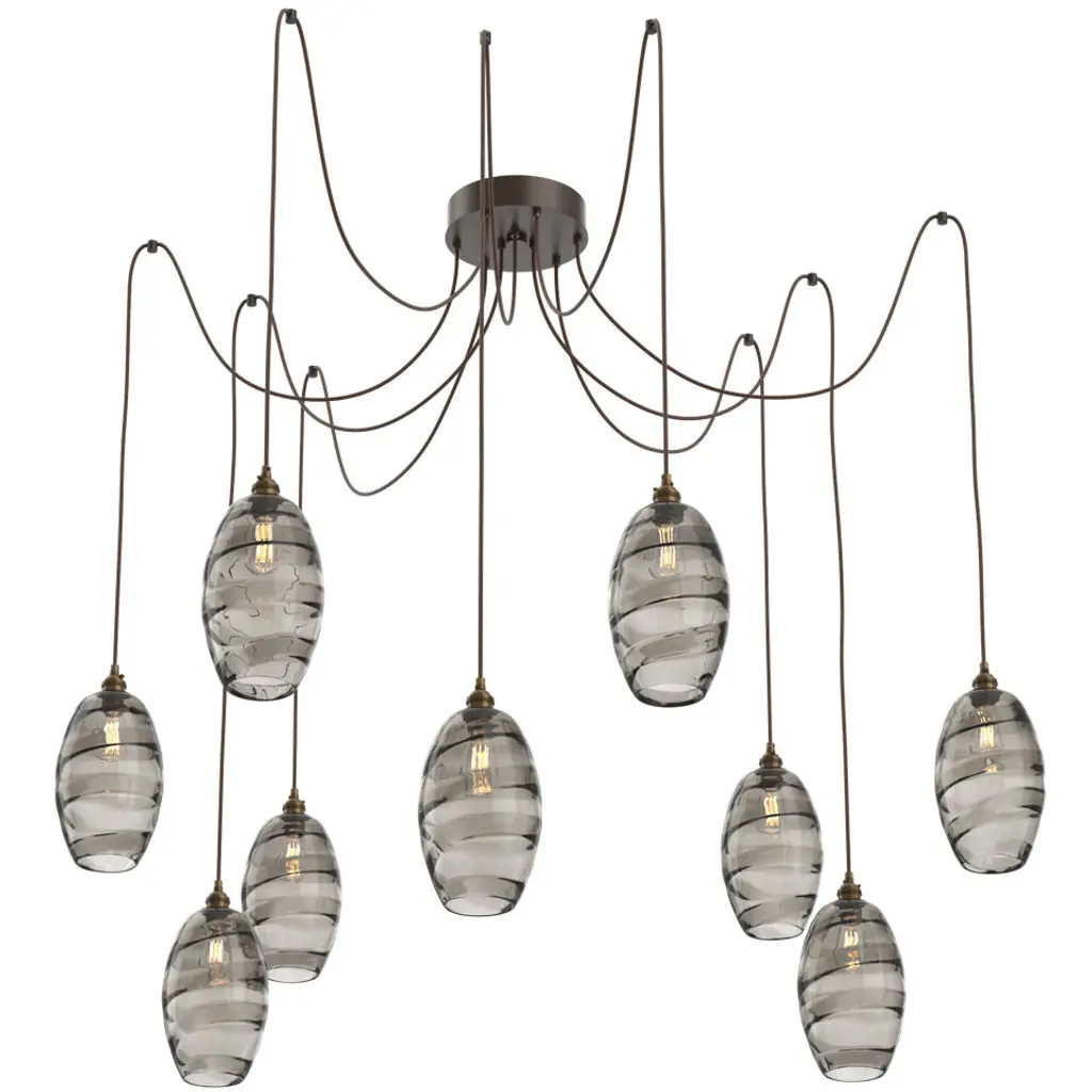 Featuring our popular artisan blown Ellisse pendants, this versatile chandelier style enables customization of the placement and height of each pendant. A ribbon of molten crystal glass added during fabrication creates a magical dance of light and color when paired with clear or vintage bulbs. Choose from several glass colors and finishes.