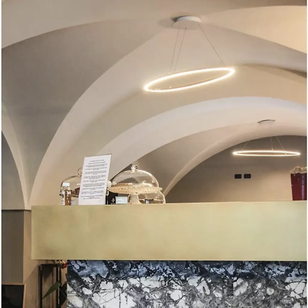 The Ellisse LED Minor Pendant from Nemo is an ellipse-shaped structure that is able to create diffused down or indirect uplight. The ring is composed of Aluminum, and is lined with an opal diffuser to soften the array of light. The suspension style can also be altered to lower the Ellisse from the ceiling at an angle or with a flat horizontal style.